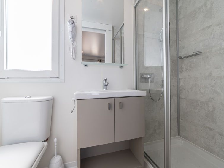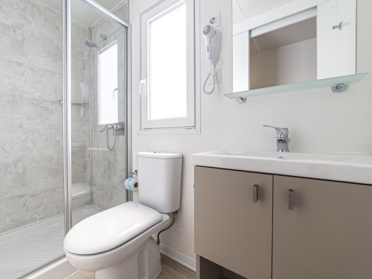 "Baia Revolution", 4-room mobile home 34 m2. Modern furnishings: living/dining room with dining table and satellite TV. Exit to the terrace. 1 room with 1 french bed (140 cm), shower/WC. 1 room with 2 beds (70 cm). 1 room with 1 x 2 bunk beds (70 cm). Kitchenette (4 gas rings, freezer).