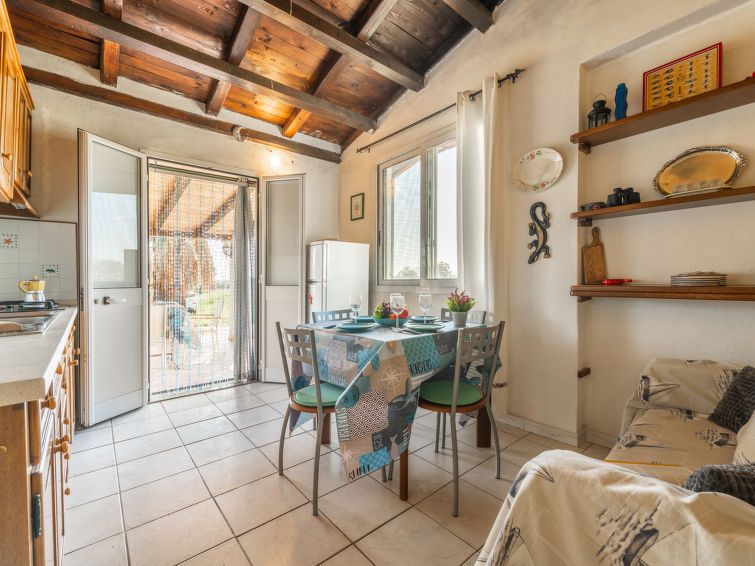 "Sa Frontera", 3-room house 65 m2. Comfortable and cosy furnishings: living/dining room with TV. 2 double bedrooms, each room with air conditioning. Kitchen (4 gas rings, kettle, microwave) with dining table. Exit to the veranda. Shower/bidet/WC. Air-conditioning, forced-air heating.