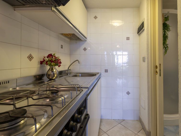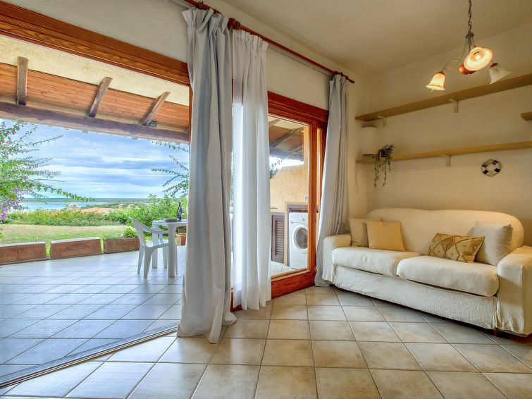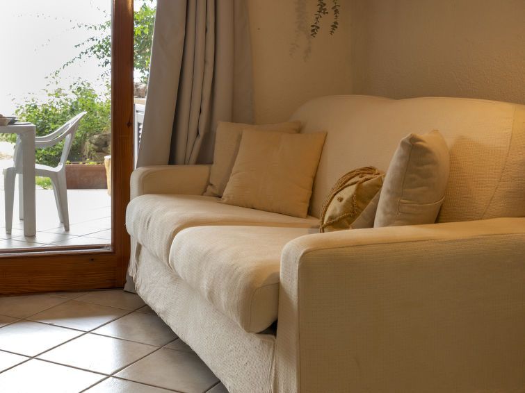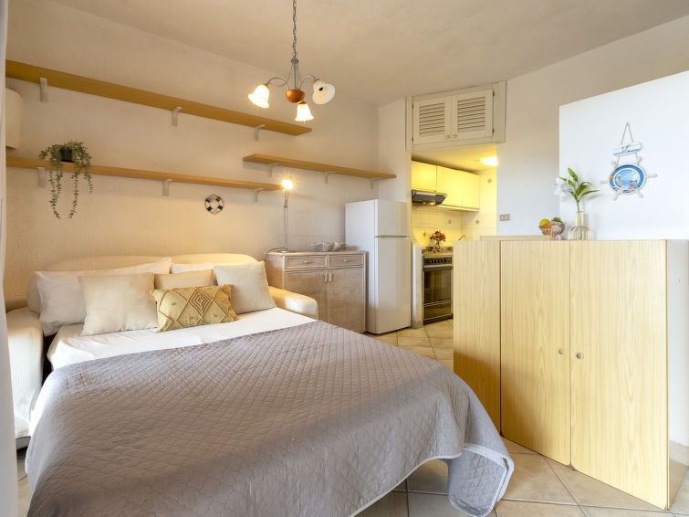 "0/5/F - Marineledda", 1-room apartment on the ground floor. Simple and cosy furnishings: living/dining room with 1 sofabed, TV and air conditioning. Exit to the terrace. Open walk-through room with 1 x 2 bunk beds. Kitchenette (oven, 3 gas rings, kettle). Shower/bidet/WC. Air-conditioning, forced-air heating.