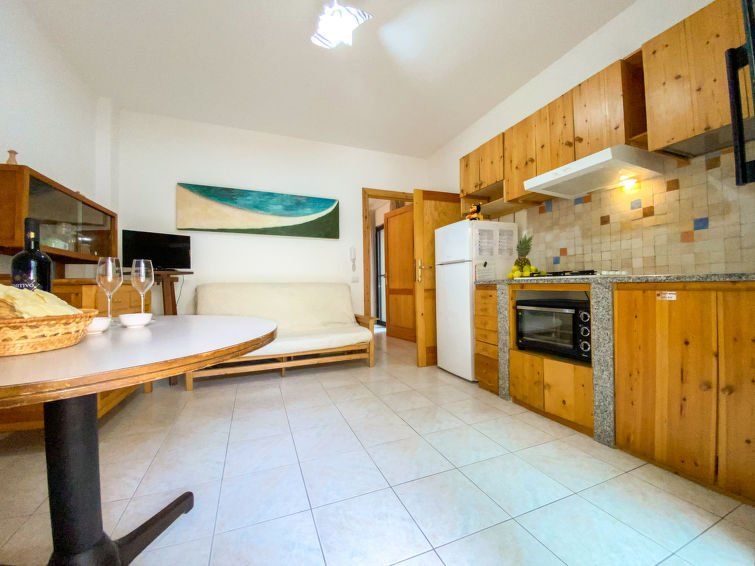 "Green House", 2-room apartment 45 m2, on the ground floor. Simple and cosy furnishings: living/dining room with sliding door with 1 double sofabed (140 cm, length 190 cm), dining table and TV. Exit to the garden. 1 double bedroom. Exit to the terrace. Kitchenette (oven, 4 gas rings, freezer).