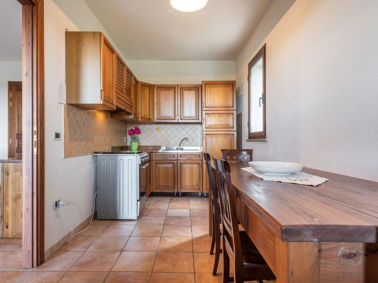 4-room house 90 m2 on 1st floor. Practical furnishings: living/dining room with open-hearth fireplace (only for decoration), dining table and TV. 2 rooms, each room with 1 bed and 1 double bed. 1 room with 2 beds. Kitchen-/living room (4 hot plates, oven, freezer) with dining table.