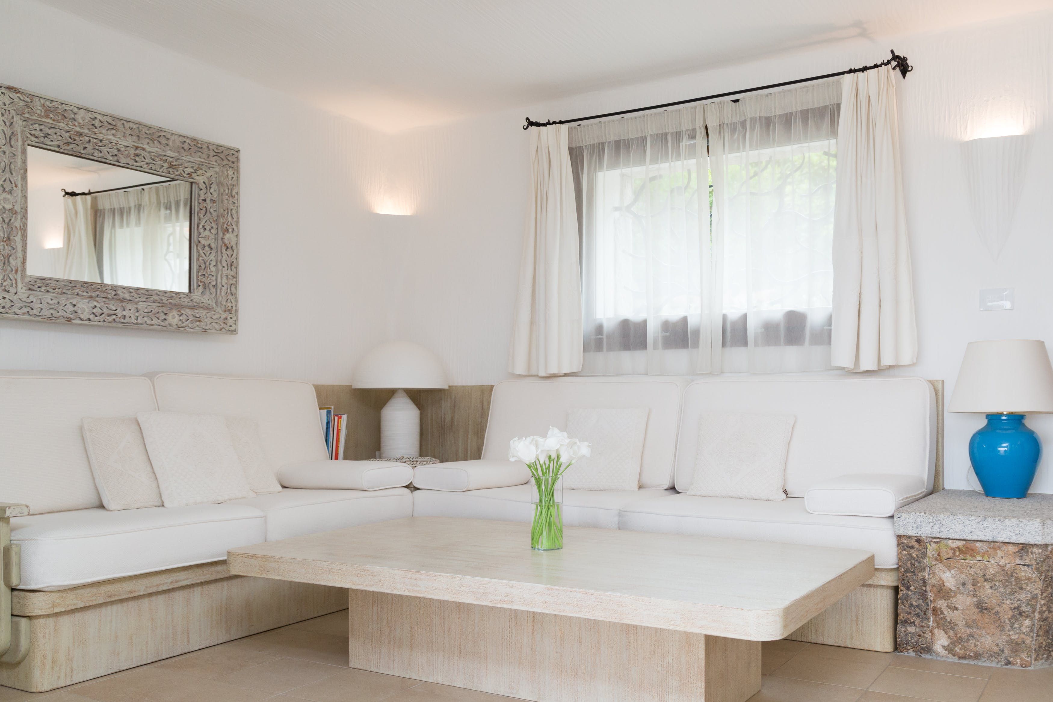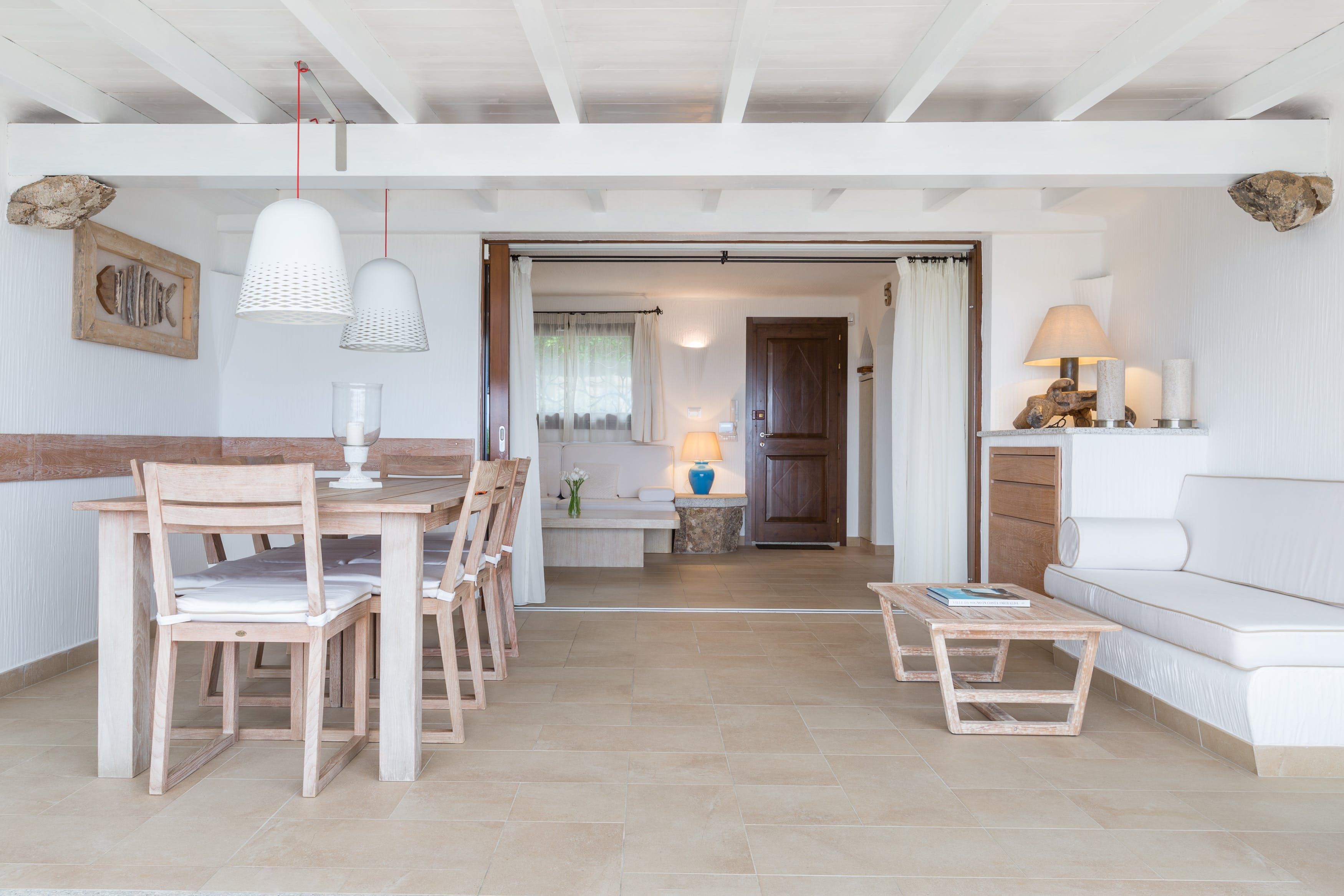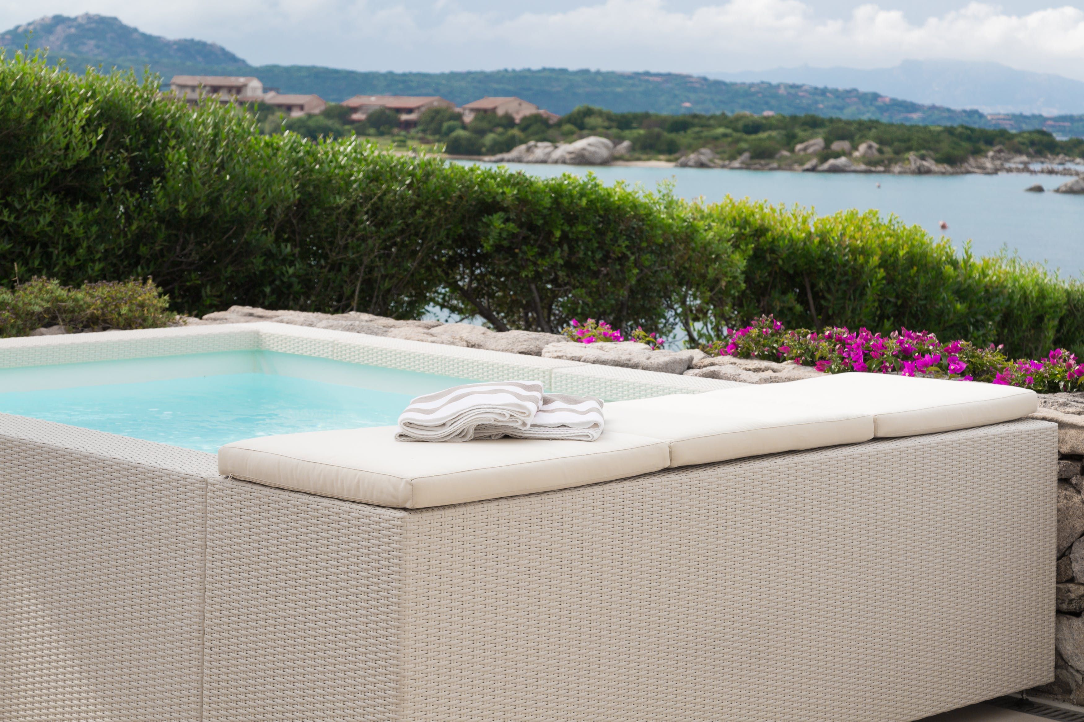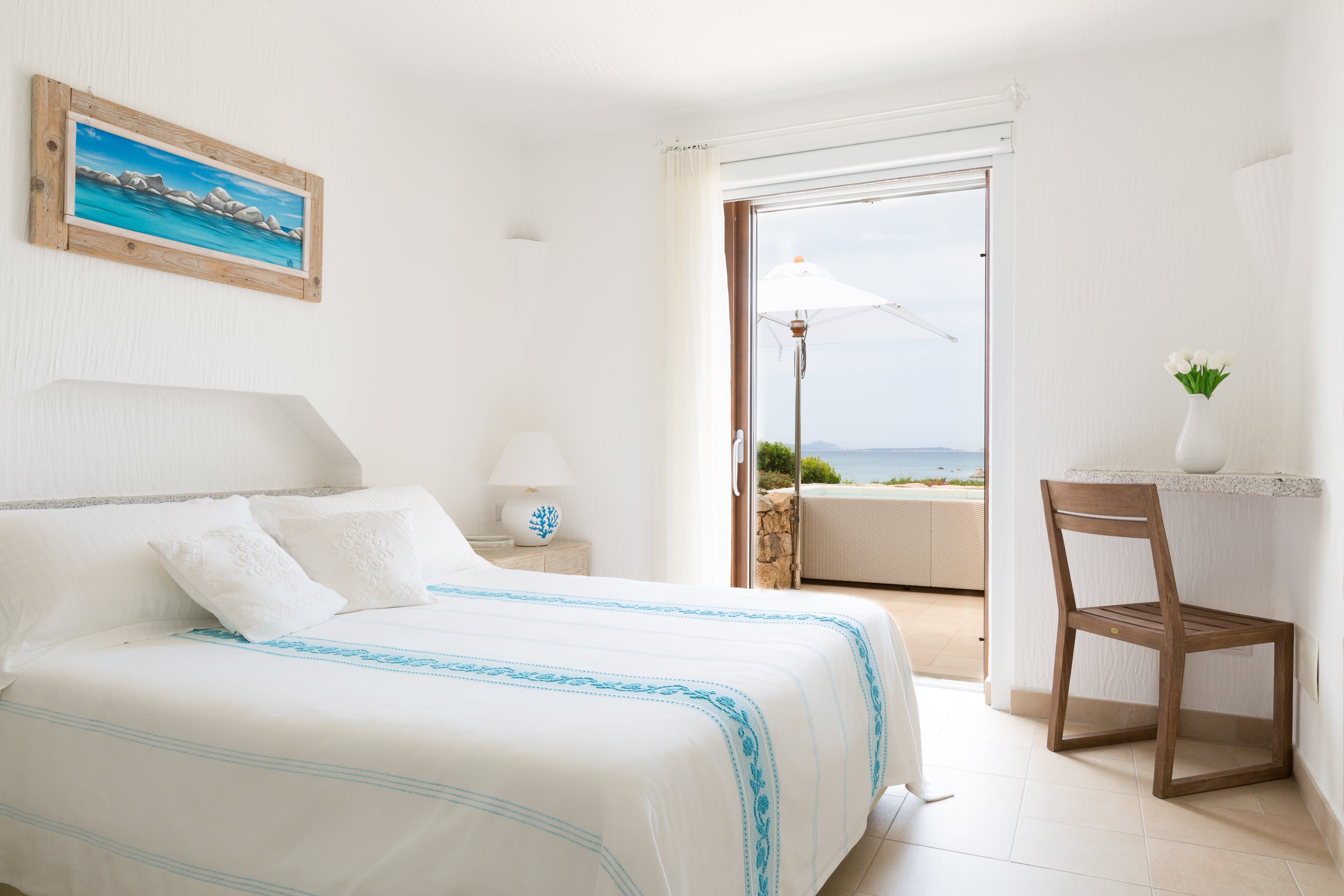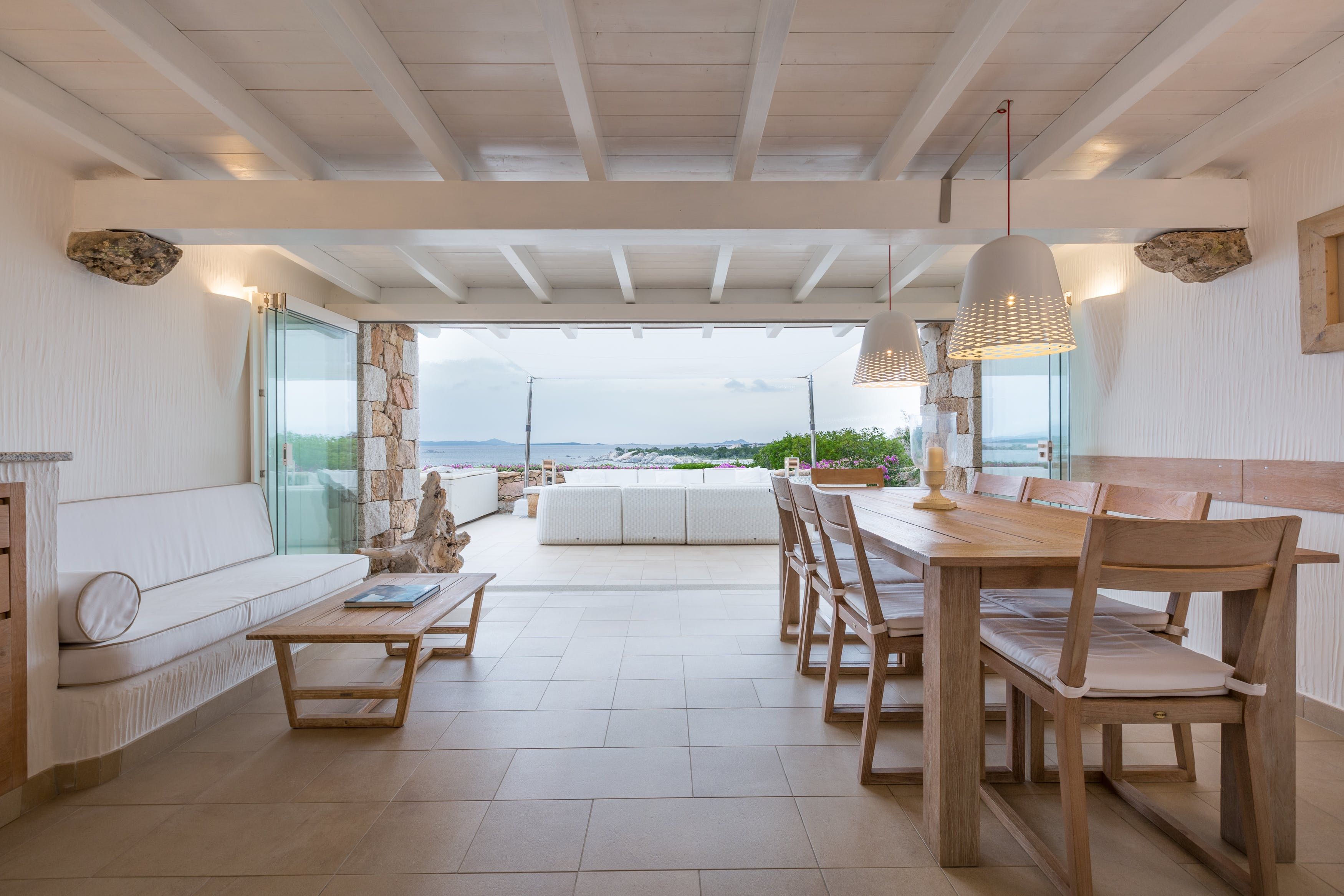 The villa is sunny and tranquil, with a soft colour palette that allows the view to take centre stage. The patio doors retract, merging the indoor and outdoor spaces to create that wonderful island feel. Enjoy breakfast while gazing out at the panoramic view of the bay, before taking your coffee out to one of the comfortable sofas on the terrace. Will you lie out in the sun all day, explore the area, or perhaps make the most of having your own little beach?
