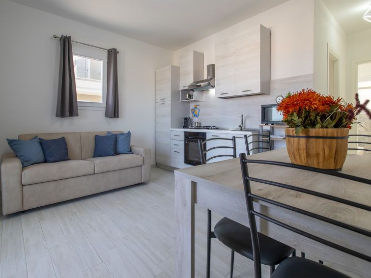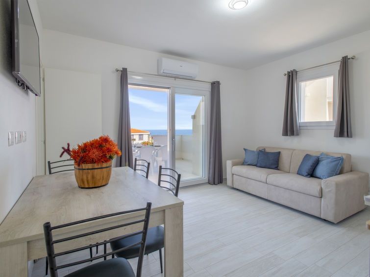 "Acqua Marina", 3-room apartment 60 m2 on 1st floor. Comfortable and modern furnishings: living/dining room with 1 double sofabed and TV (flat screen). Exit to the terrace. 1 double bedroom. 1 room with 1 bed. Exit to the terrace. Kitchenette (4 hot plates, oven, toaster, kettle, microwave, freezer).