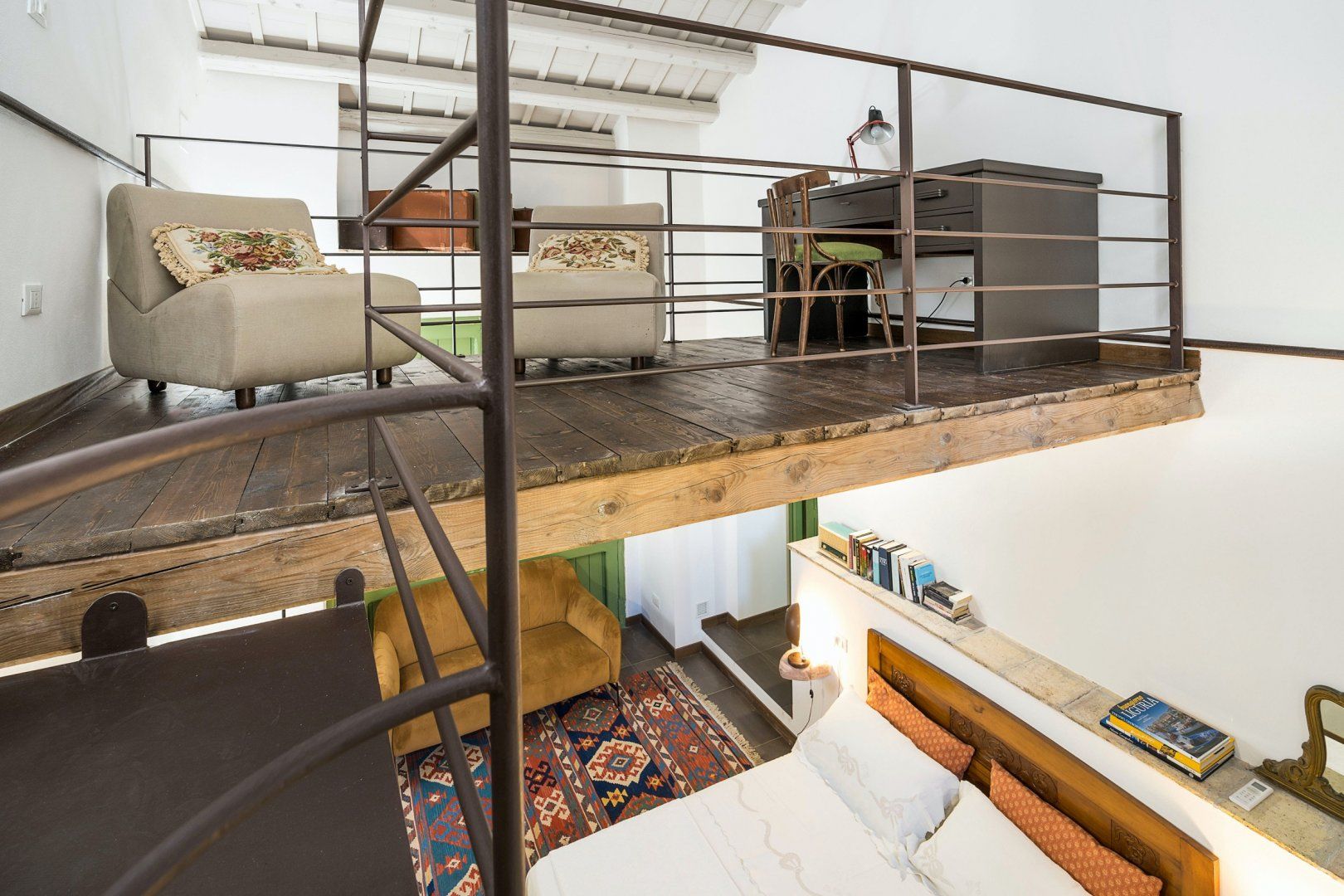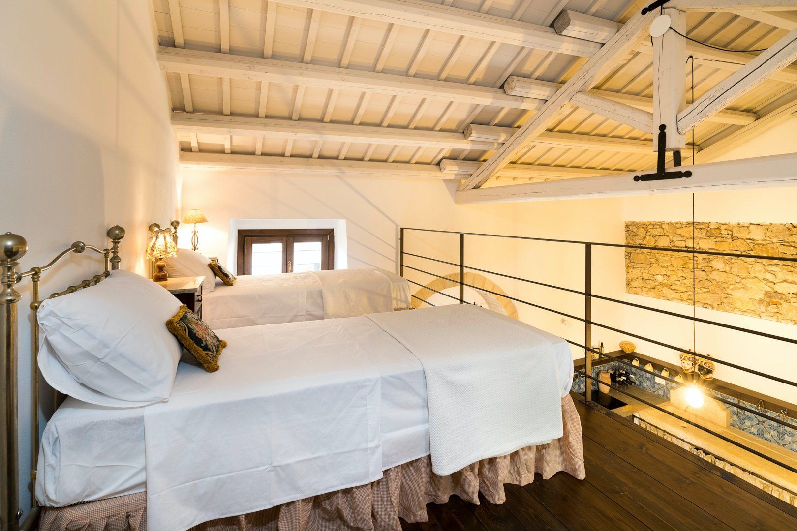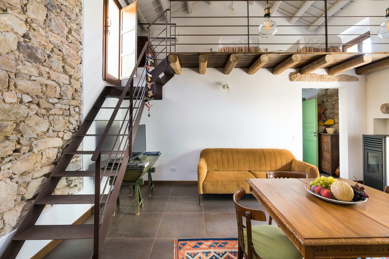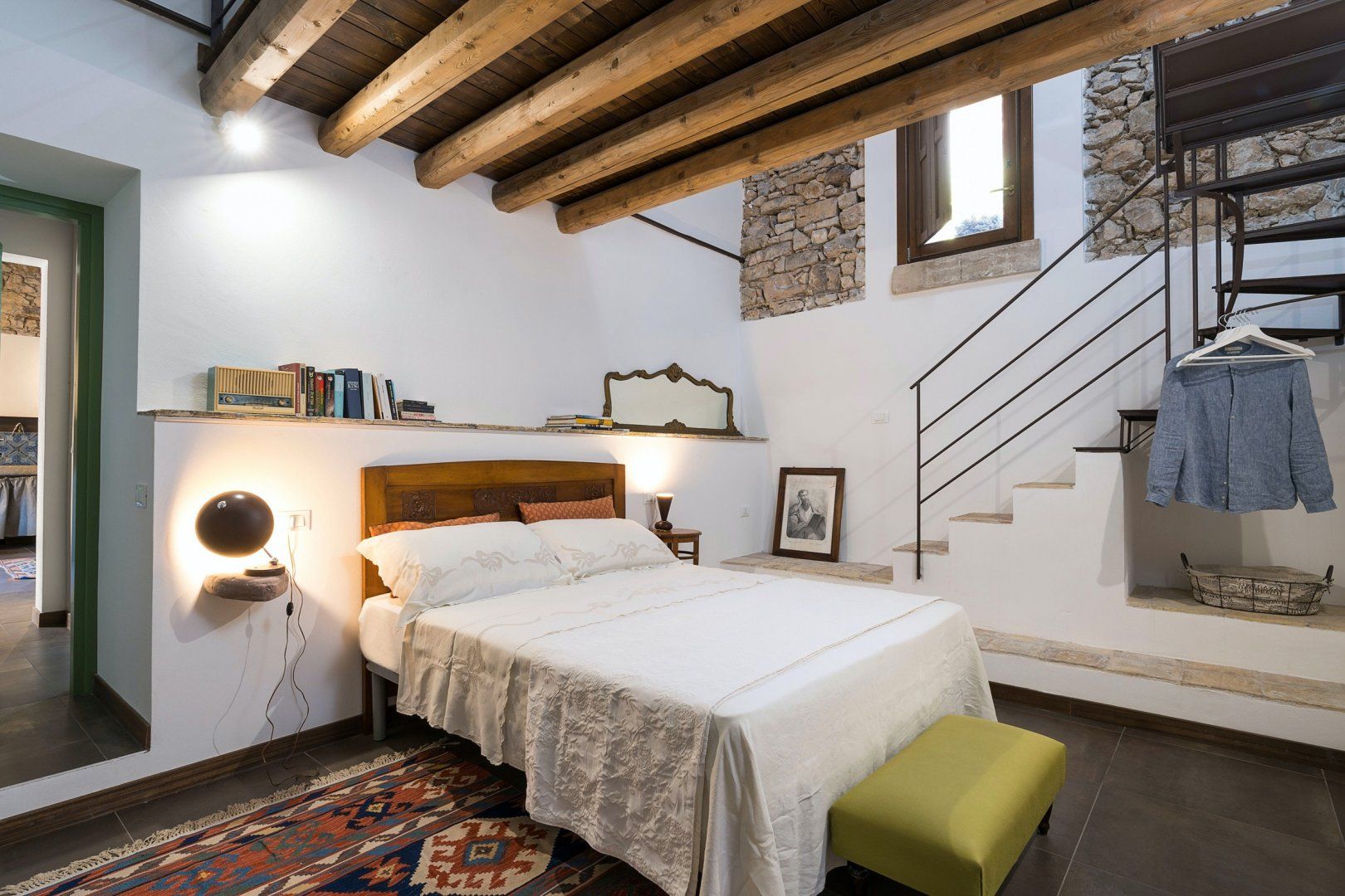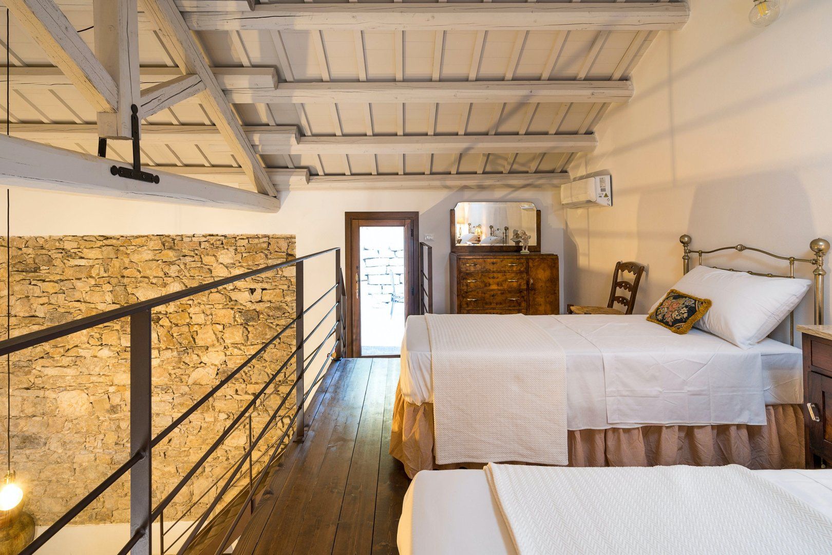 Up the steps, you'll reach the mezzanine that serves as a second bedroom. But you'll also find the door that leads out to what's arguably the shining gem of this home, the terrace. We love its rustic walls of ancient stone, that promise complete privacy. And the cherry on top is your sparkling shared pool, complete with sun loungers and beach chairs. Relax while you look out at the view, taking all-important dips to escape the heat, and sipping on an afternoon glass of wine.