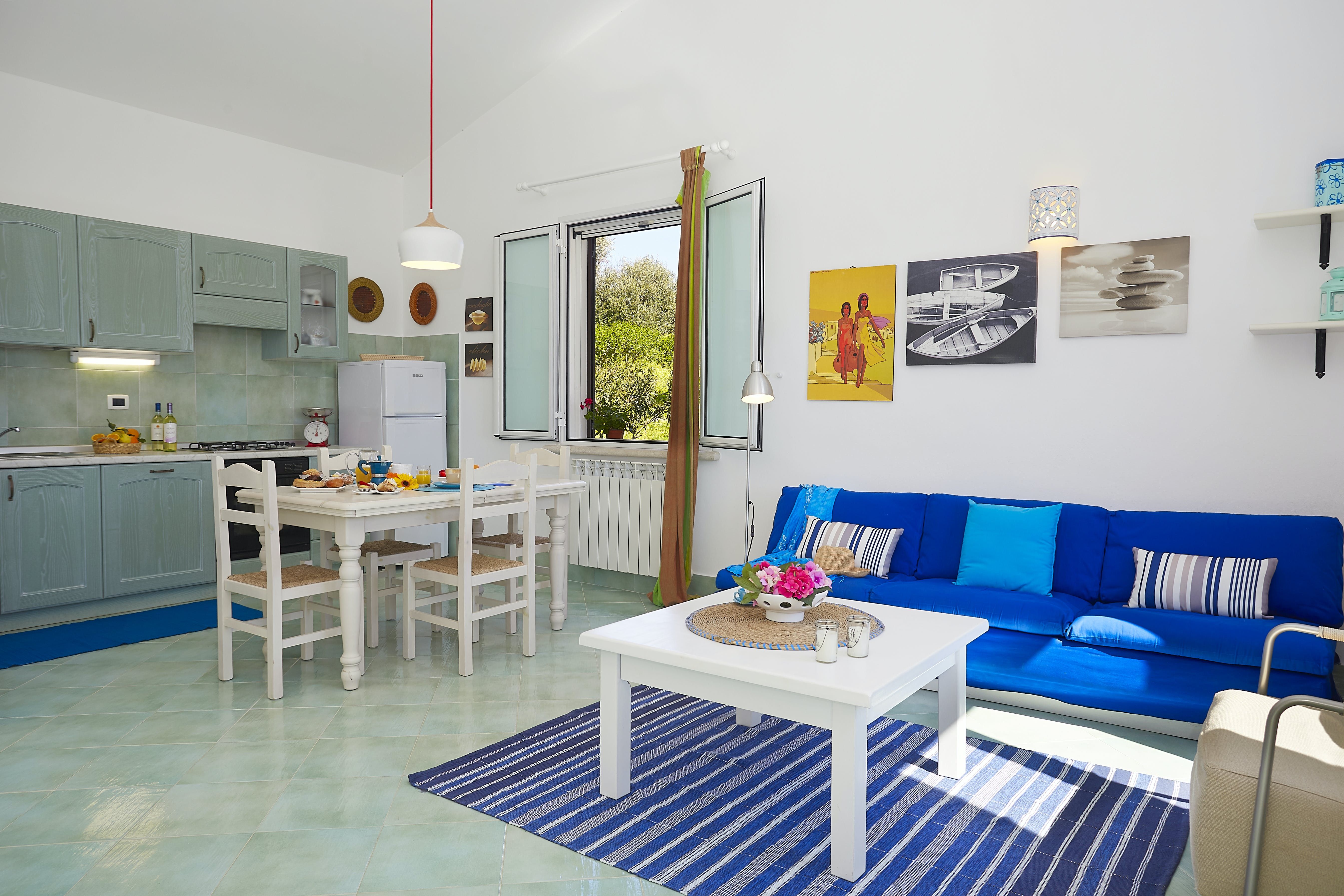 Stepping inside the villa, pale turquoise tiles keep things cool underfoot and the pristine white motif is livened up with a seaside palette of deep blue throws and cushions on the sofa and lagoon-blue kitchen cabinets. It’s a bright, open space designed for guests to spend time chatting and chilling together.