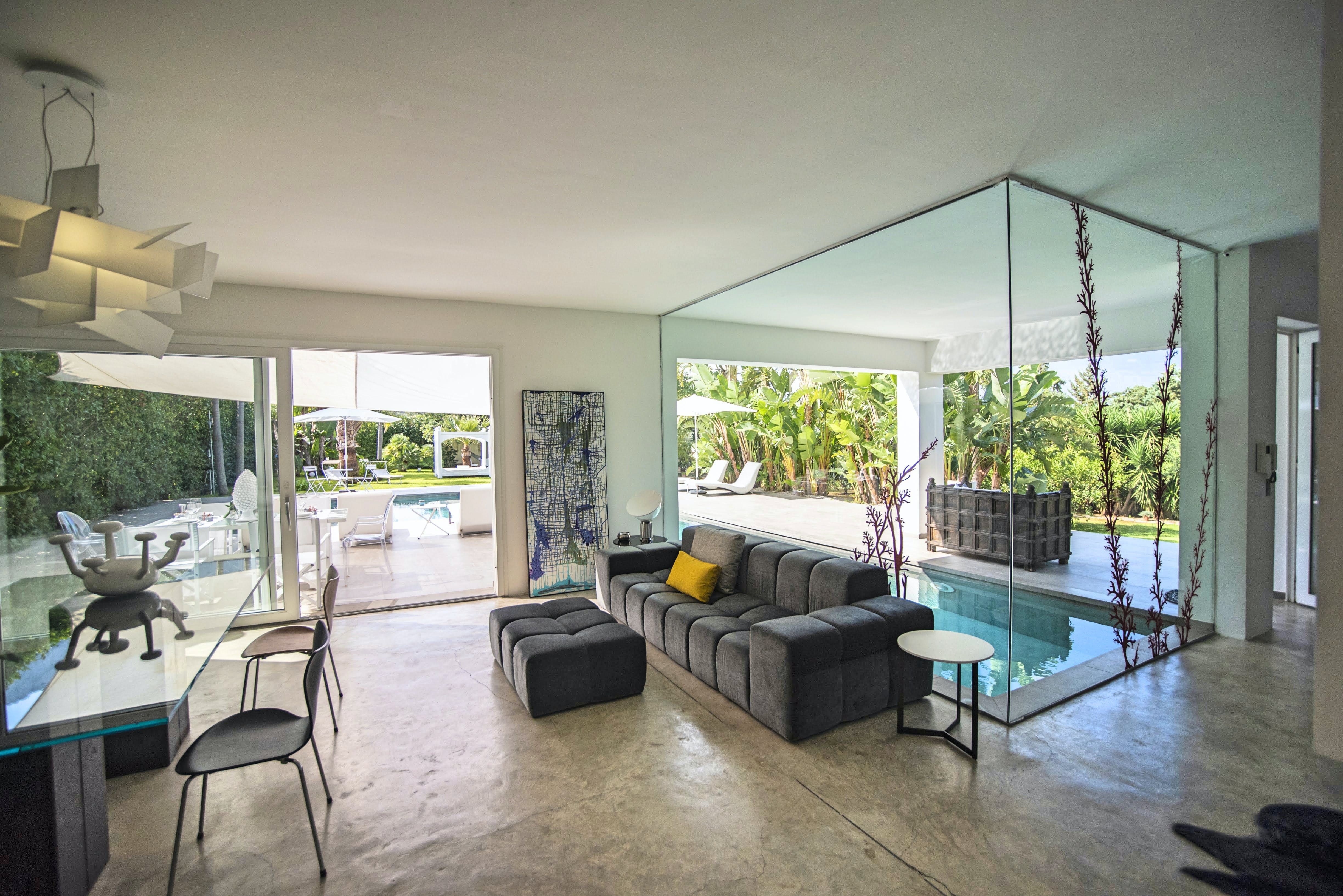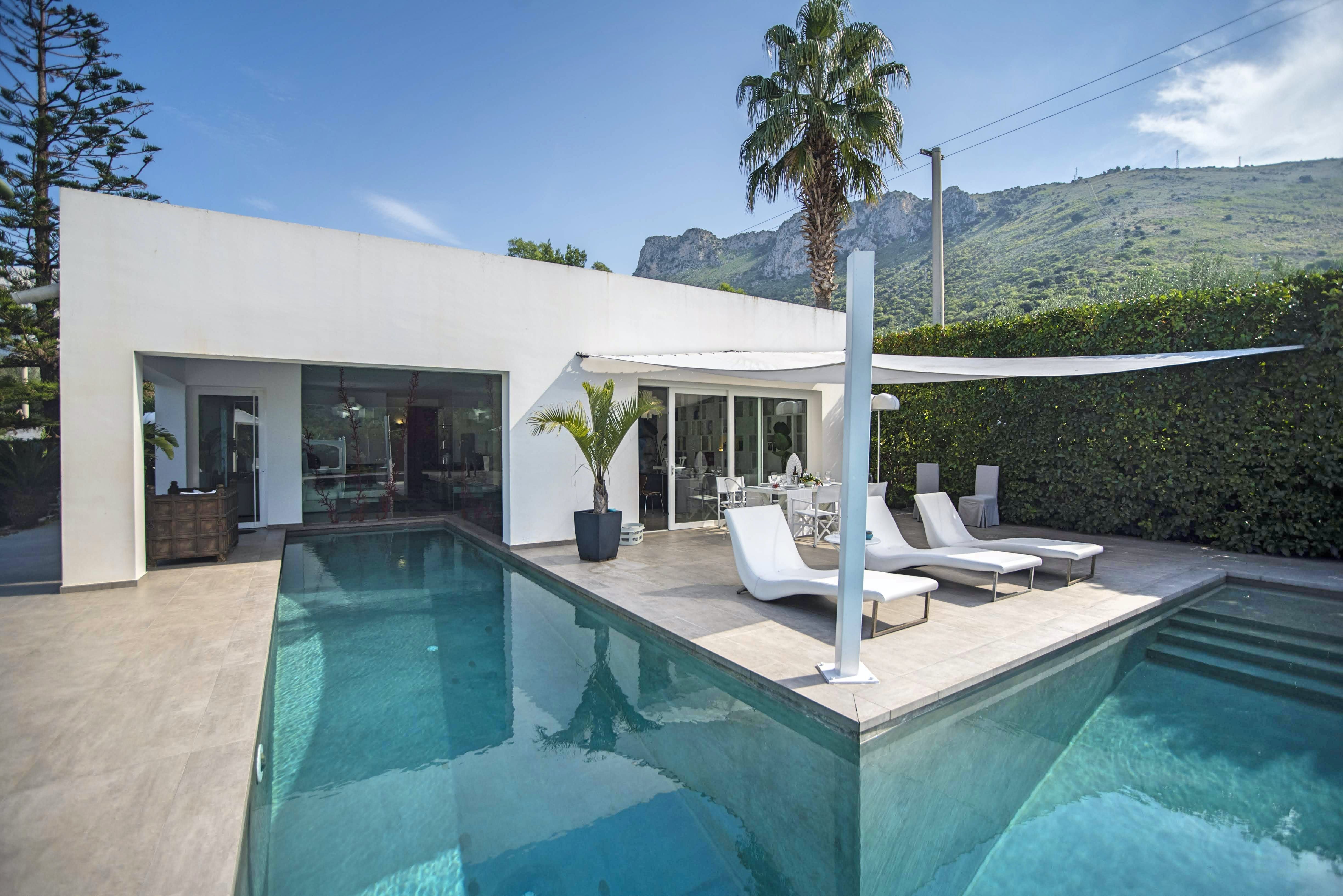 A short drive from central Terrasini on Siciliy's northern coast, this sleek one-storey villa set upon sprawling grounds is perfect for two couples or a family who can't choose between beach and city. Glass walls and French windows soak the living area in sunlight, while the small pool offers the appearance of entering the home. The garden has plenty of space for kids to play and adults to relax, with its day bed, hammock, alfresco dining spots and mountain views. If you're travelling with children, your host can muster up a fifth bed for one of the bedrooms. The beach is just 3km away, while Terrasini offers plenty of distractions with its eateries and shops.