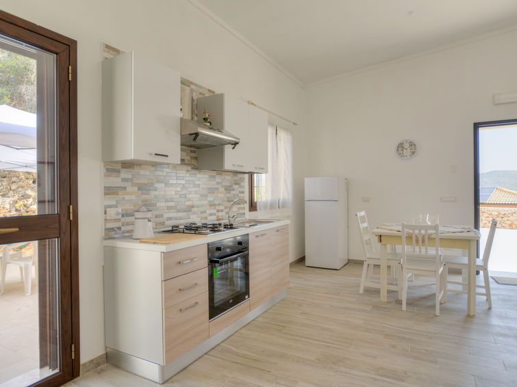 3-room villa 80 m2, on the ground floor. Comfortable and modern furnishings: living/dining room with 1 sofabed and TV (flat screen), air conditioning and forced-air heating. Exit to the terrace. 1 double bedroom. 1 room, without wardrobe with 2 beds. Kitchenette (oven, 4 gas rings, toaster).