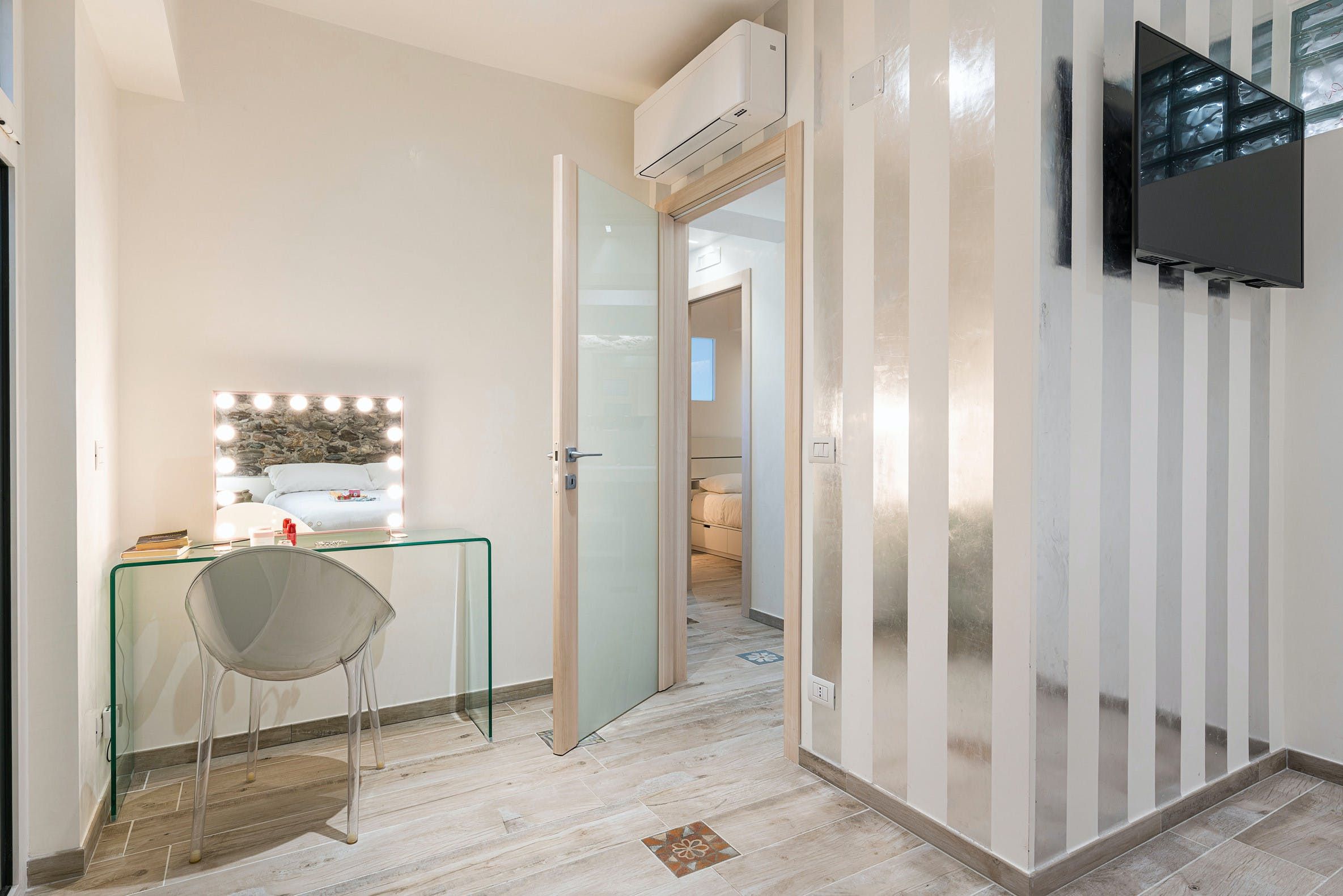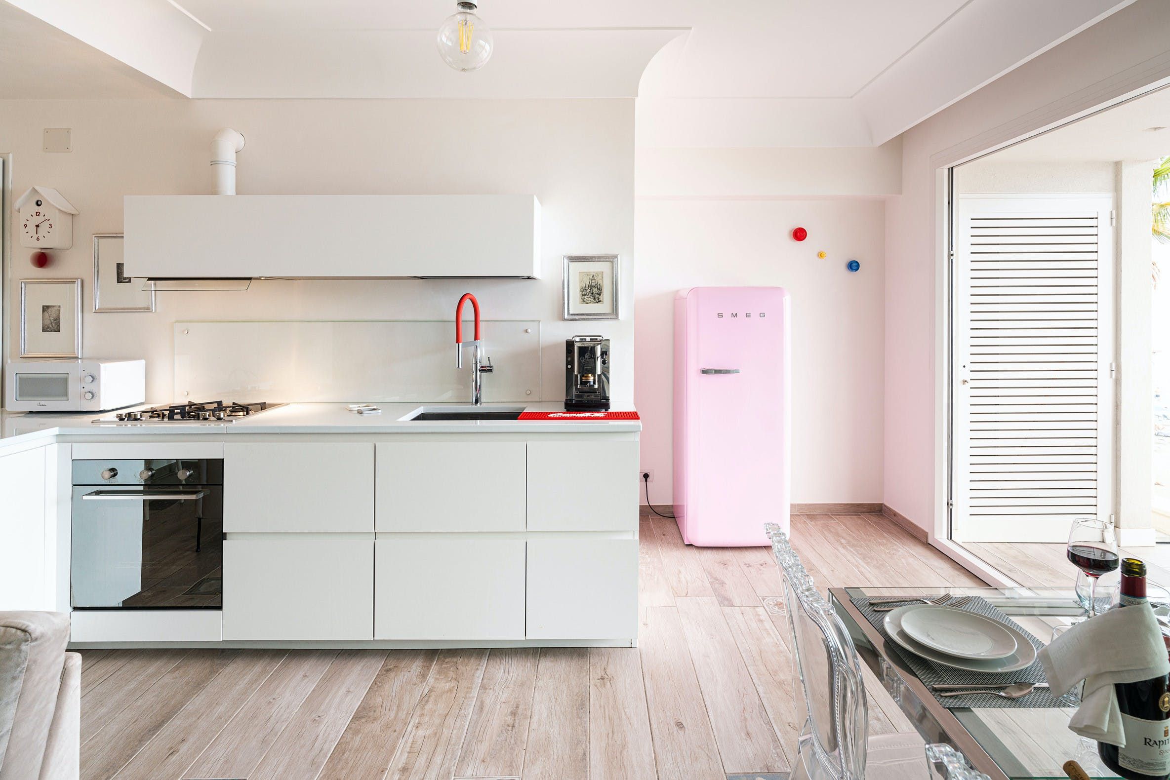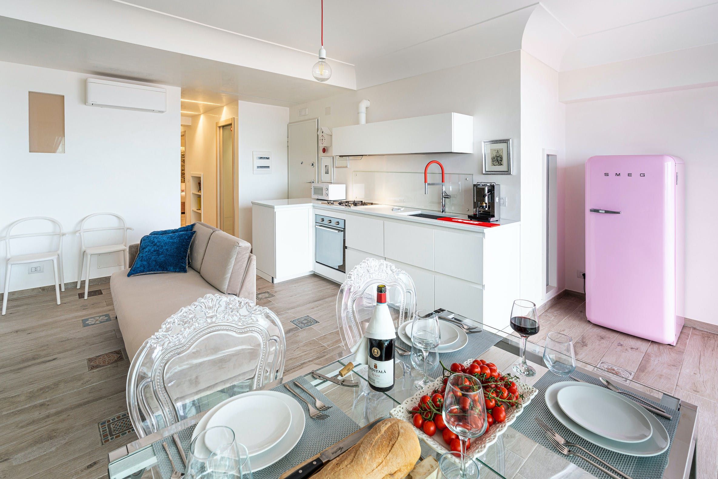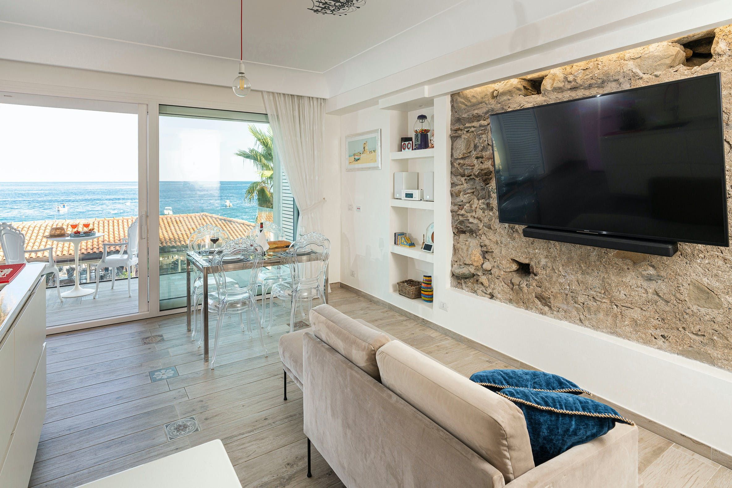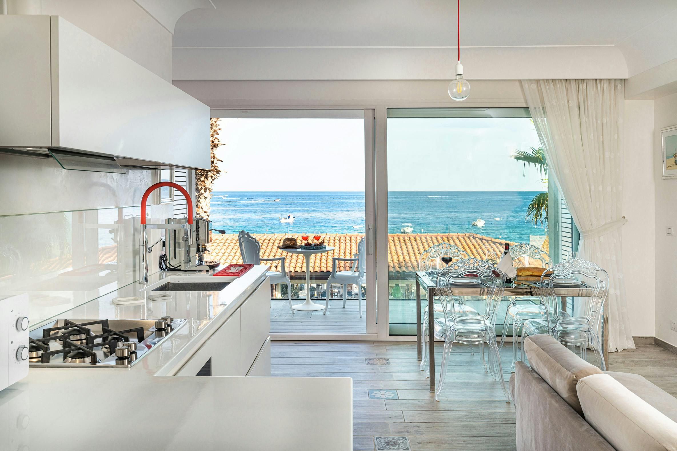 This apartment can be found in the popular seaside resort of Letojanni in Sicily. It’s just a few kilometres from Taormina, so there’s plenty to see and do. We recommend visiting Isola Bella in particular. The apartment looks out over the sea and has a small terrace where you can enjoy the sunshine. Even when you’re inside, the sea views are the focal point thanks to huge windows. The decor inside is chic with a playful side, with charming trinkets dotted around. We think this home is perfect for a couple, a small family, or a trio of friends.