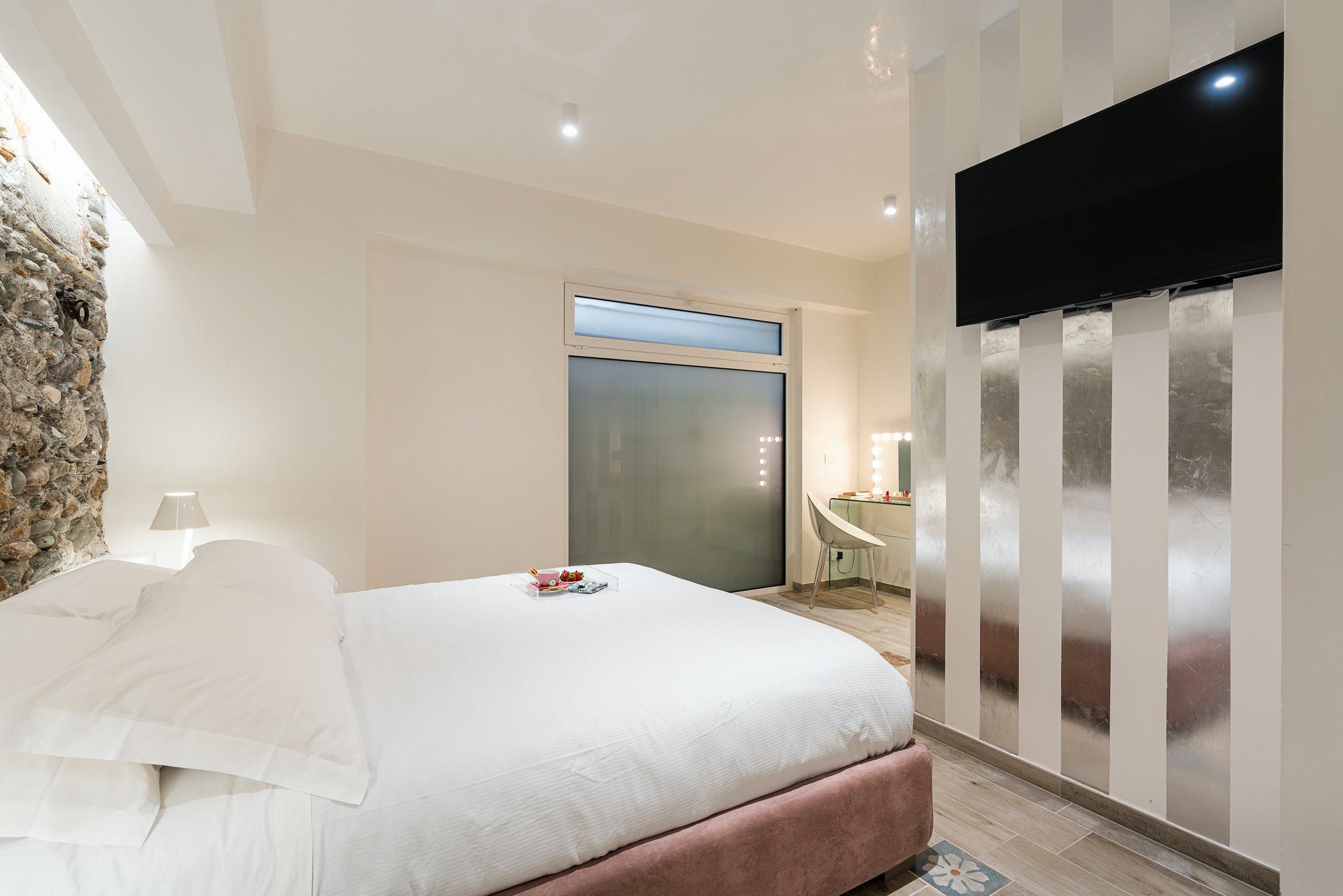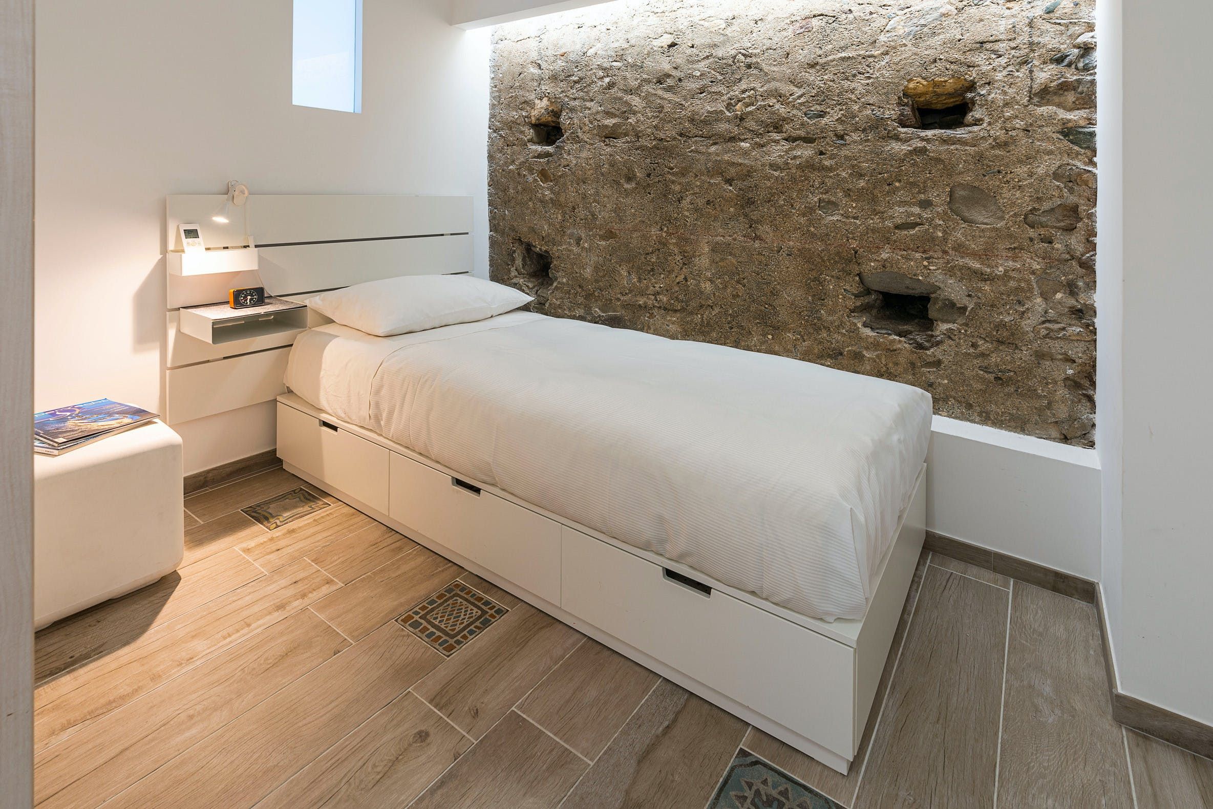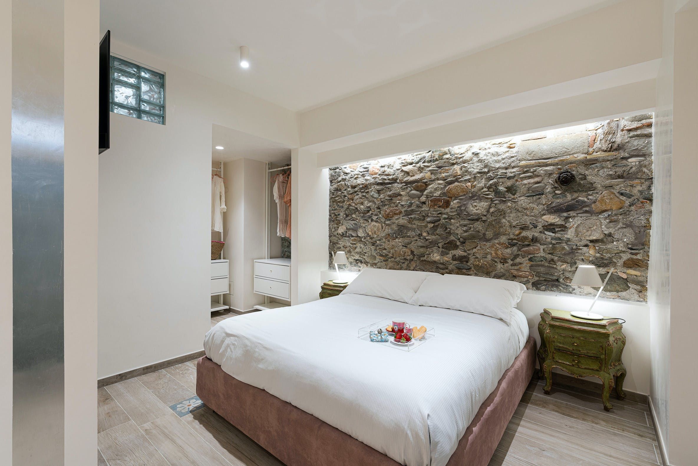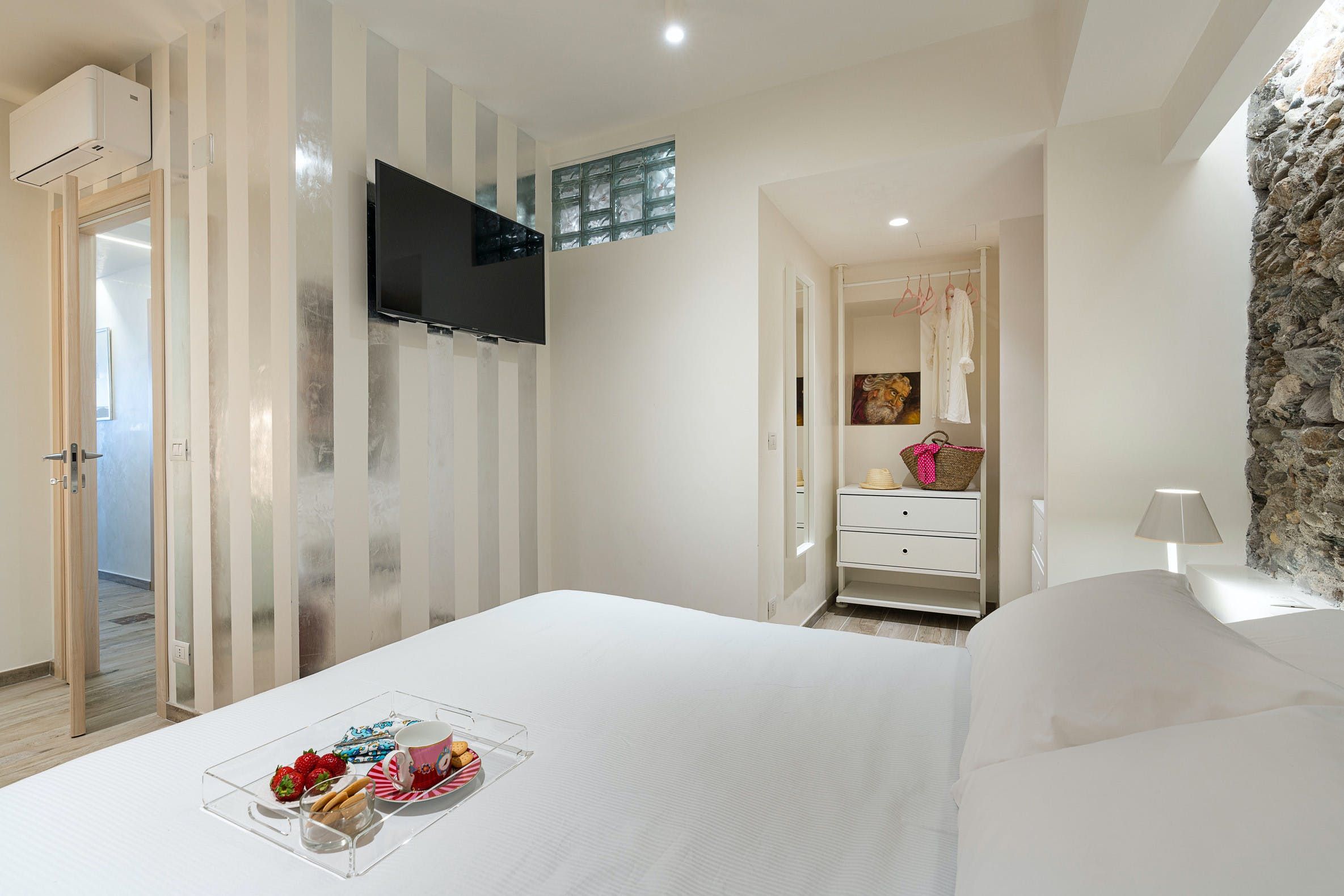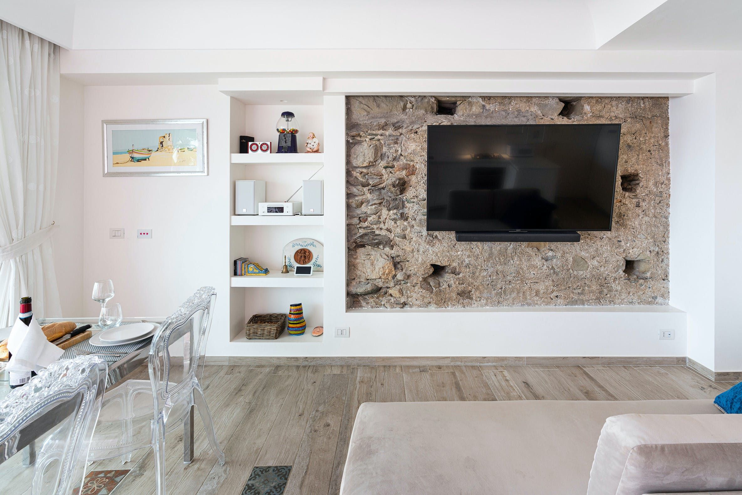 This apartment can be found in the popular seaside resort of Letojanni in Sicily. It’s just a few kilometres from Taormina, so there’s plenty to see and do. We recommend visiting Isola Bella in particular. The apartment looks out over the sea and has a small terrace where you can enjoy the sunshine. Even when you’re inside, the sea views are the focal point thanks to huge windows. The decor inside is chic with a playful side, with charming trinkets dotted around. We think this home is perfect for a couple, a small family, or a trio of friends.