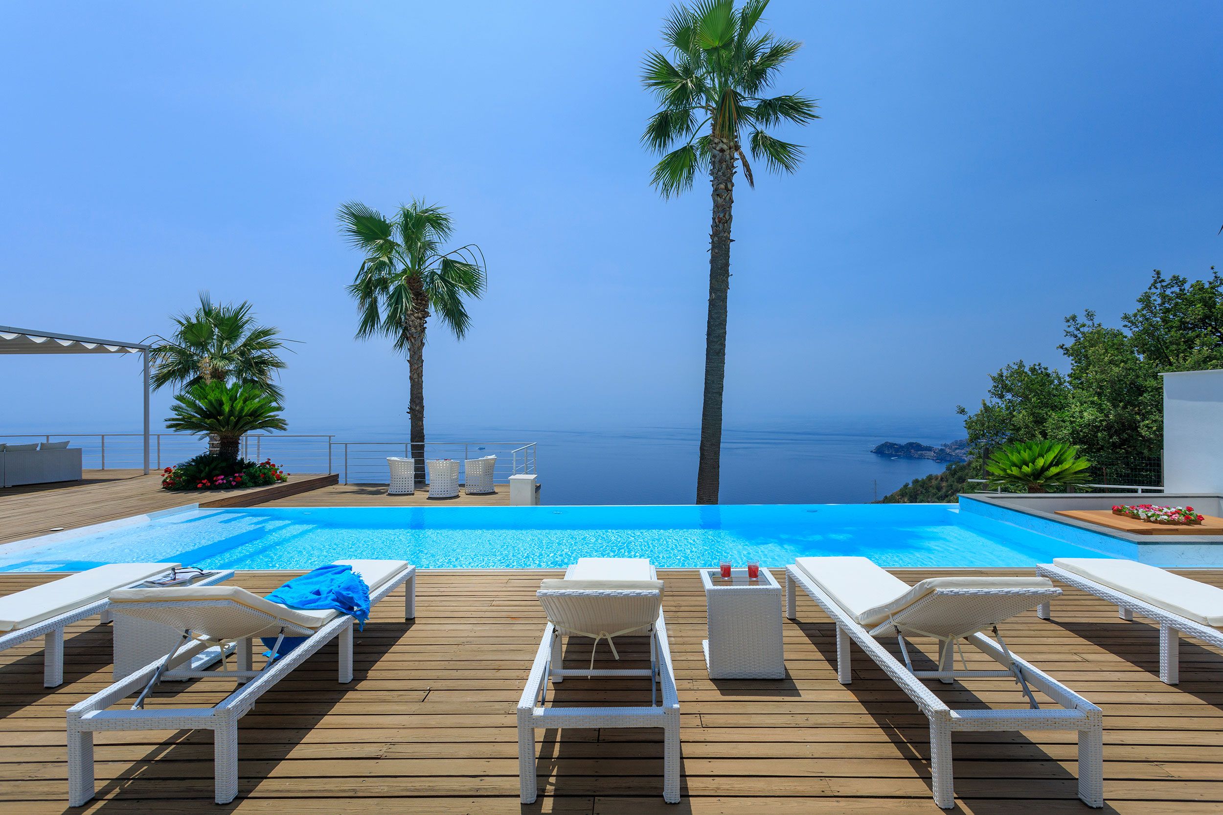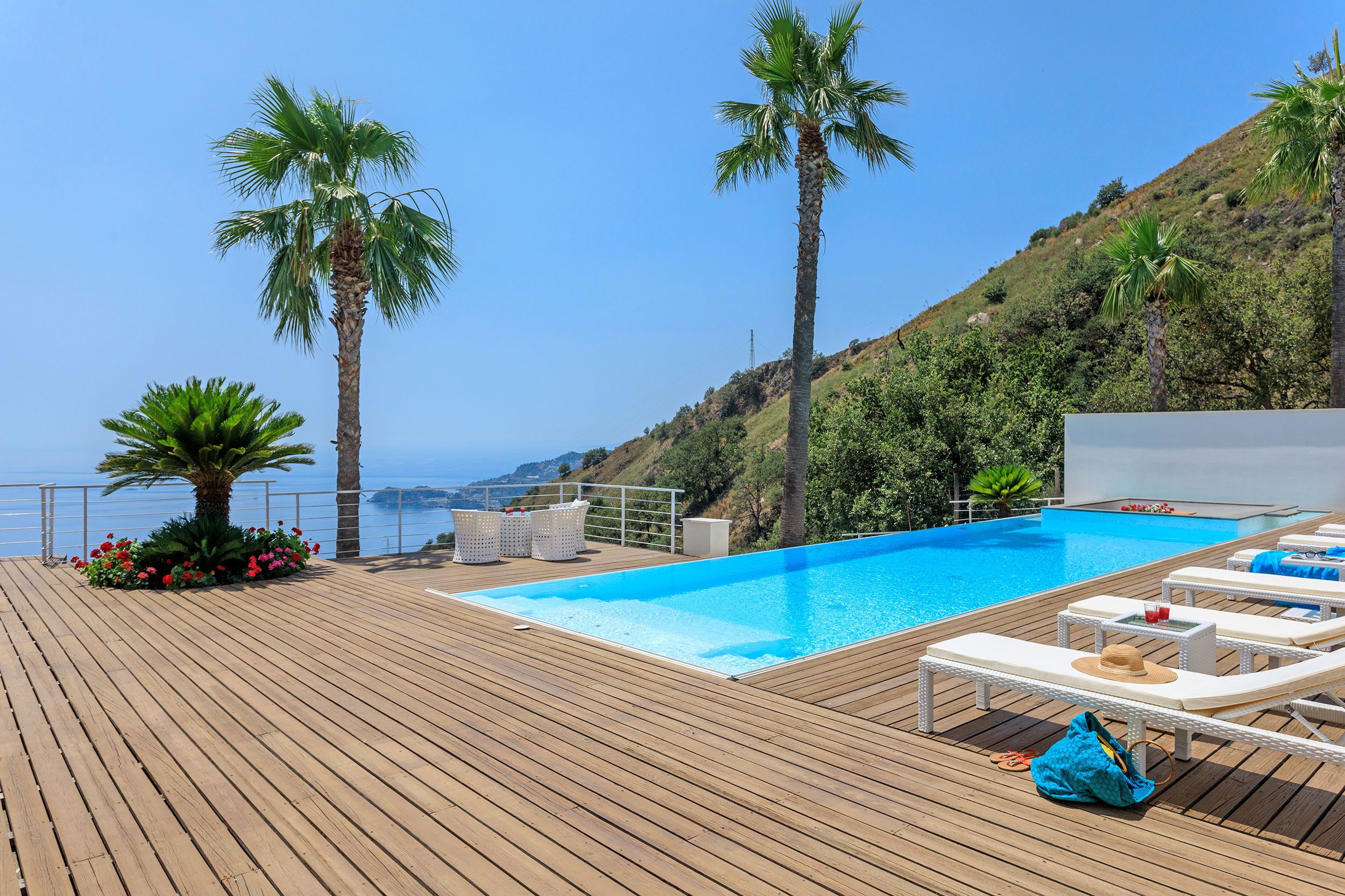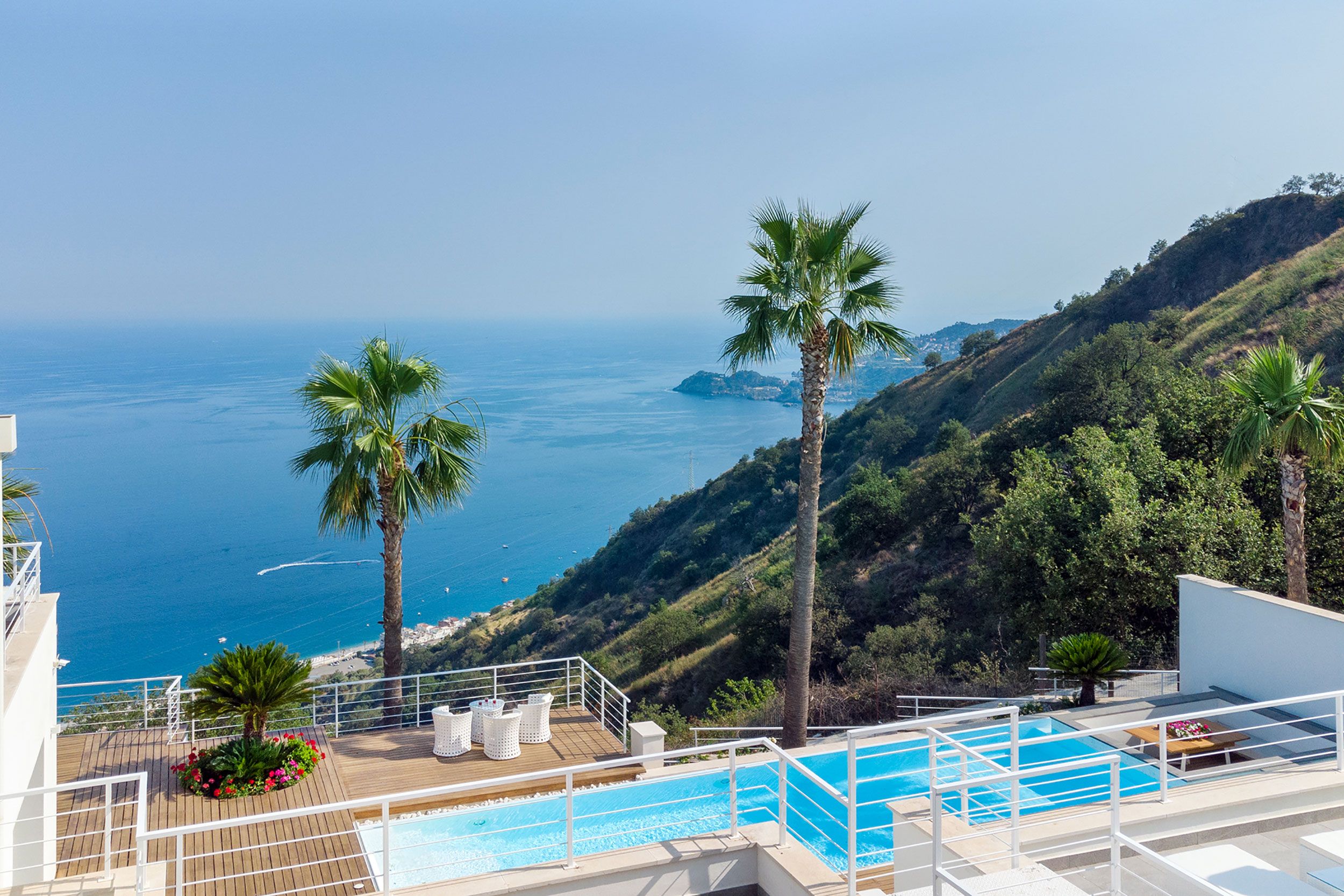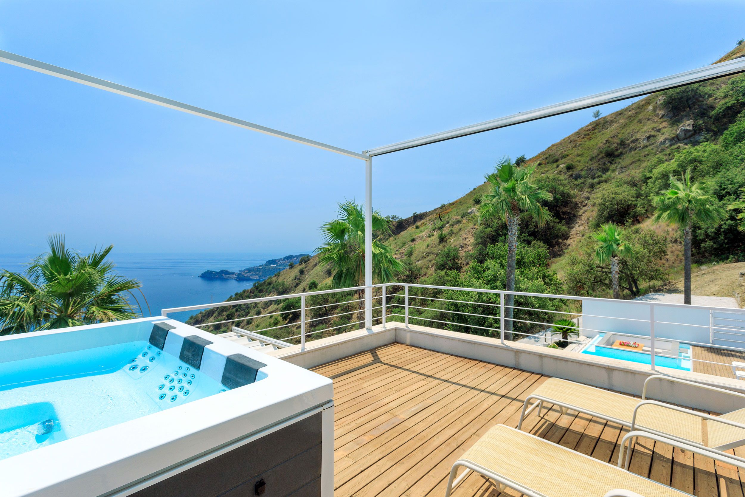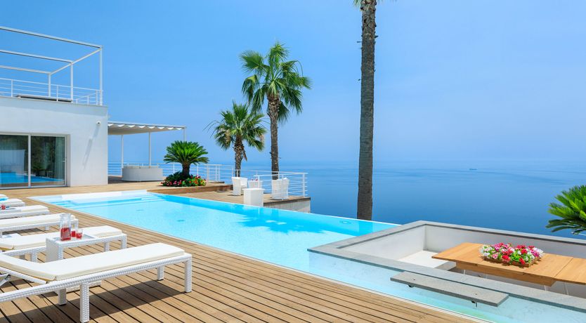 This luxurious villa is a stunning base in east Sicily. It’s just above the seaside town of Letojanni and is close to Taormina, with beaches nearby. The villa boasts truly glorious views over the Ionian Sea and Taormina, which can be admired from inside as well as outside, thanks to floor-to-ceiling sliding French doors. Inside, the decor is crisp and clean, and you’ll find everything you need to enjoy a comfortable, relaxing stay. There’s even a gym and a sauna. Outside, the infinity pool is the main focus – aside from the views. The pool has a hydromassage area, and there’s a separate Jacuzzi. We love the alfresco dining area – there’s a barbecue to cook on too.