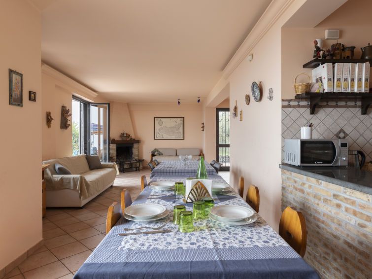 4-room villa 140 m2 on 2 levels. Simple and practical furnishings: large living/dining room with open-hearth fireplace and TV (flat screen), air conditioning. Exit to the terrace. Kitchenette (4 hot plates, oven, microwave) with dining table. Shower/bidet/WC. Upper floor: 1 double bedroom with air conditioning.