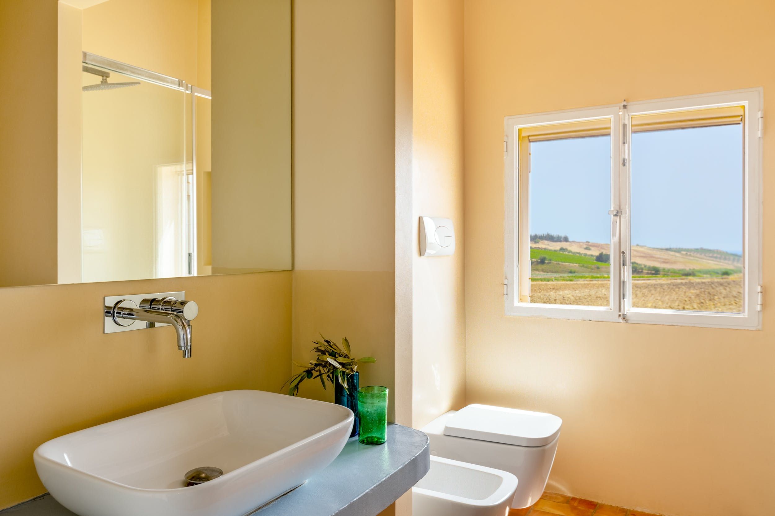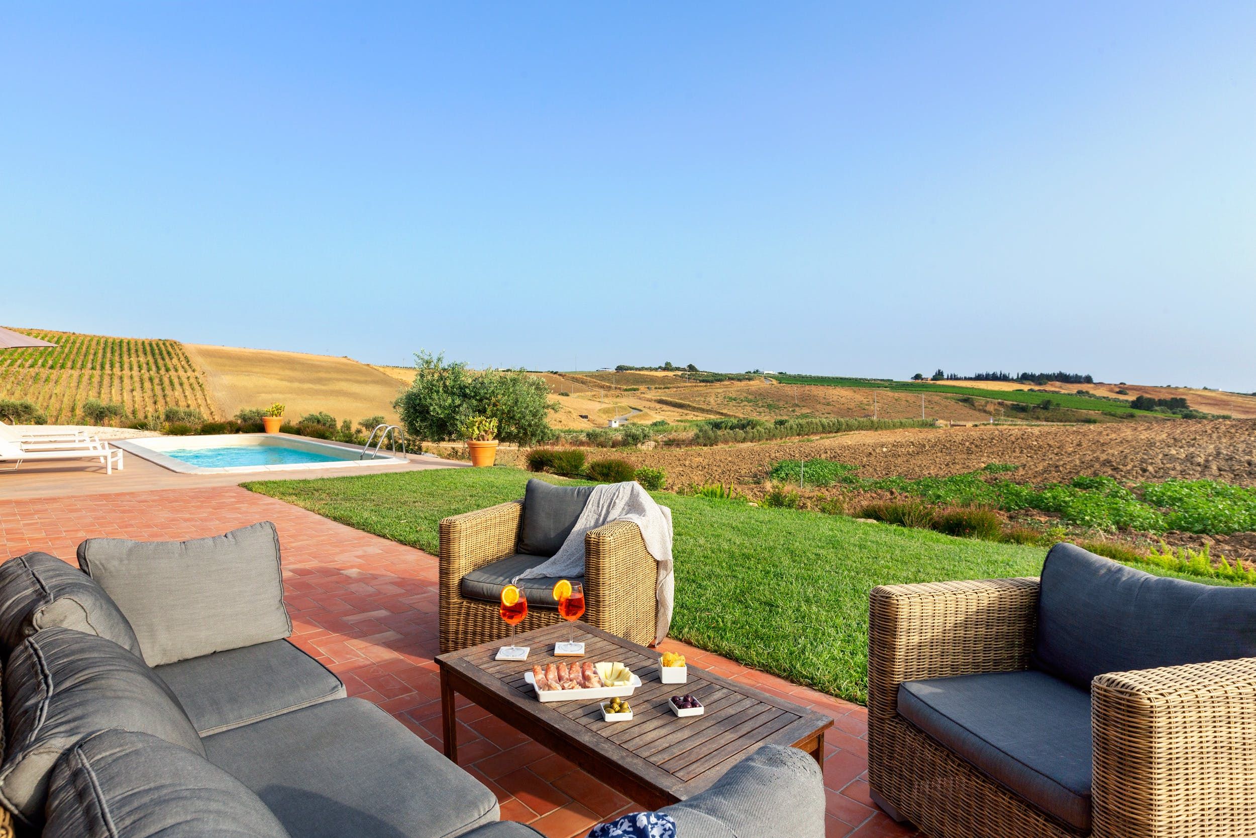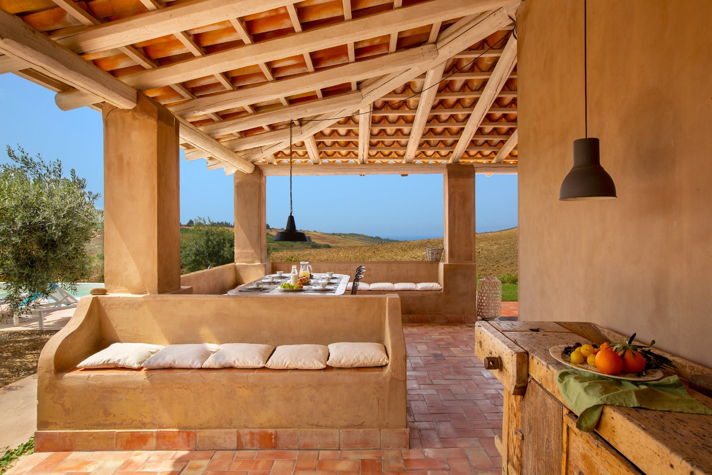 Tranquillity finds new meaning in this gorgeous, traditional Sicilian villa. Muted terracotta-hued façade and tiled roof blend harmoniously with the countryside setting. Rolling fields and sloping hills seem to go on forever, allowing you to find total relaxation in the seclusion.