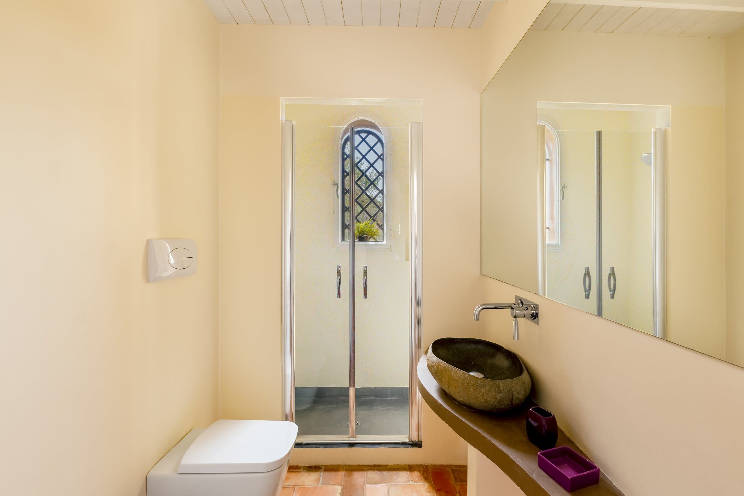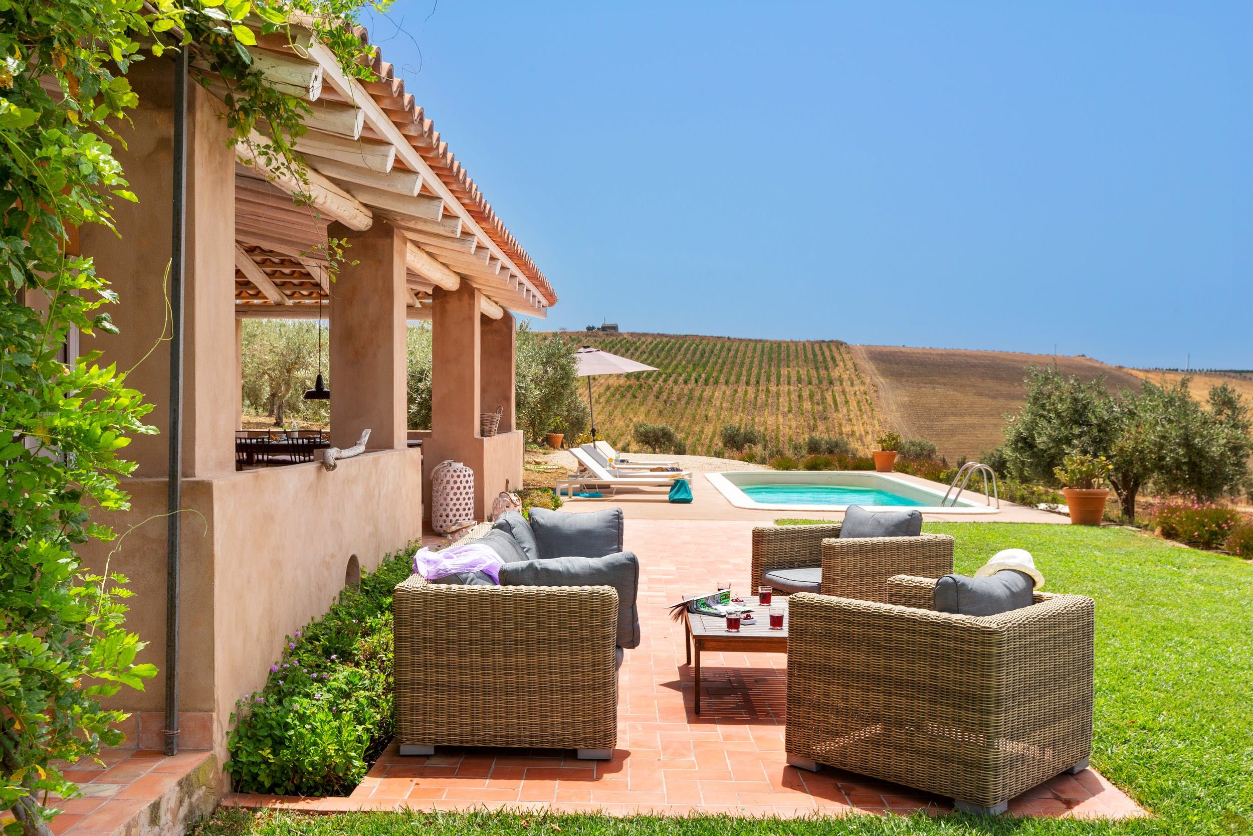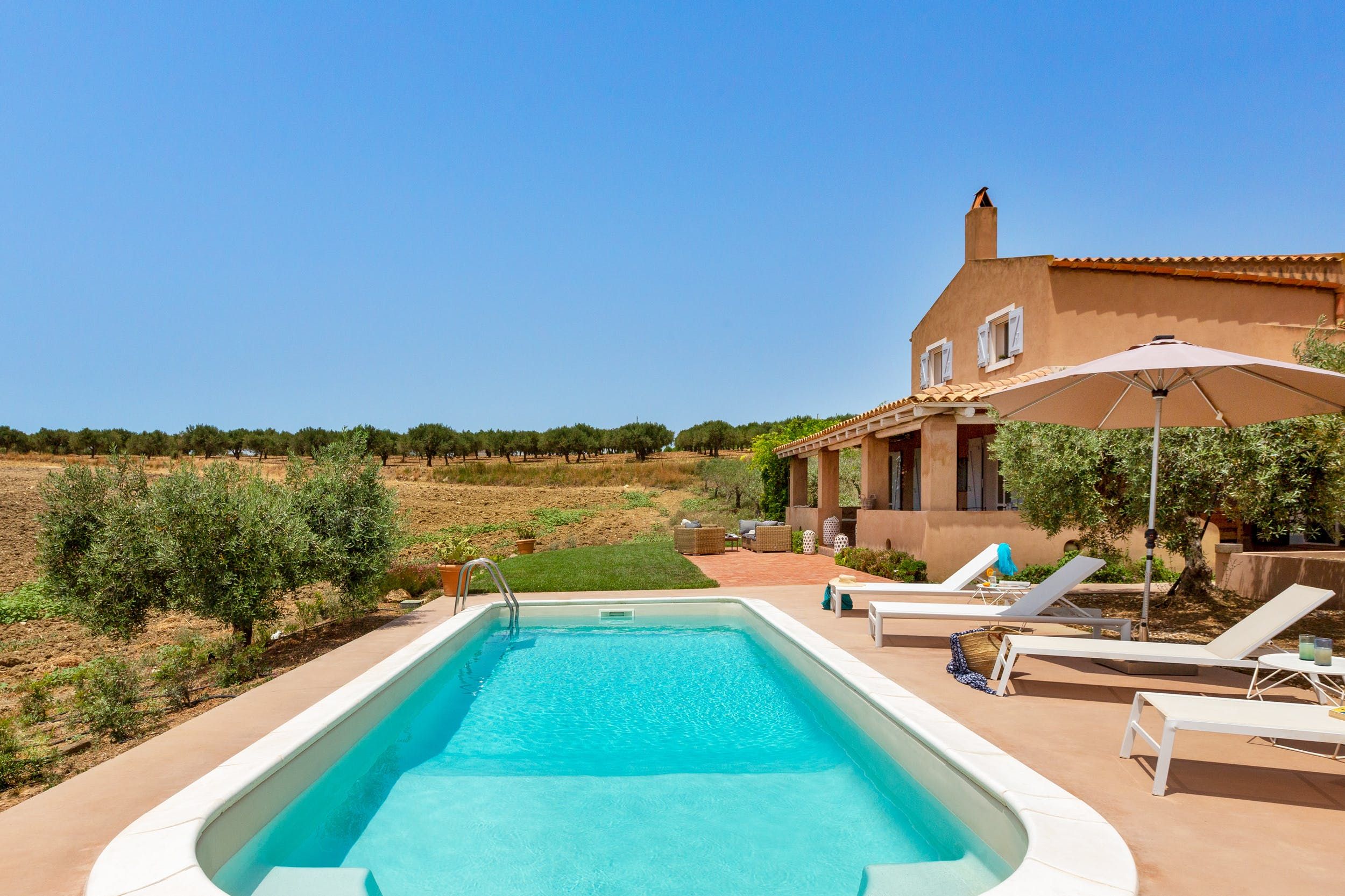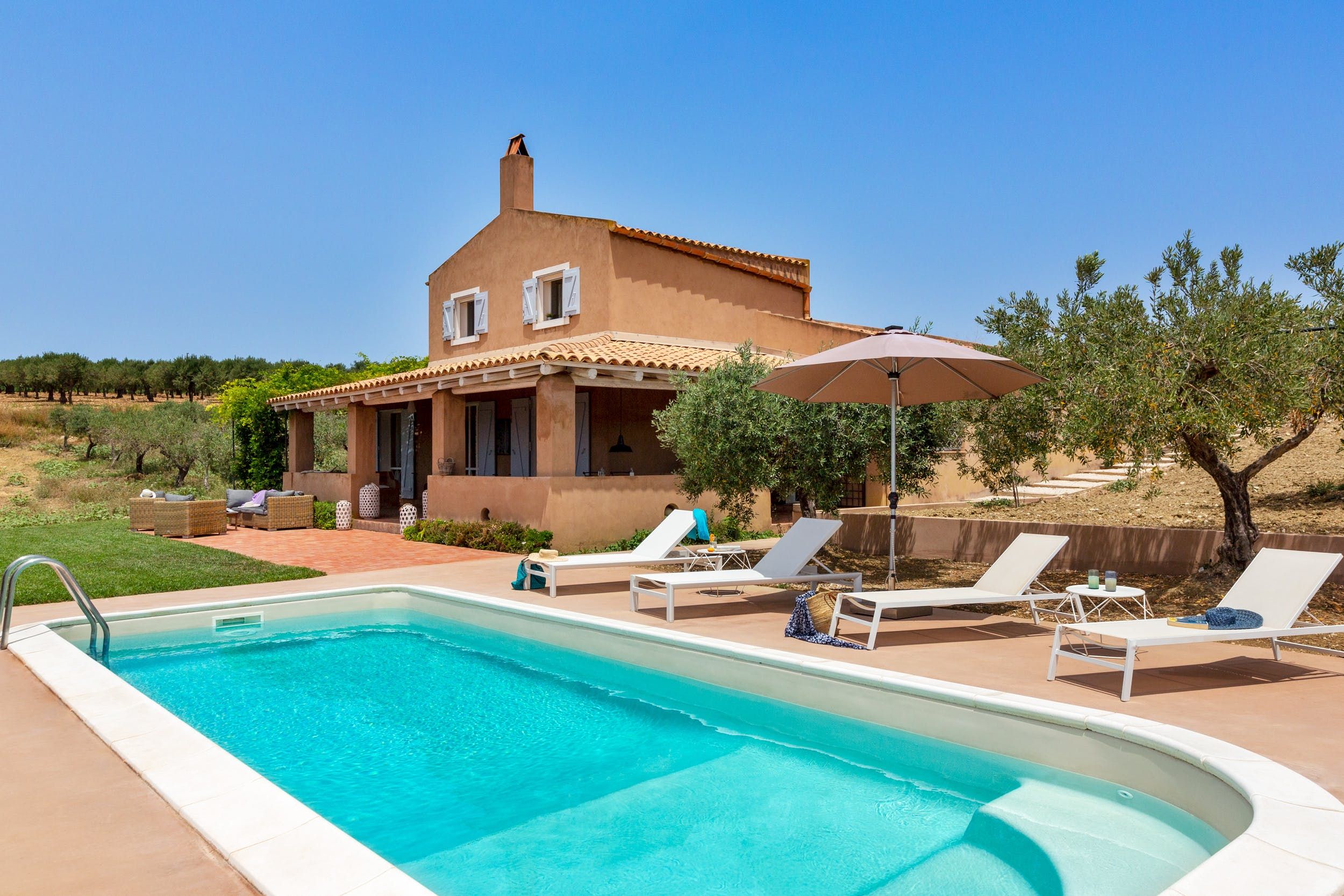 Tranquillity finds new meaning in this gorgeous, traditional Sicilian villa. Muted terracotta-hued façade and tiled roof blend harmoniously with the countryside setting. Rolling fields and sloping hills seem to go on forever, allowing you to find total relaxation in the seclusion.