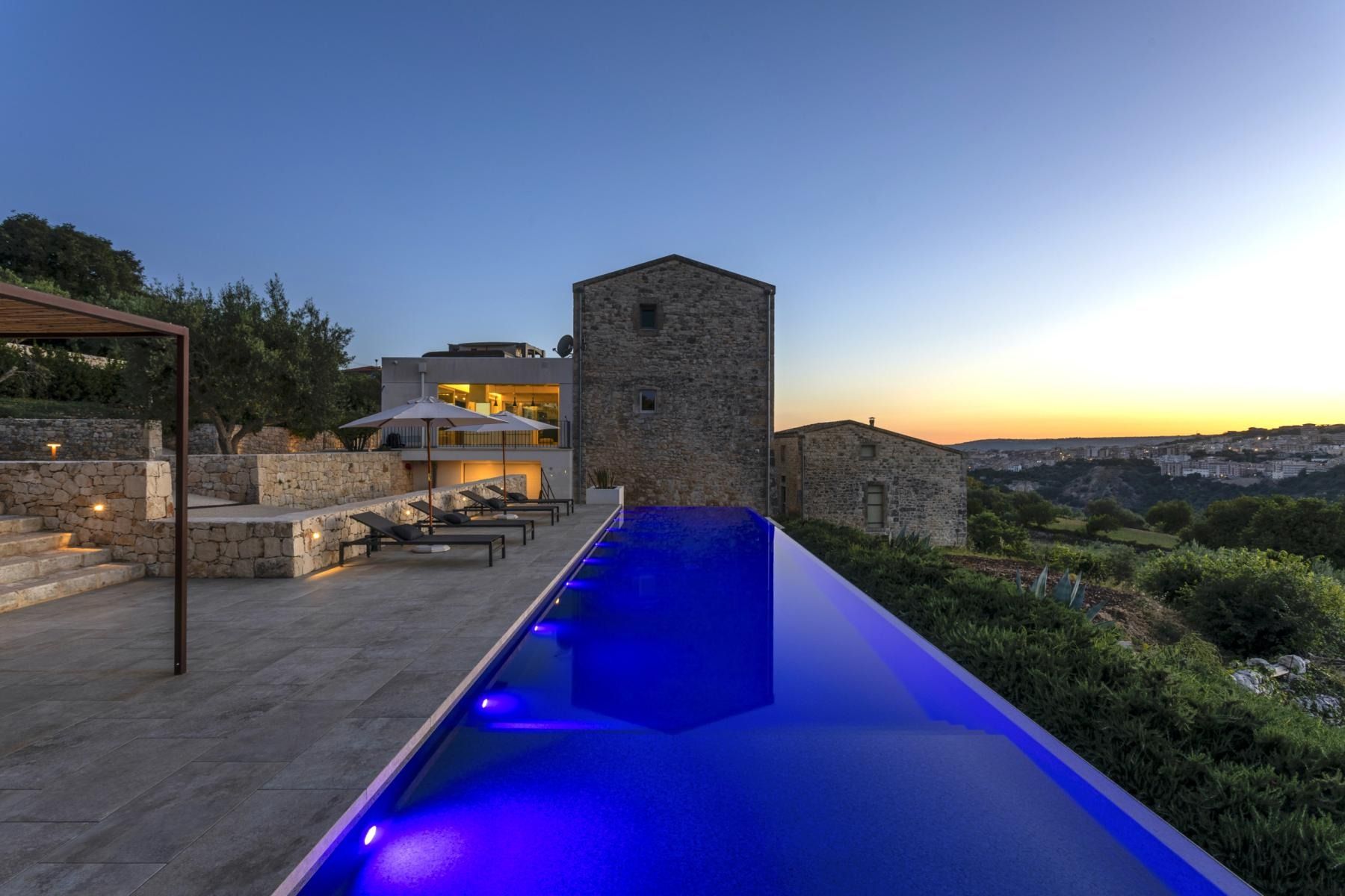 With views of the Sicilian countryside and the town of Modica, this villa has a fantastic outlook. Spend your days relaxing by the large swimming pool or cooking meals in the outdoor kitchen. And as sunset approaches, you can enjoy drinks on the terrace with its olive trees and festoon lights. Inside, we love the light-filled open-plan living space, as well as the second seating and dining area – both rooms have great vistas. When you want to explore, historic Modica is just around a five-minute drive, while idyllic beaches are only twenty minutes away by car.