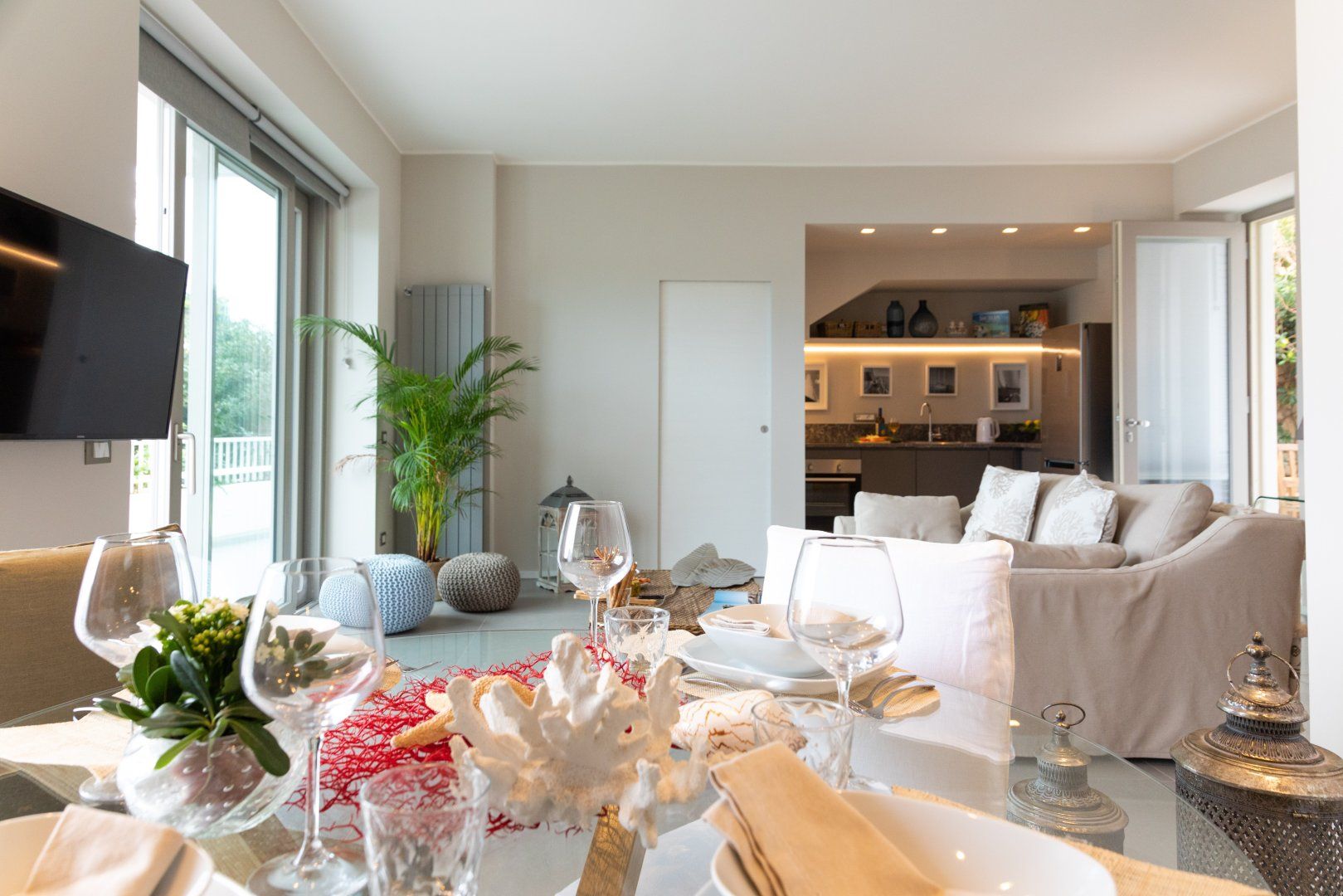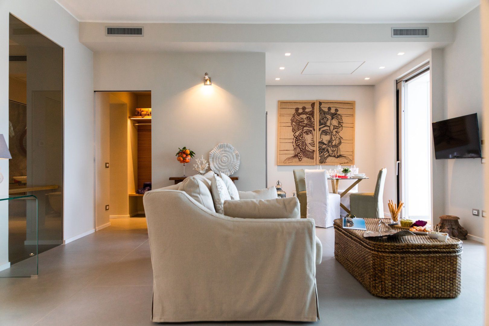Arrive to be welcomed by a bright and inviting open-plan living room, with a comfy sofa from which you can choose to either watch TV or gaze at the sea views outside – the choice is never easy! Step out onto the large balcony and allow yourself to be wowed by the vistas – this is the place to be at sunset, with some delicious wine and in great company. Nothing beats a candlelight supper under the stars with the sound of waves crashing in the distance.