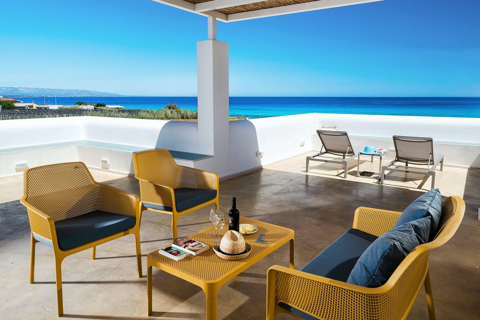 The idyllic space is drenched in high-end amenities, and that's not even the best part. Every inch of the area showcases spectacular views of the rugged coastline melting into the Mediterranean Sea. It's one of the prettiest views in Sicily, and it belongs all to you.