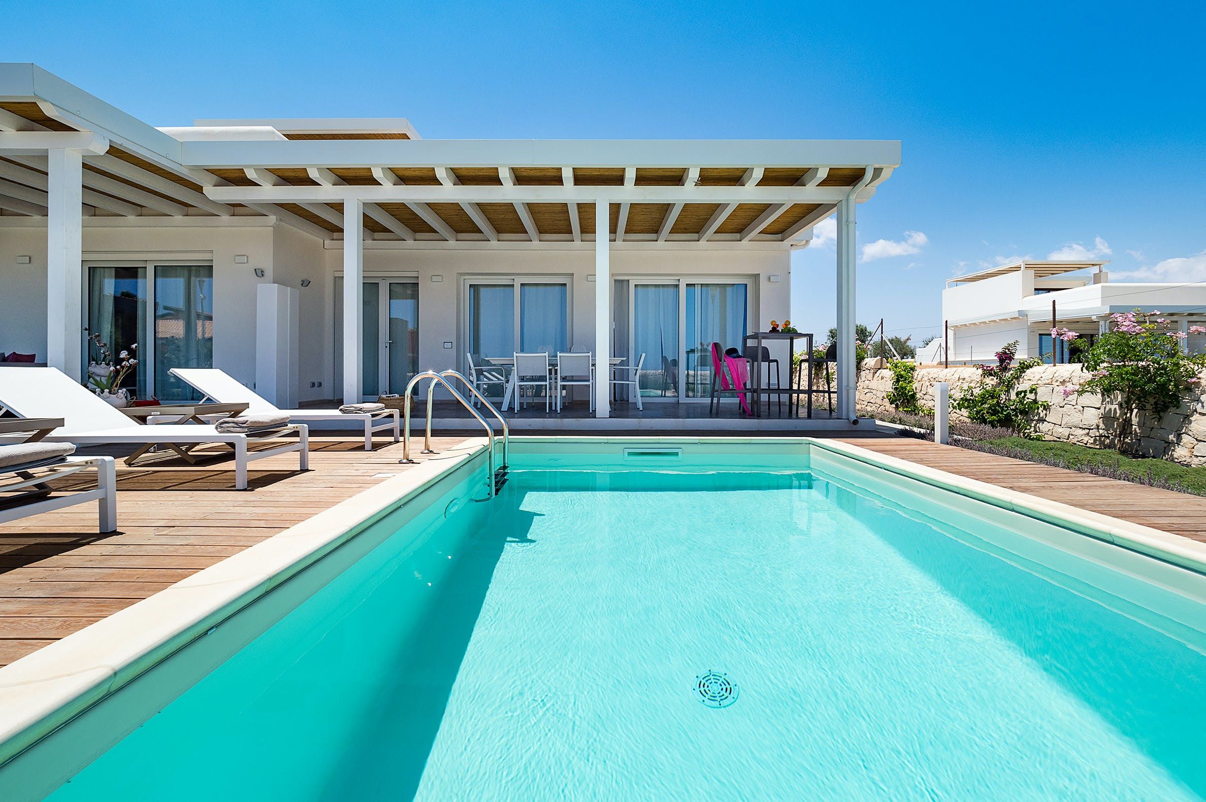 Home truths: *Due to this home's location, we recommend hiring a car to get the most out of your stay. There's parking here. *This estate is made up of two modern villas, just a few metres from each other. Each villa features a kitchen and living room and sleeps eight guests. To access the top floors of each villa, you'll need to climb an external staircase. *Your host will provide a welcome basket and cleaning services. Fresh bath towels will be provided twice per week, and pool towels and bed linen once per week. *A baby cot and high chair can be provided for free upon request. The pool is unfenced, so please supervise little ones.
