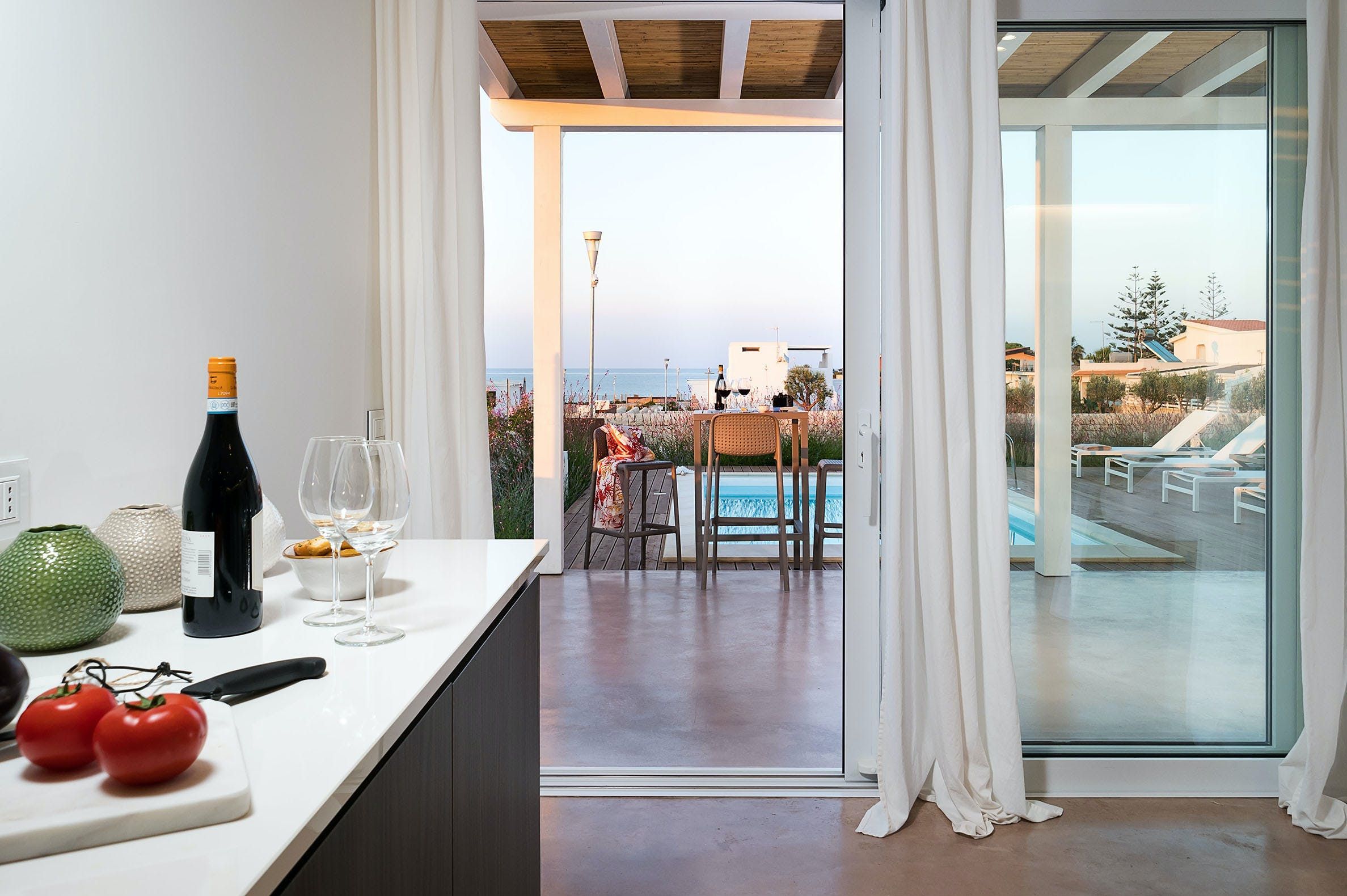 This modern-style villa is situated in a prime seafront position near the popular San Lorenzo beach. It’s close to the Nature Reserve of Vendicari and many restaurants too, while the Baroque towns of Syracuse, Ragusa and Noto are just a short drive away. Along with the great location, another highlight here is the beautiful sea views which you can enjoy from the pool, patio and roof terrace. You can admire the vistas from inside too, and we love that all the bedrooms open out onto a terrace or balcony.