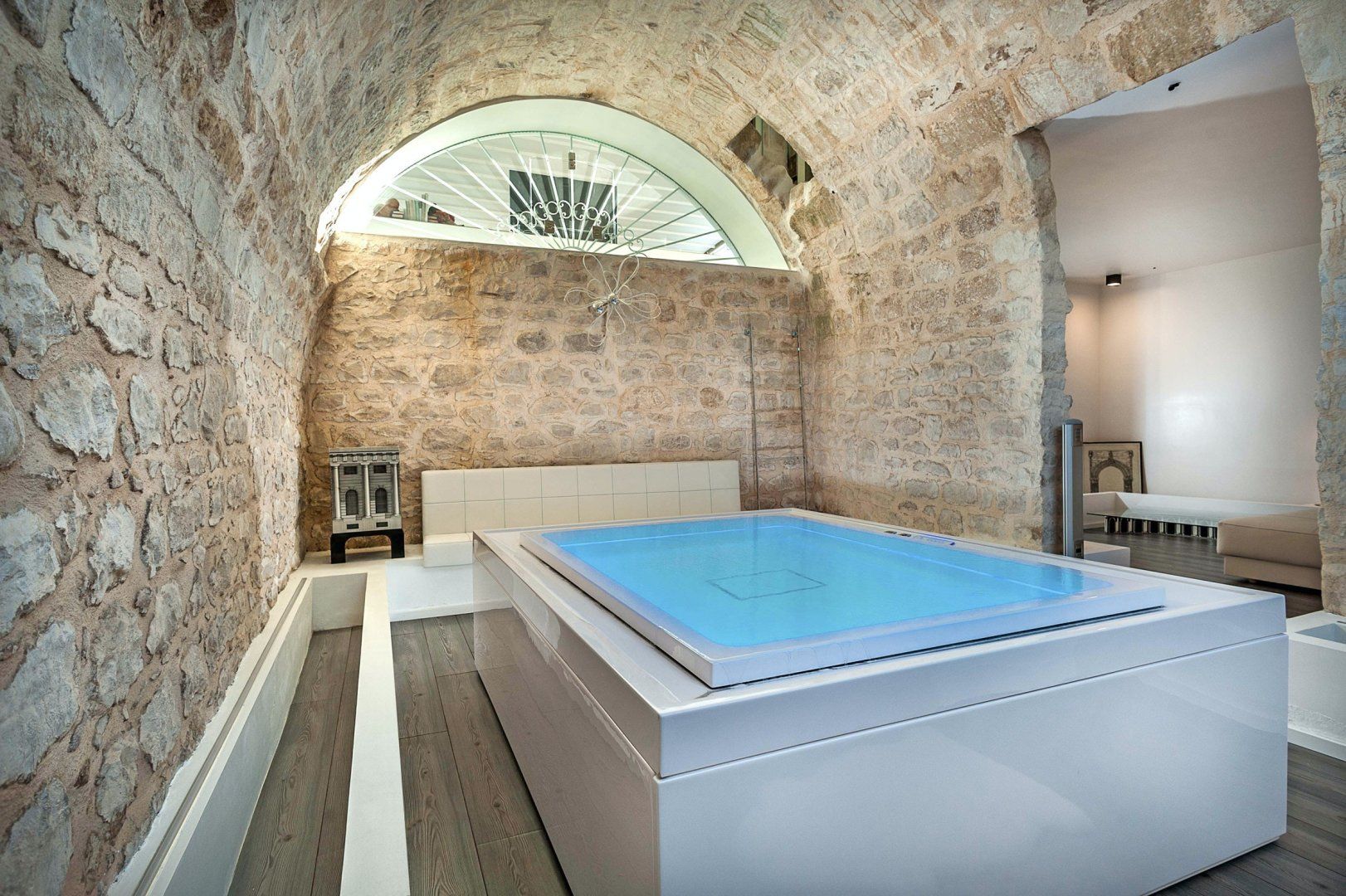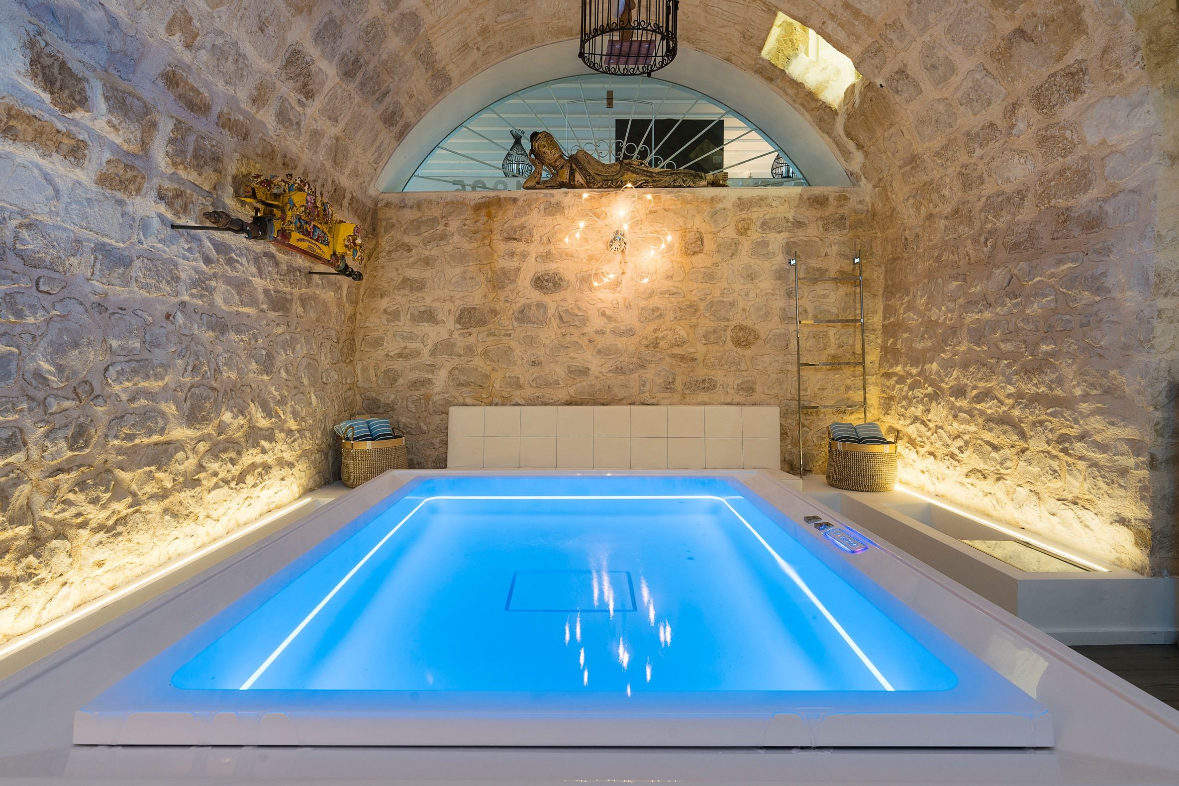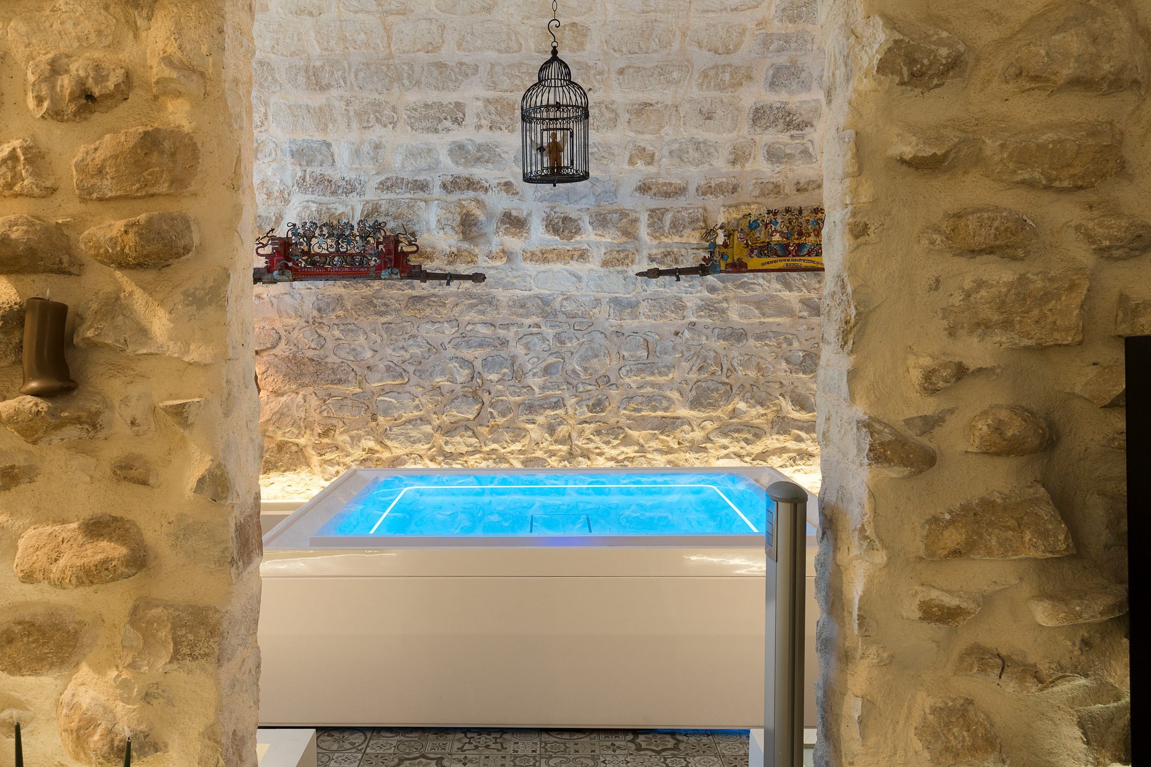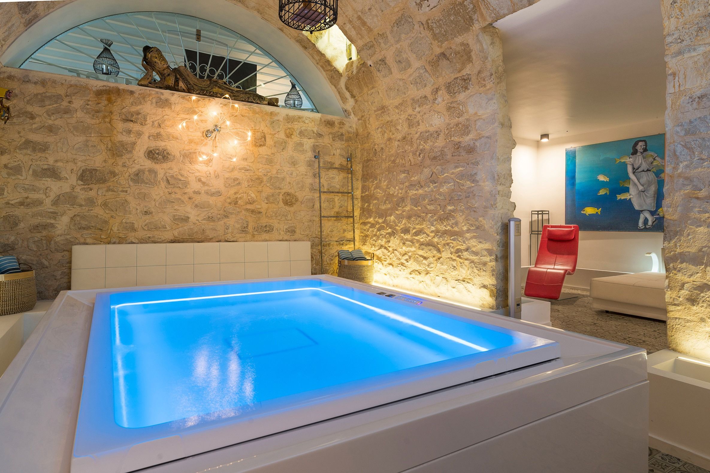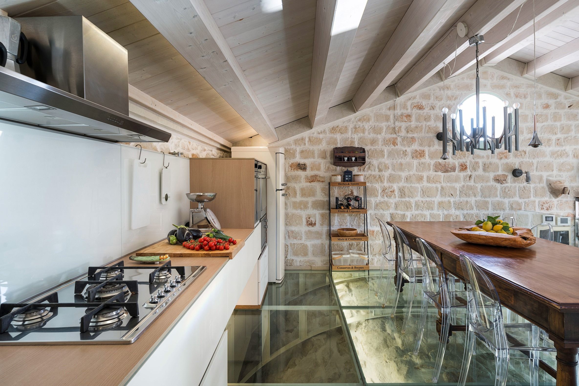 Lazy mornings were made for soaking up the sun by your saltwater pool and sipping an espresso on the terrace. Inside, we absolutely adore how the glass-floored kitchen honours the age of this home. After an adventure on the coast, come back and relax in your very own wellness room – complete with a private hot tub and sauna. From wine tasting to beauty treatments, there are plenty of ways to pamper yourself between these stone walls. Perhaps you'll want to keep the evenings simple with a sunset barbecue, or you could arrange for a professional chef to serve a feast to your family.