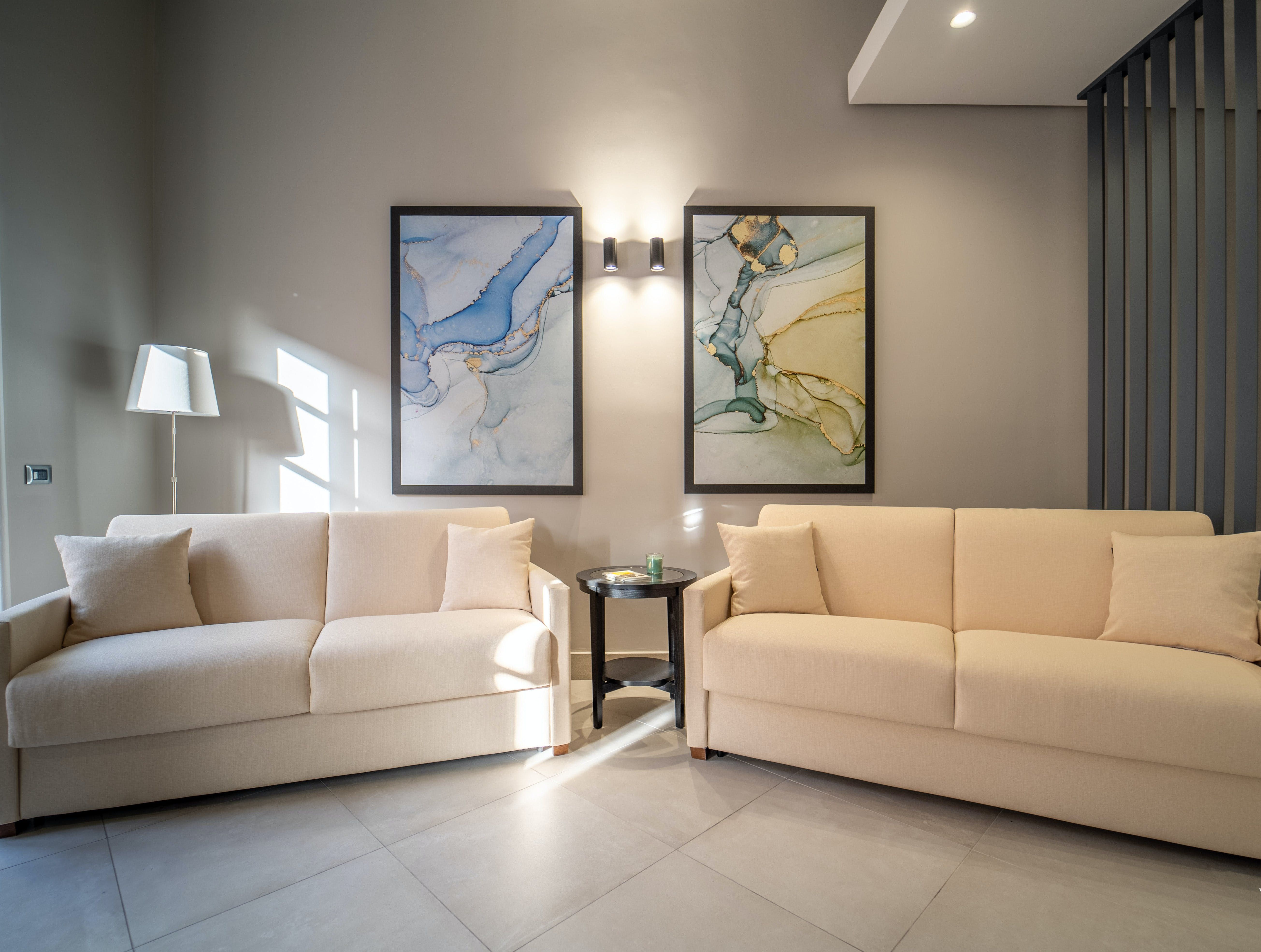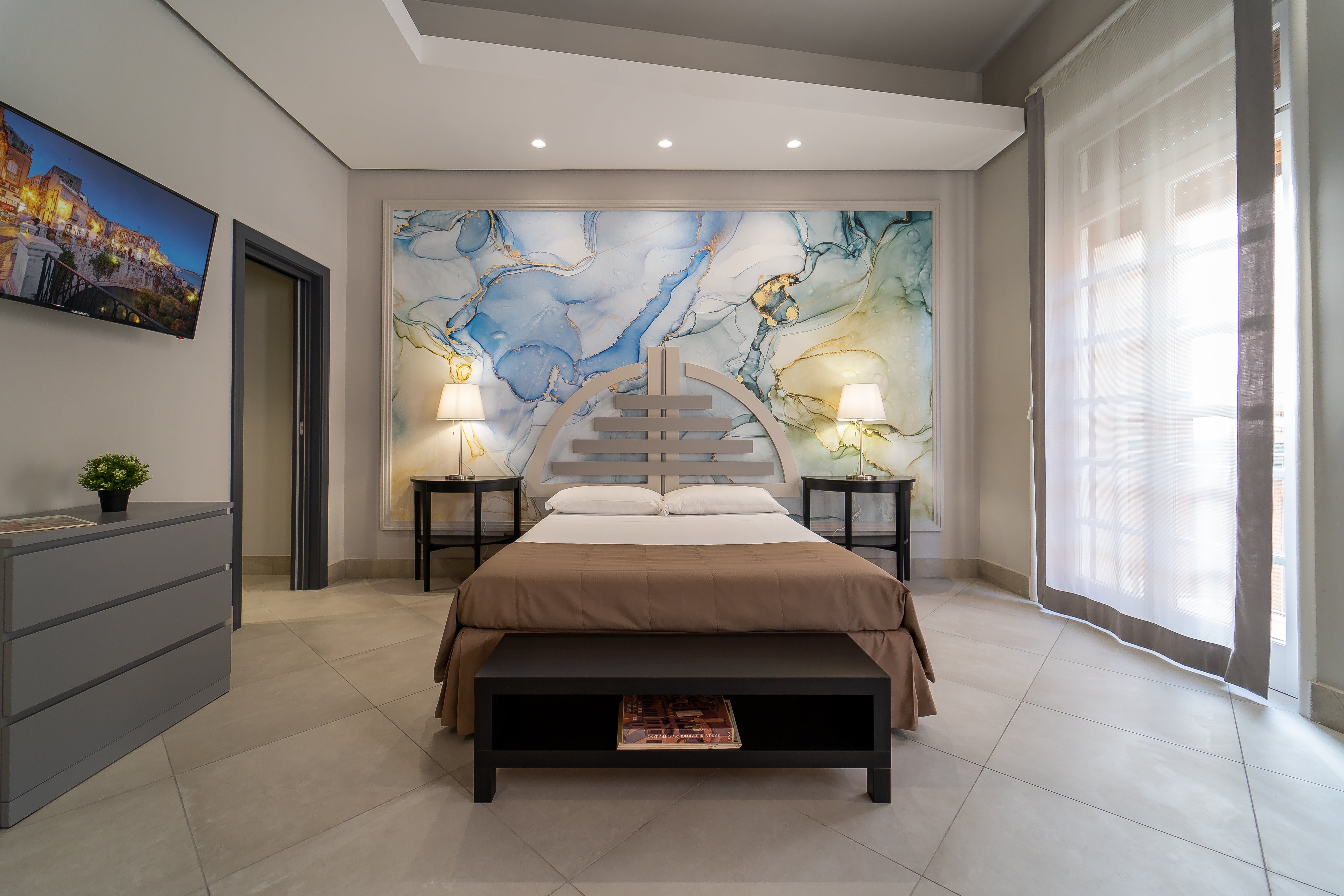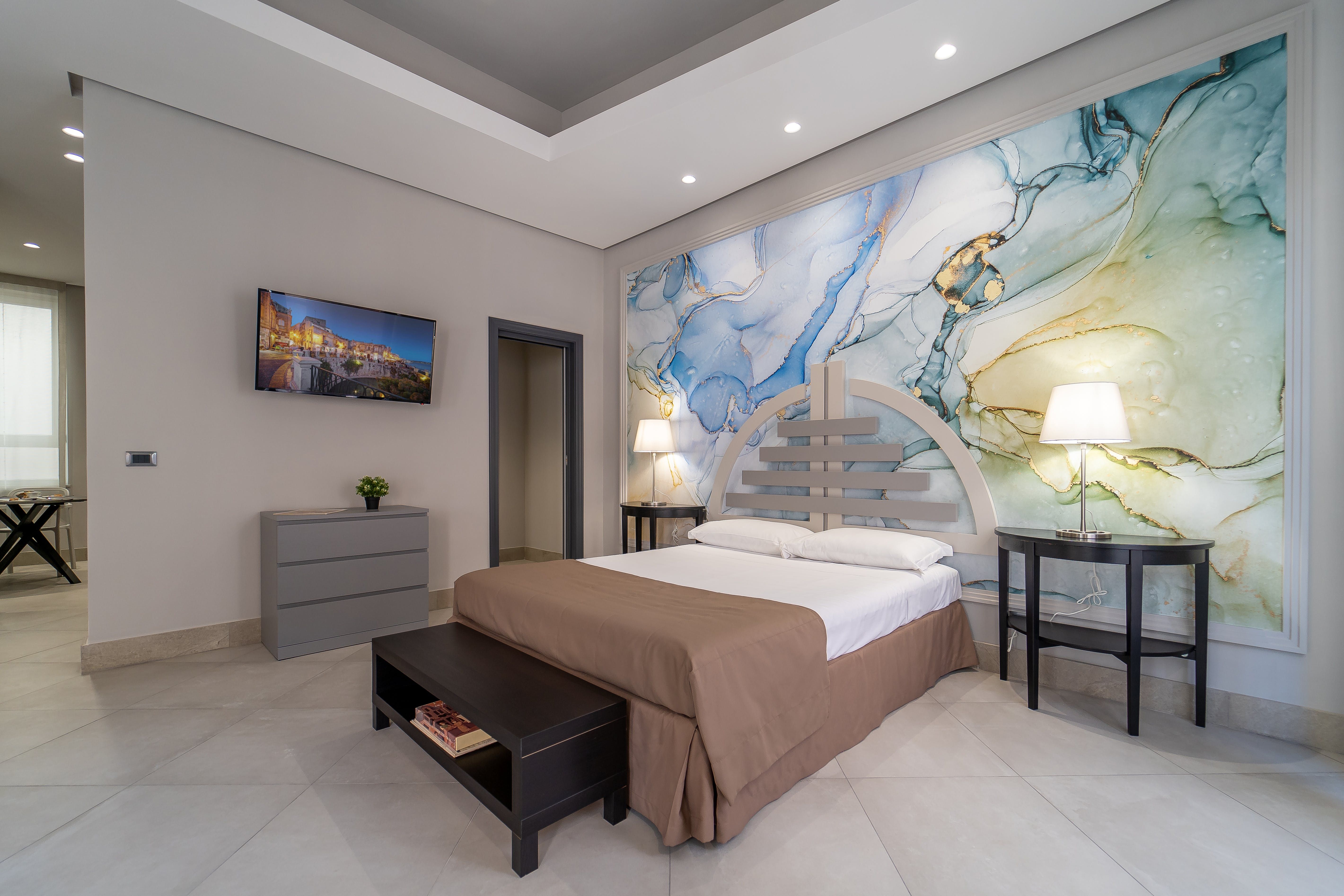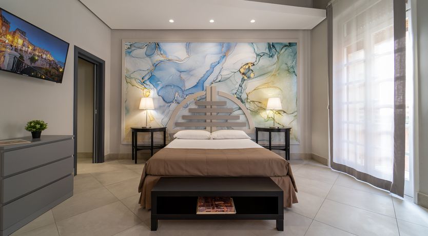 Colourful abstract art and a slick, minimalist design come together in this wonderfully located apartment. Sitting in the heart of Syracuse’s historic centre on the island of Ortigia, you’ve got a wealth of things to see and do right outside your door including the Fontana di Diana, the Cathedral of Syracuse, Cala Rossa Beach and the Castello Maniace.