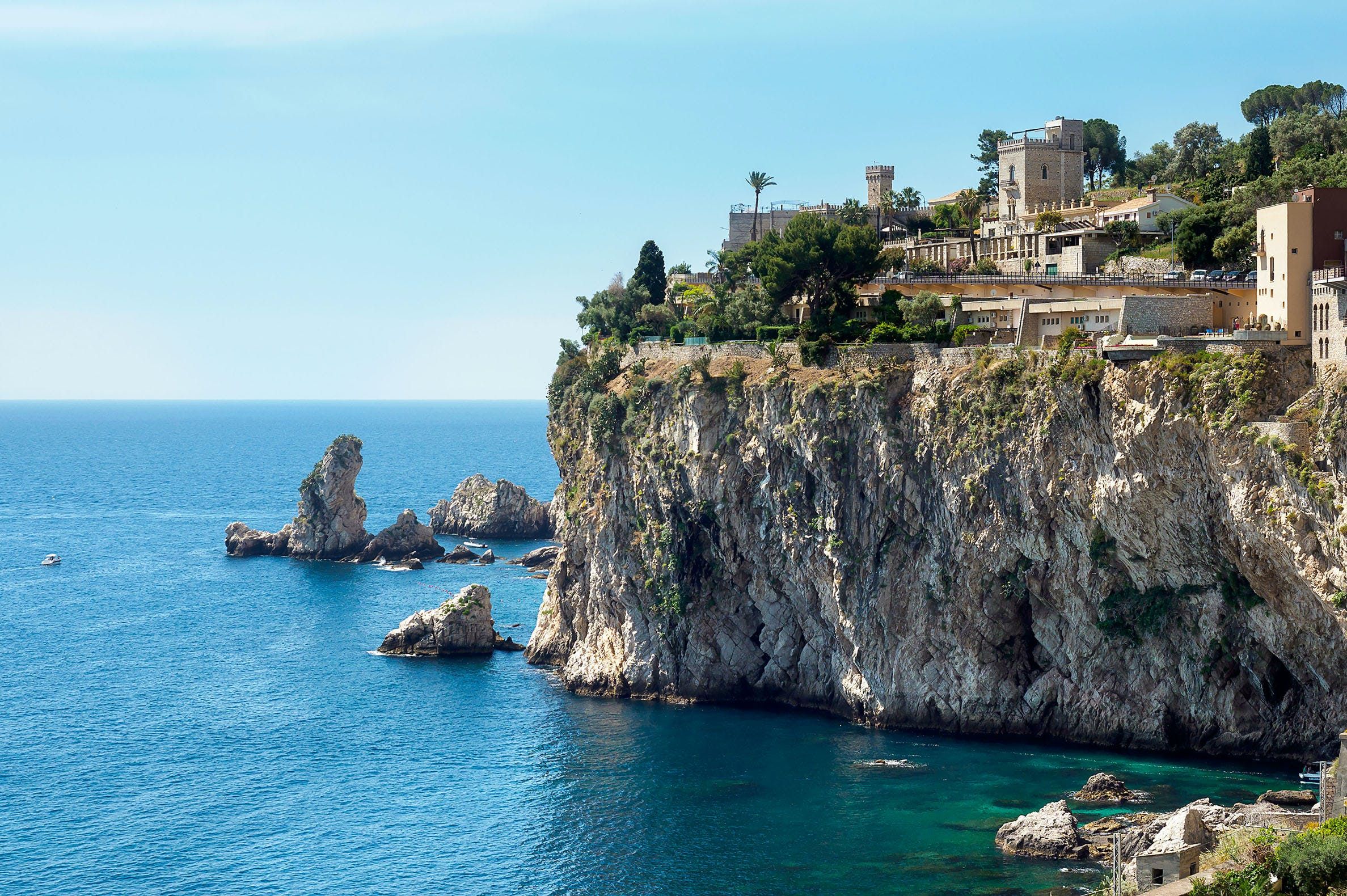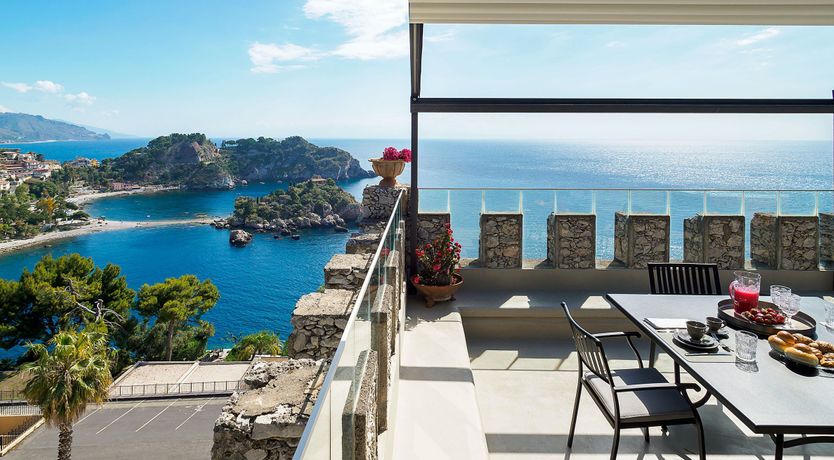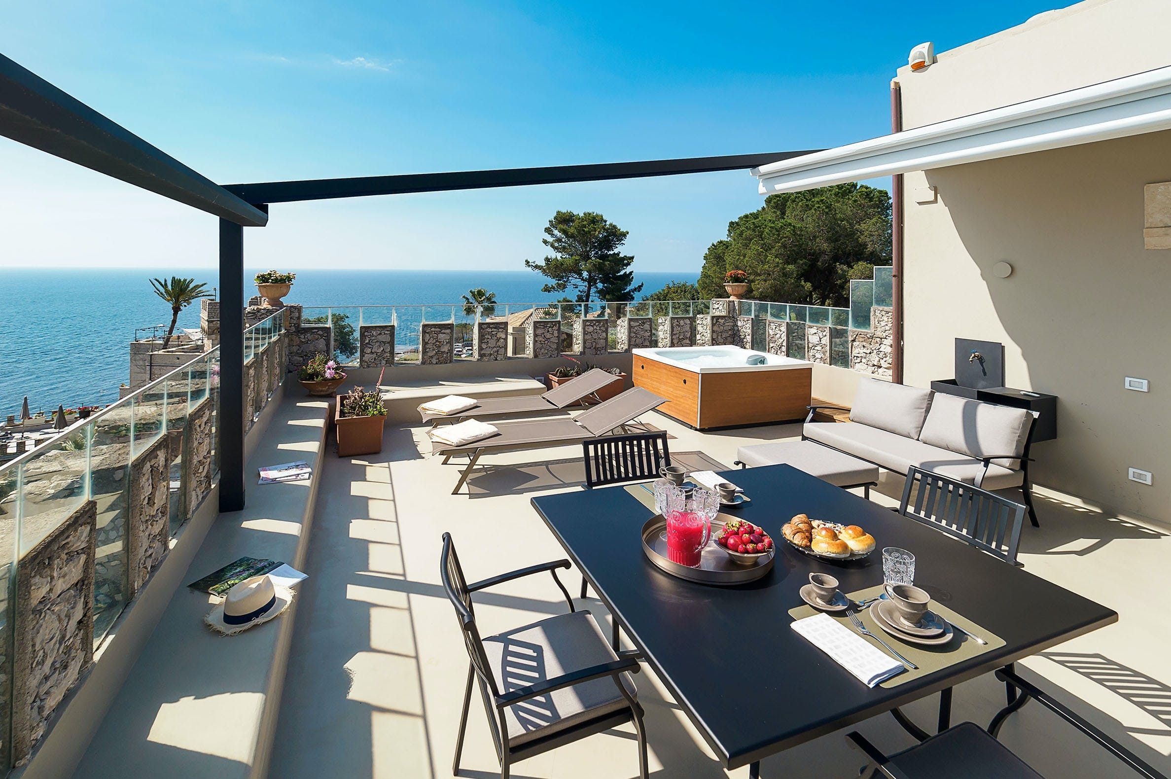 Out-of-this-world vistas take centre stage at this former watchtower overlooking the glistening bay of Isola Bella. Expertly converted with design-savvy interiors, the three-storey home takes full advantage of its stunning location. There's a charming balcony off the free-flowing living area – the perfect spot for your morning coffee. But take it from us – the view is best admired from the private roof terrace, with a hot tub perfectly placed to take in the infinite horizon. Ready to explore? You're just a short walk from the beach and cable car to Taormina's old town for alfresco dining and people-watching in the central piazza.