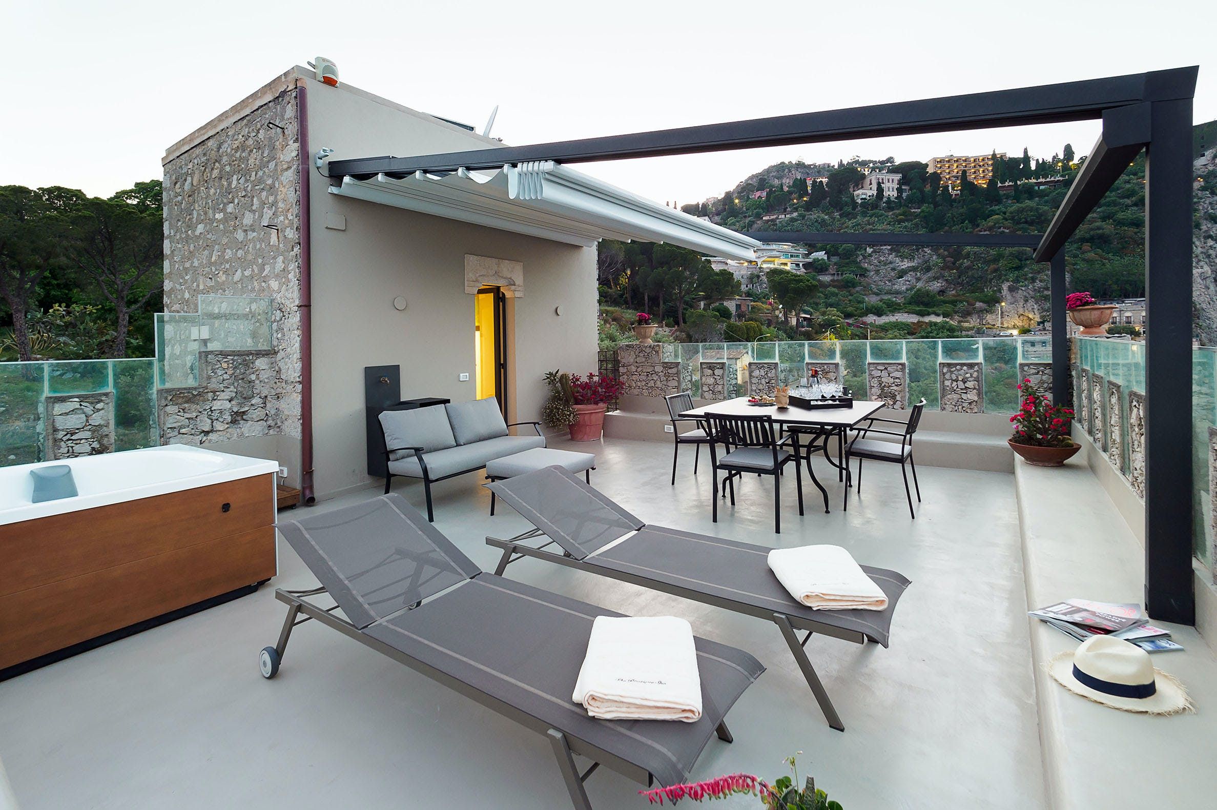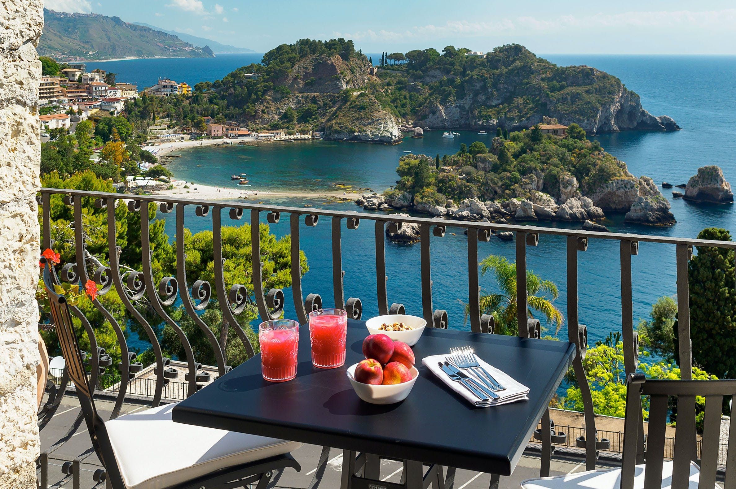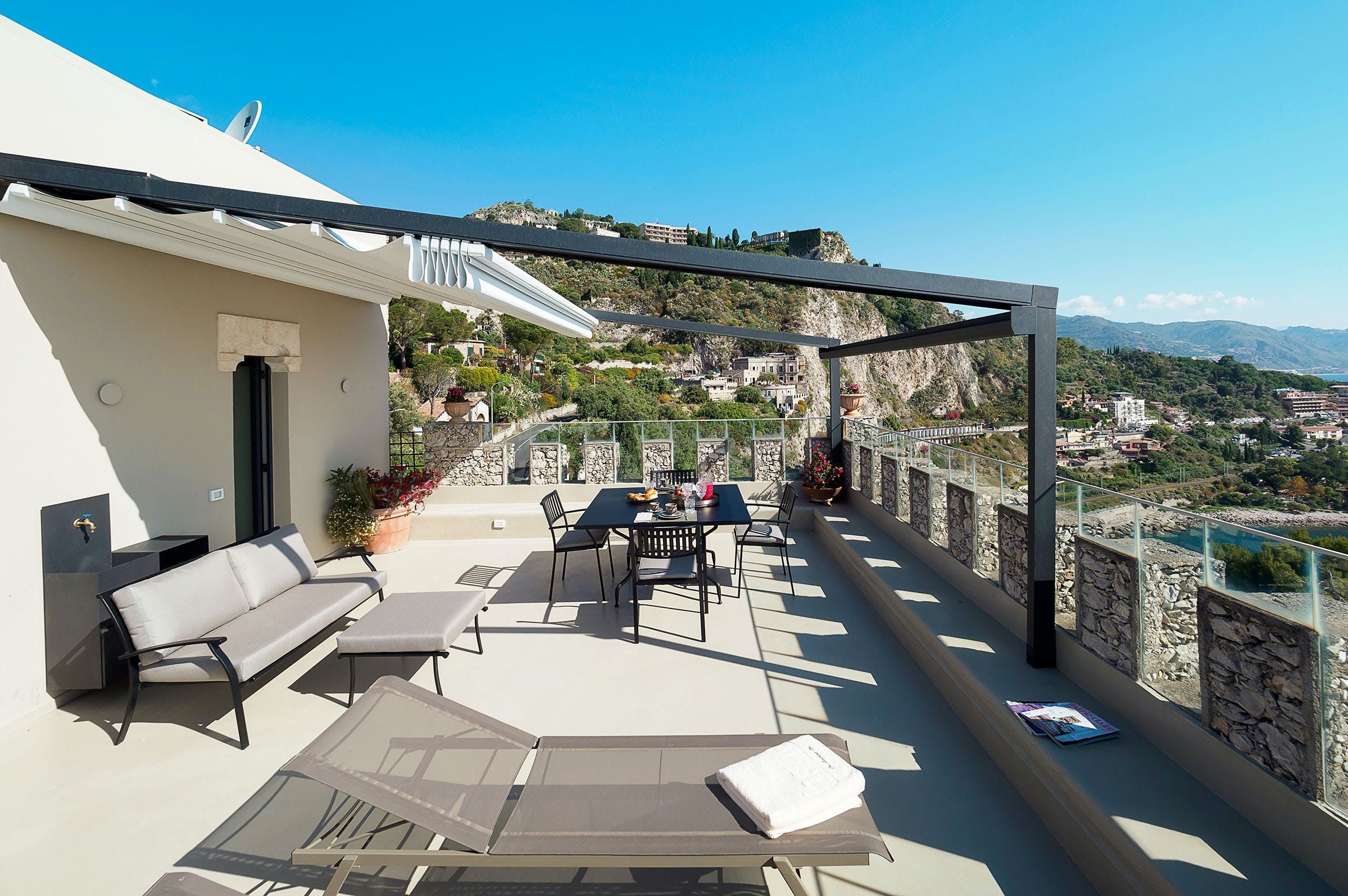 Out-of-this-world vistas take centre stage at this former watchtower overlooking the glistening bay of Isola Bella. Expertly converted with design-savvy interiors, the three-storey home takes full advantage of its stunning location. There's a charming balcony off the free-flowing living area – the perfect spot for your morning coffee. But take it from us – the view is best admired from the private roof terrace, with a hot tub perfectly placed to take in the infinite horizon. Ready to explore? You're just a short walk from the beach and cable car to Taormina's old town for alfresco dining and people-watching in the central piazza.