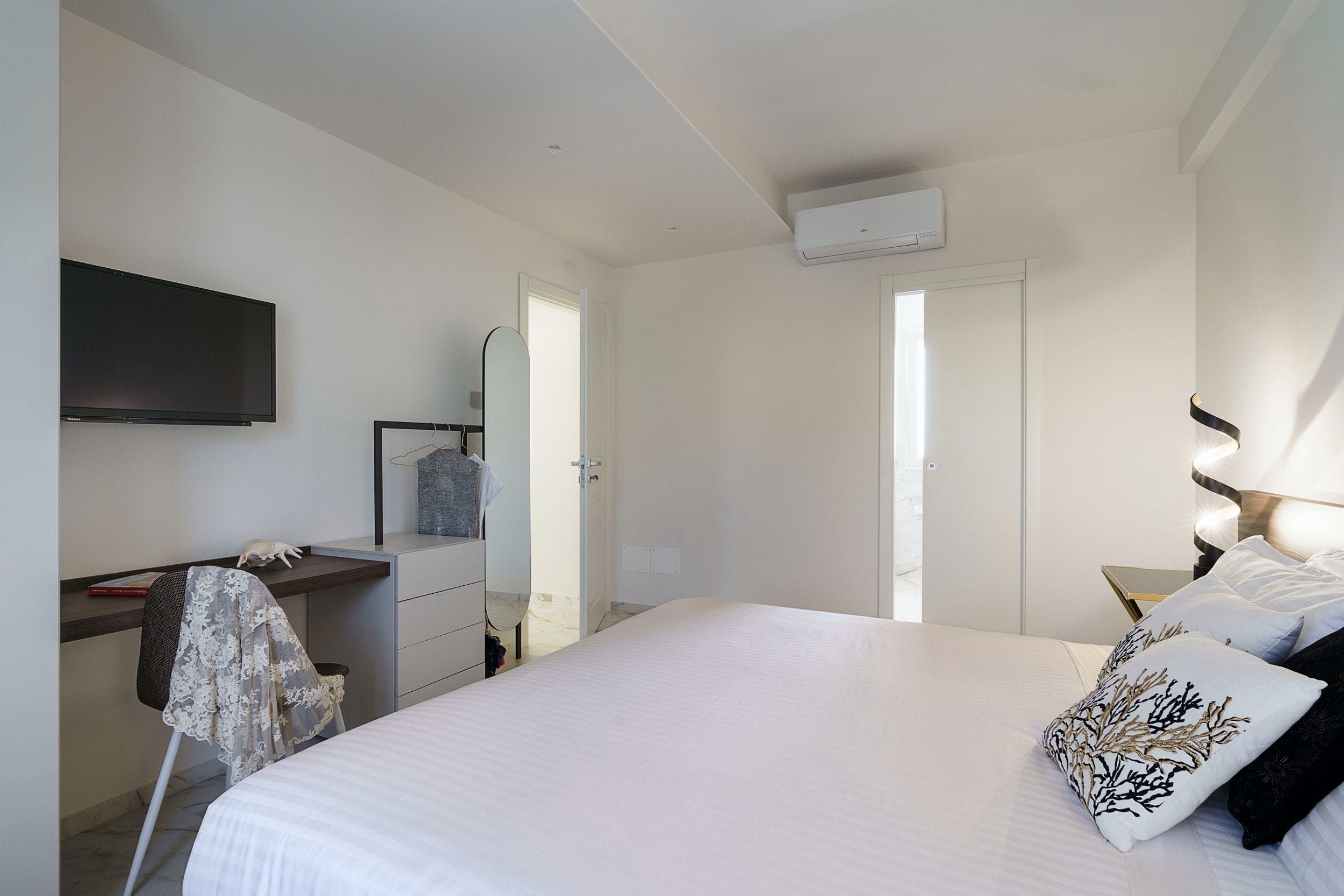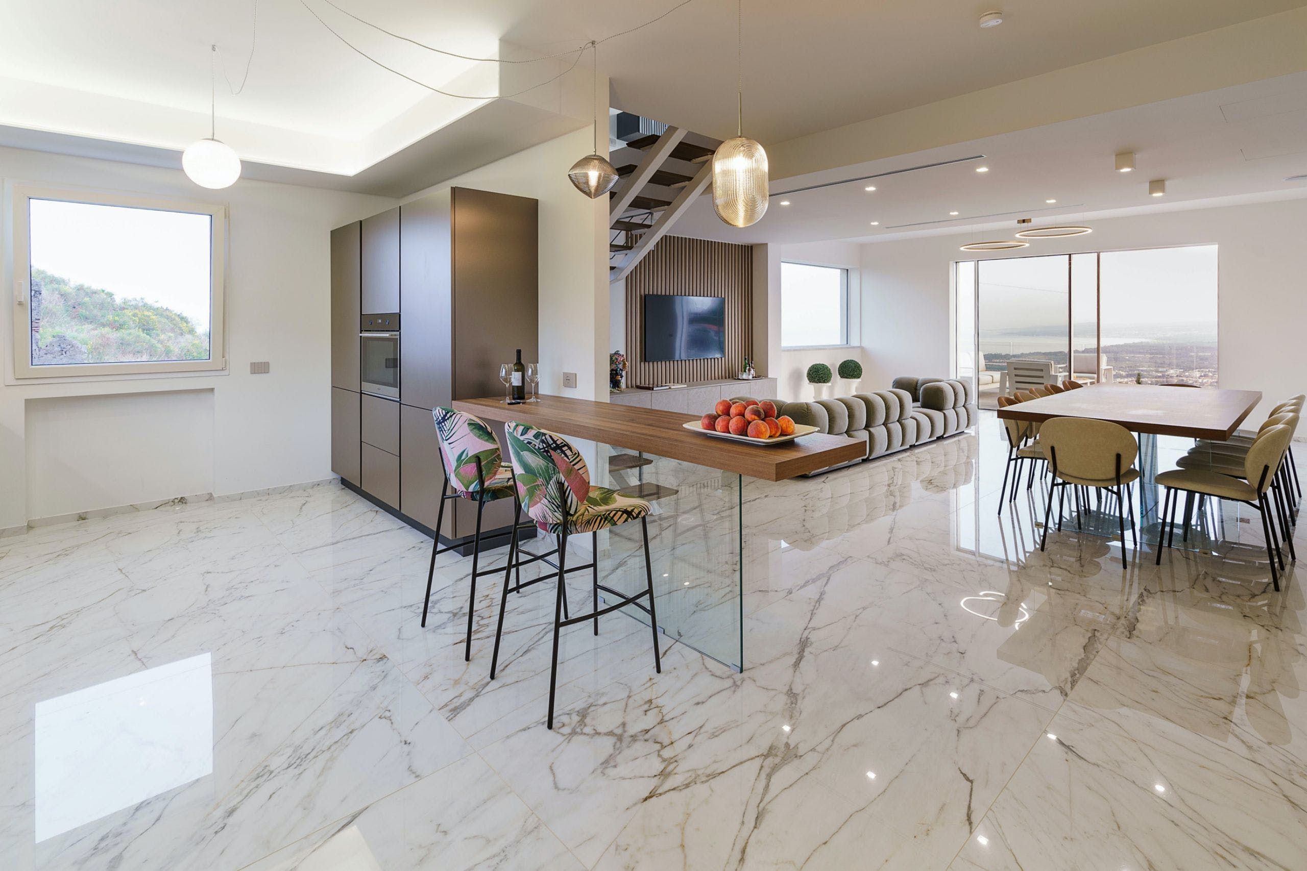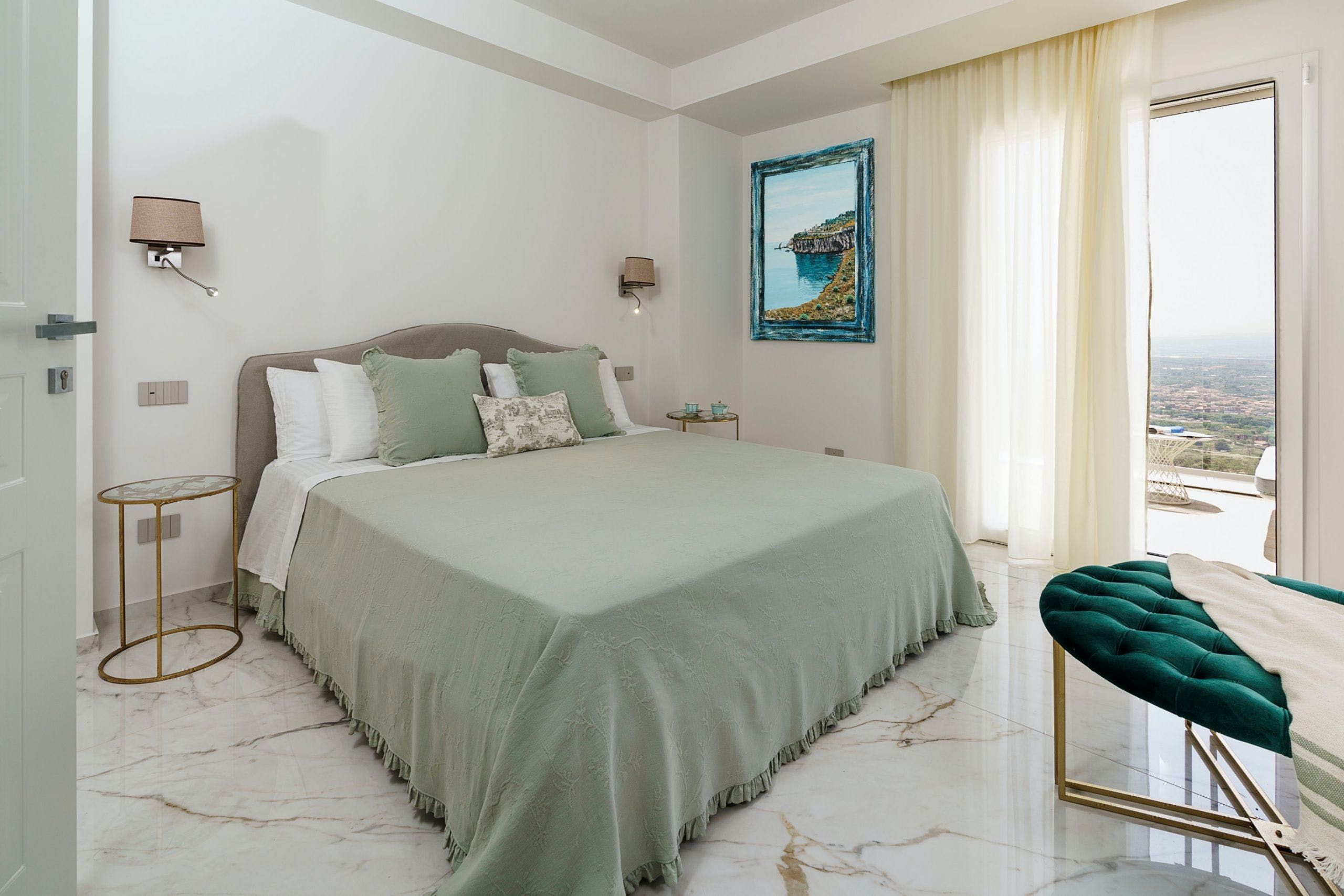 This villa is all about the views. Perched on Sicily’s east coast, it looks out over the Ionian Sea, with Mount Etna rising in the distance. Days are spent padding between the pool, shaded terraces, and sun-drenched loungers. Inside, it’s all cool marble floors, clean lines, and a kitchen made for long, lazy meals – whether you’re perched at the breakfast bar or gathered around the table. Taormina is just 7km away, but here you’ll enjoy the same cinematic backdrop without the crowds. And when the beach calls? It’s only 4km from your door.