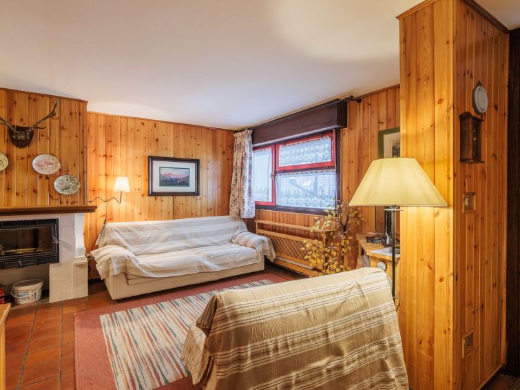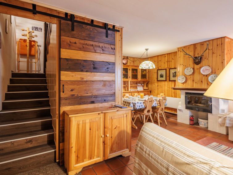 "Boiserie", 3-room apartment. Bright, with sloping ceilings, comfortable and cosy furnishings: living/dining room with open-hearth fireplace (only for decoration), TV and flat screen. Exit to the garden. Open kitchen (dishwasher, 4 induction hot plates, microwave). Upper floor: 1 double bedroom with 1 double bed.