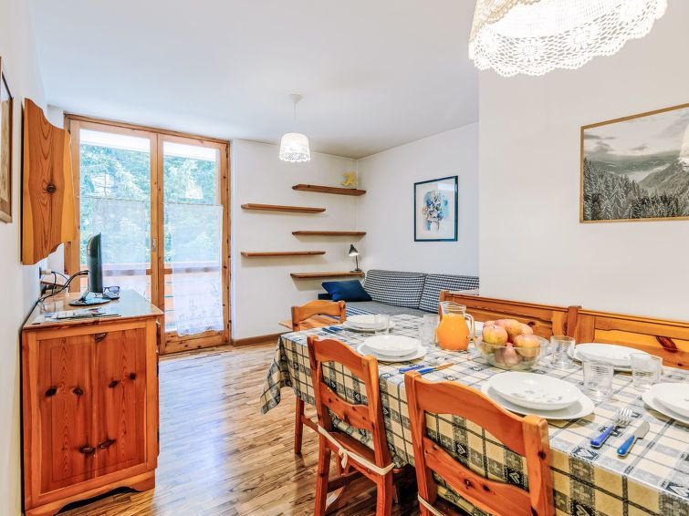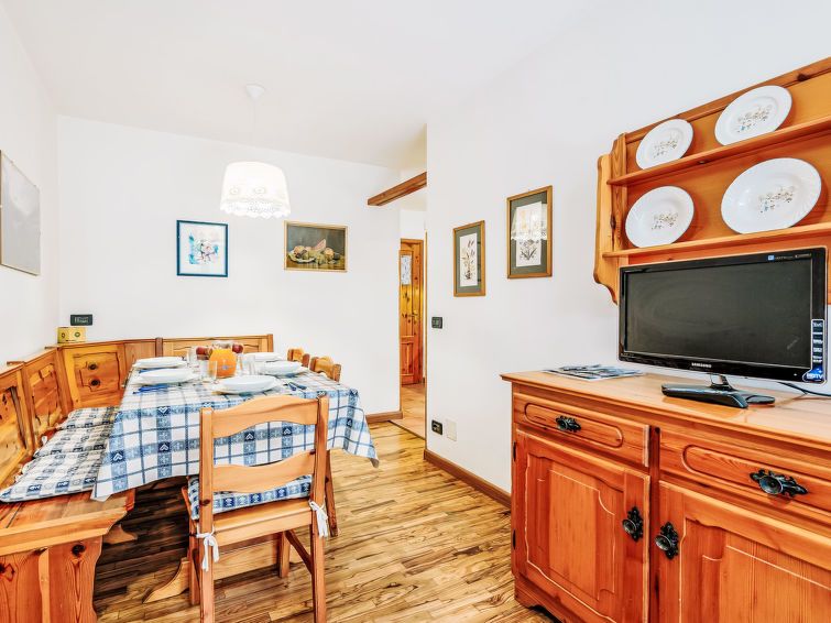 "Condominio Val di Fassa", 2-room apartment 45 m2 on 1st floor. Simple and comfortable furnishings: living/dining room with 1 double sofabed and TV. Exit to the balcony. 1 double bedroom. Kitchenette in the entrance (oven, dishwasher, 4 ceramic glass hob hotplates, toaster, kettle).