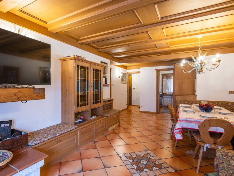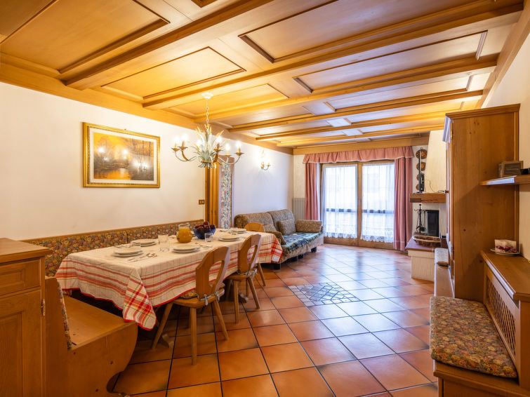 "Corte dei Larici", 3-room apartment on the ground floor. Comfortable and cosy furnishings: entrance hall. Living/dining room with open-hearth fireplace (only for decoration), dining table. Exit to the garden. 1 room with 1 bed and 1 x 2 bunk beds. 1 double bedroom. Kitchen (oven, dishwasher, 4 induction hot plates).