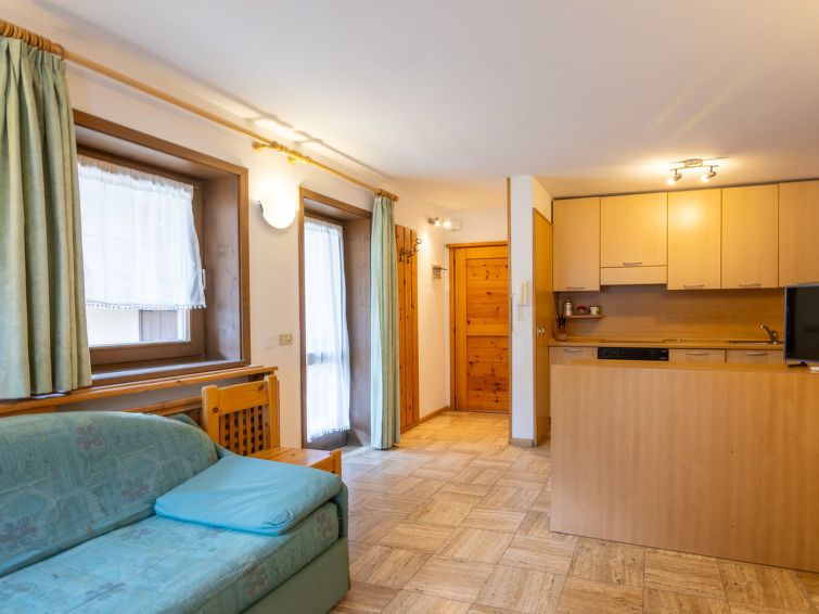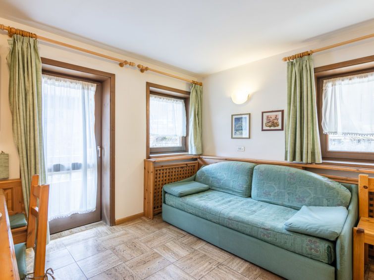 3-room apartment on 1st floor. Practical and comfortable furnishings: living/dining room with 1 sofabed and Scandinavian wood stove (only for decoration), dining table. Exit to the balcony. 1 double bedroom. 1 room with 1 bed. Open kitchen (4 hot plates, oven, dishwasher). Shower/bidet/WC.