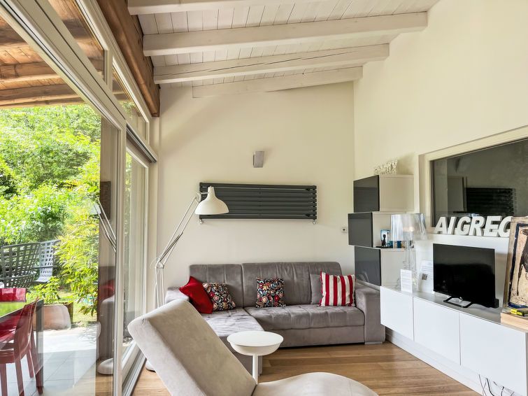 2-room house 60 m2 on 2 levels. Comfortable and tasteful furnishings: living/sleeping room with panoramic window with 1 sofabed, Scandinavian wood stove and satellite TV. Exit to the patio. Kitchen (oven, dishwasher, 4 induction hot plates, kettle, microwave, electric coffee machine).