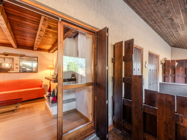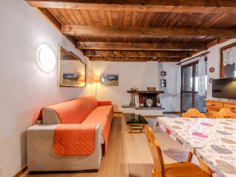 "Mansarda al Doss", 3-room maisonette 60 m2 on 3rd floor. Spacious, partly with sloping ceilings, simple and practical furnishings: living/dining room with 1 sofabed (160 cm, length 190 cm), open-hearth fireplace (only for decoration), dining table and TV. Exit to the balcony. Kitchenette (oven, 4 gas rings, freezer).