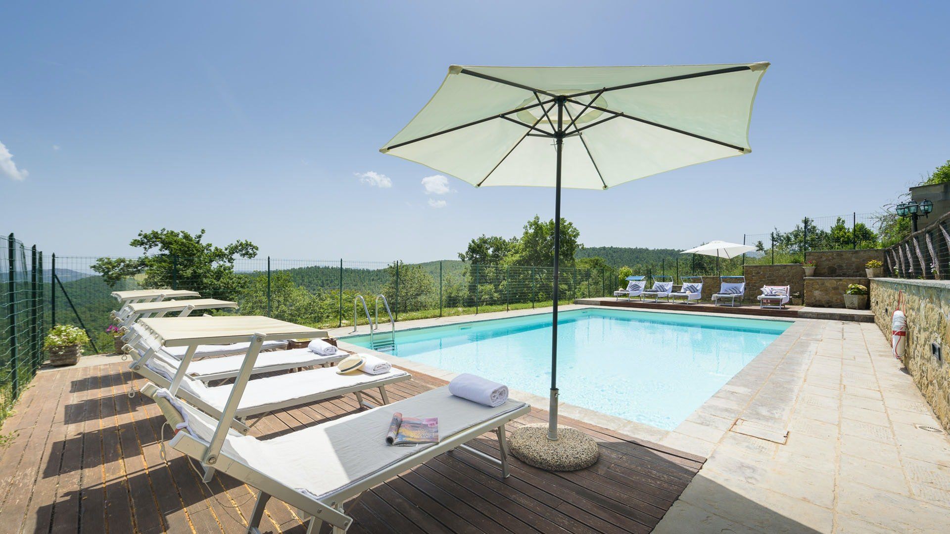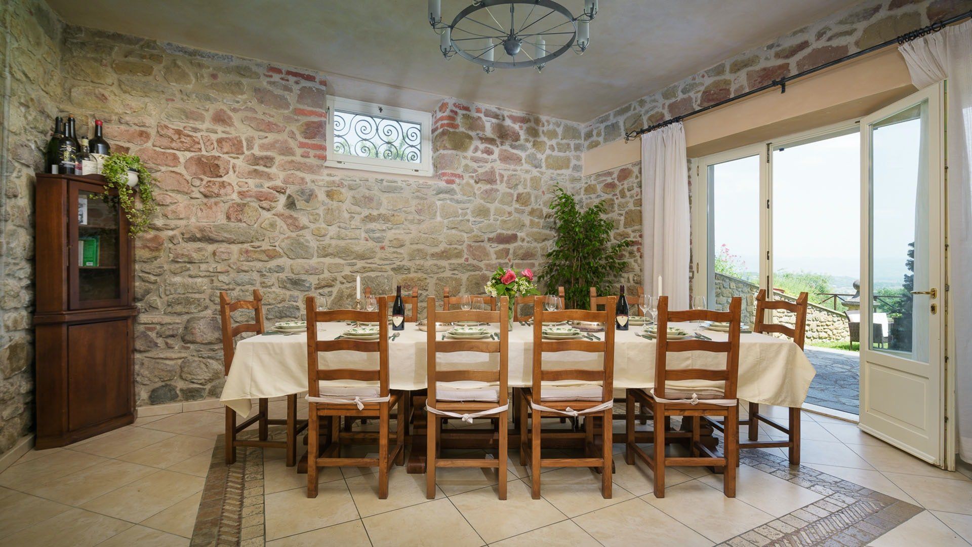 Built into a slope, with three floors, this imposing period villa is a piece of Tuscan nostalgia. With shuttered windows, bedroom balconies and a top floor covered balcony for admiring the stunning views, it's a real slice of local life. The feel here is very lived-in, with each room boasting a unique character. None more so than the formal games room, painted a deep red, where you'll find a huge antique dining table, a chandelier and – of course – a suit of armour. Elsewhere, there are cool, neutral living spaces with exposed stone walls, a modern kitchen and enough bedrooms and bathrooms to give a large family or a big group of friends plenty of space. There's even a second kitchen in the annexe, so part of your group can have extra independence.