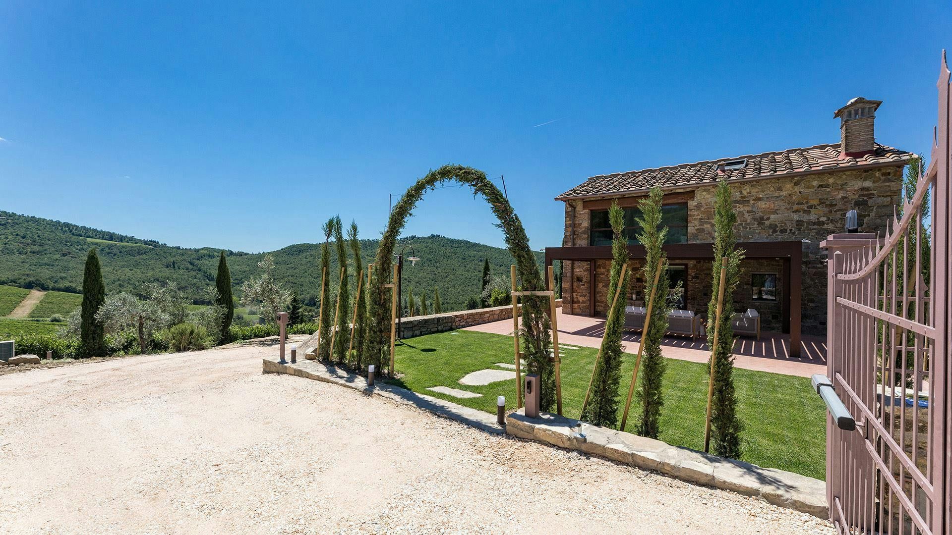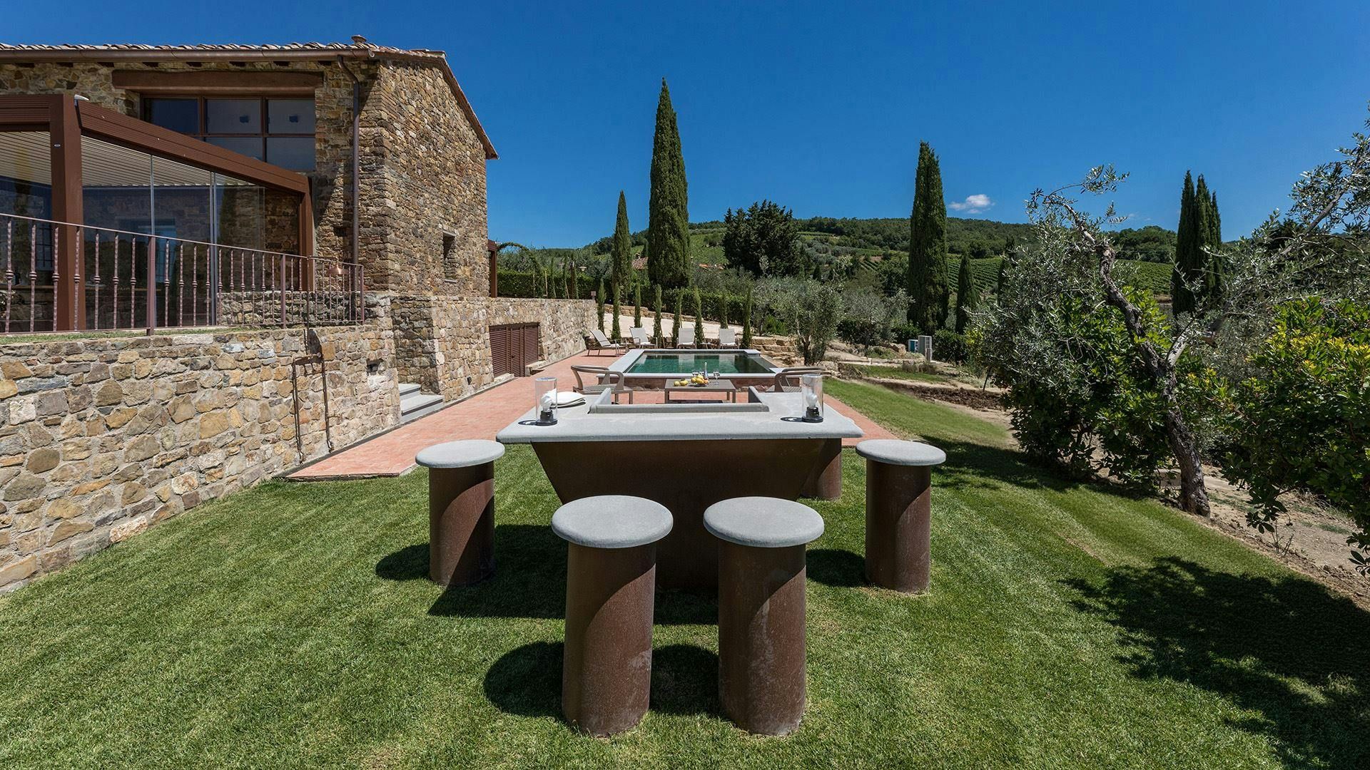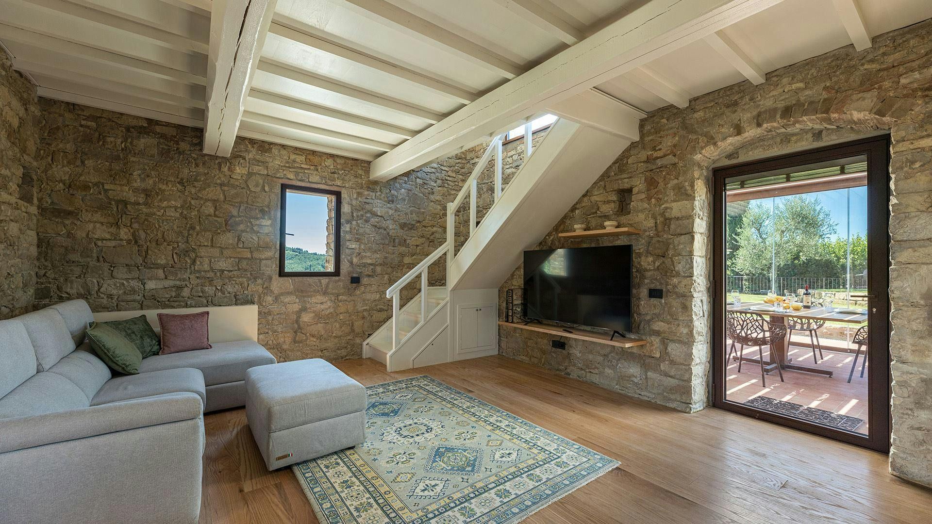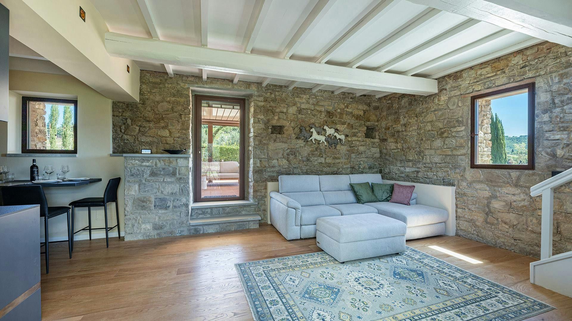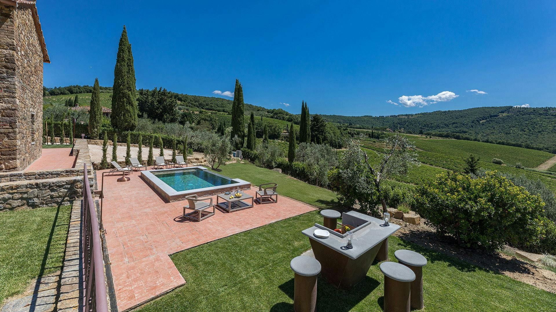 A former ancient guard's post, this restored home effortlessly blends character details with contemporary features. The living space boasts exposed stone walls and white-washed beams, yet it has all you need to relax comfortably. You can even glimpse the old peepholes the guards used. But it's the outdoor space that really shines. Two terraces offer endless opportunities for alfresco dining, while the swimming pool (which can be heated for a fee) is as refreshing as it looks. When you're ready to explore, you can walk into the tiny hamlet of Badia a Passignano or hit the road and discover Greve in Chianti, San Gimignano, and Florence by car.