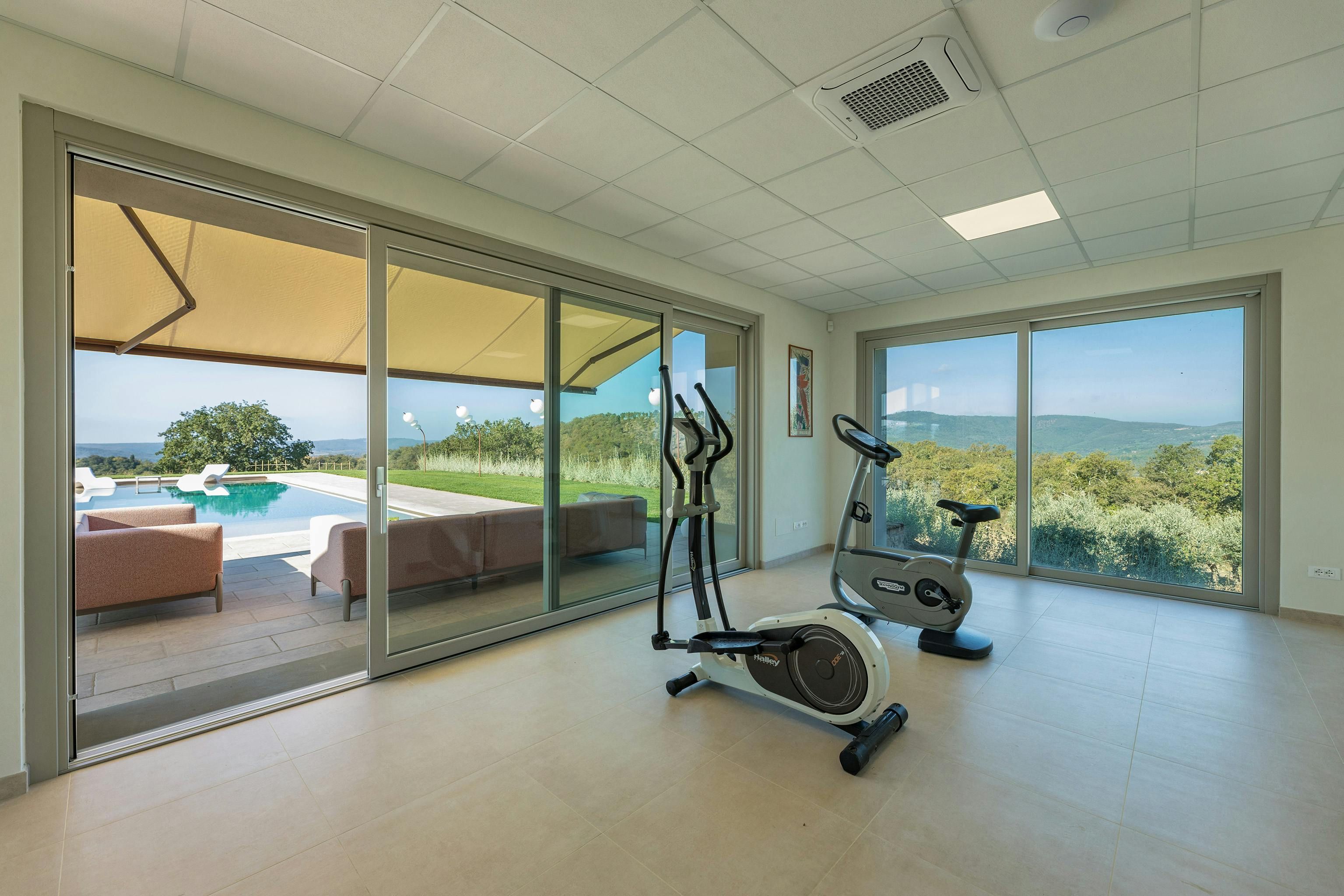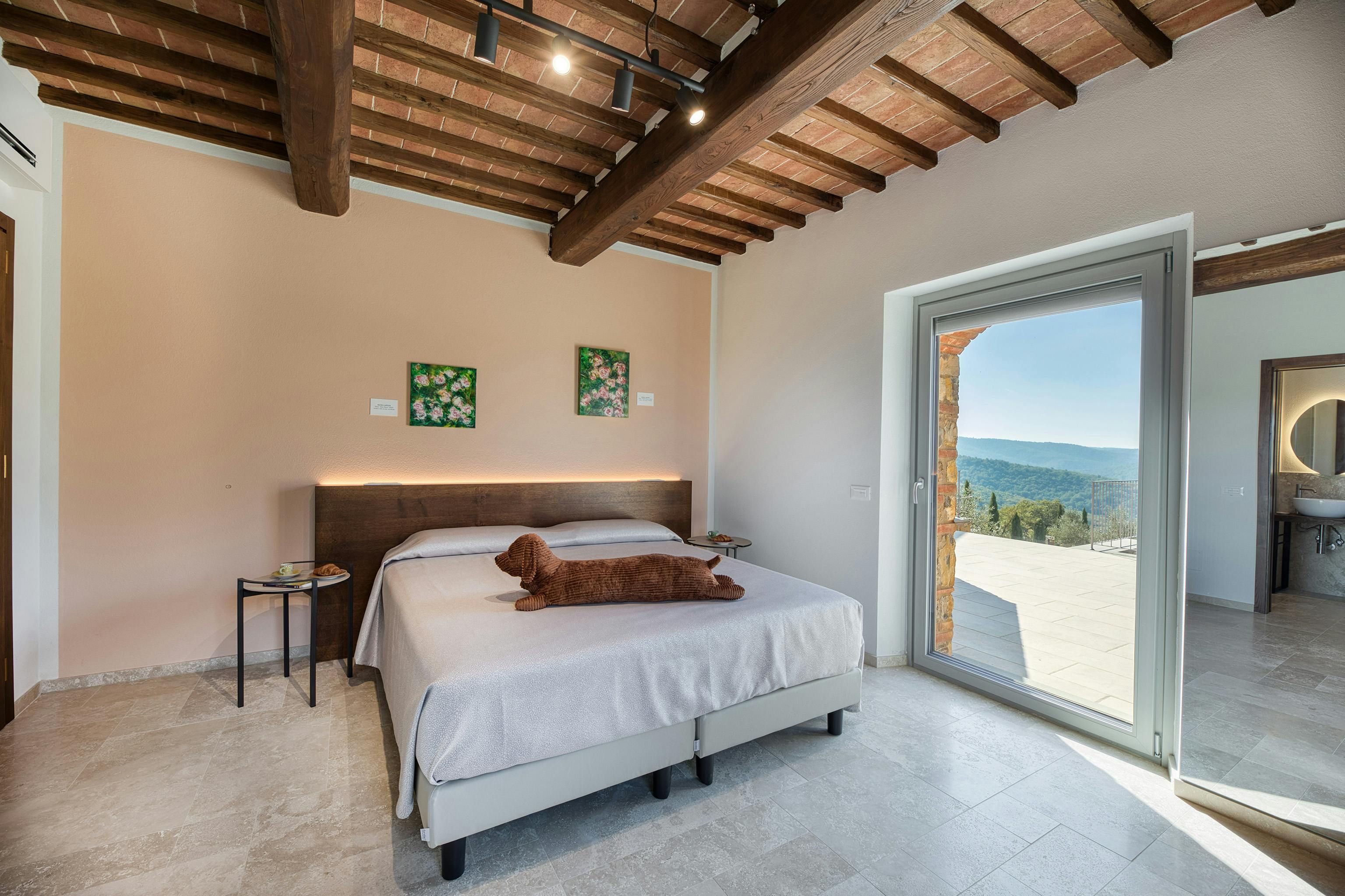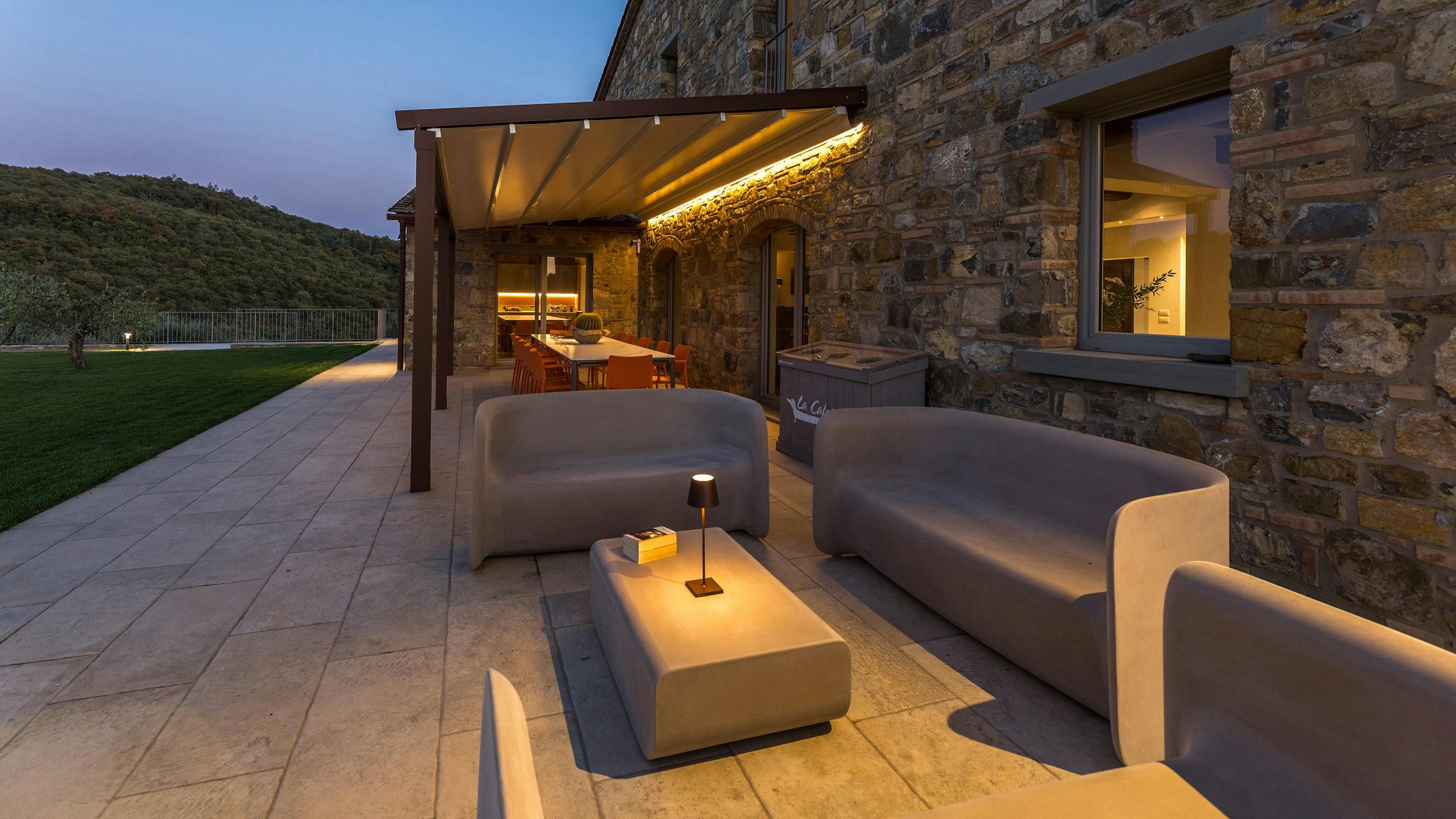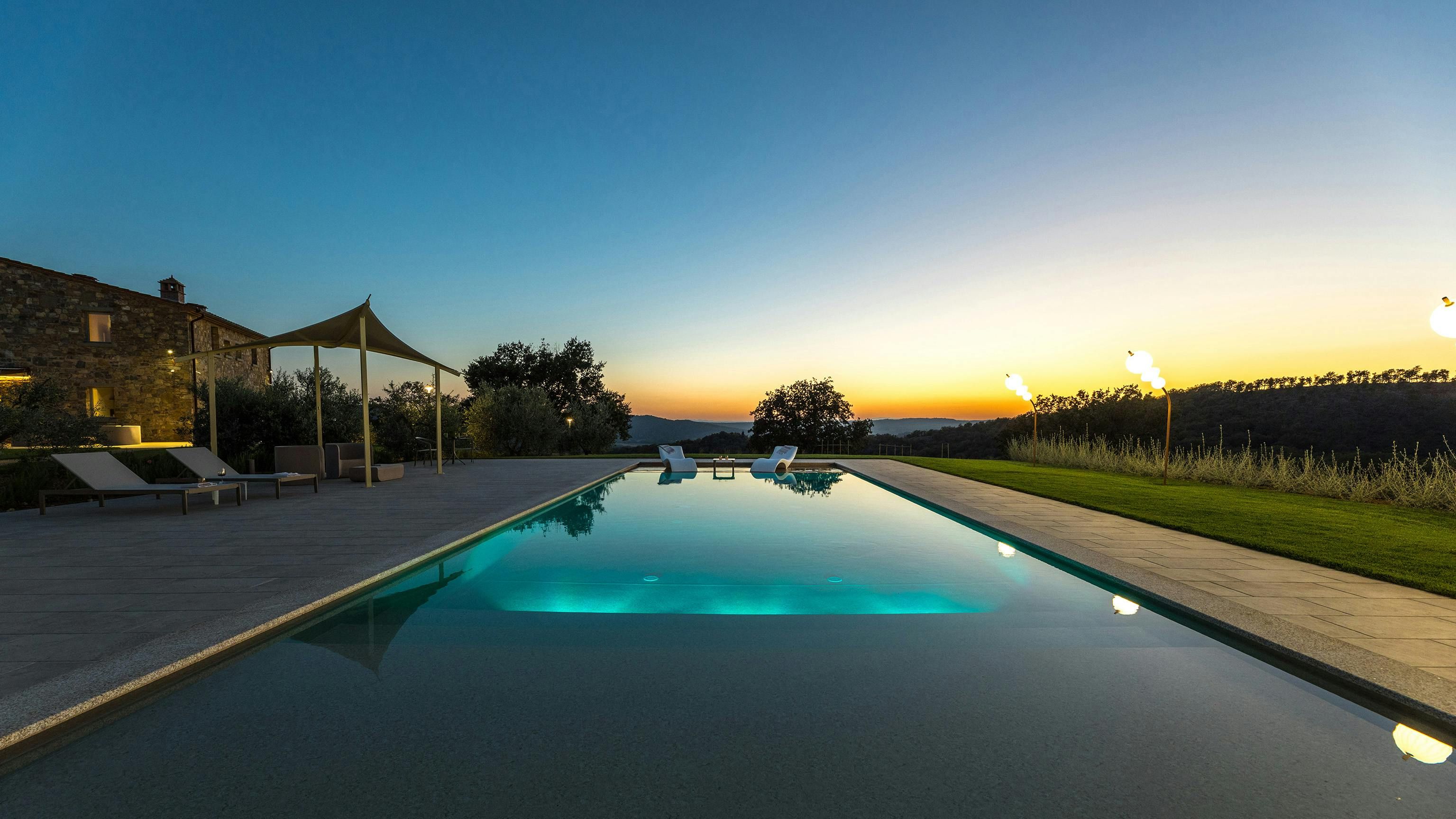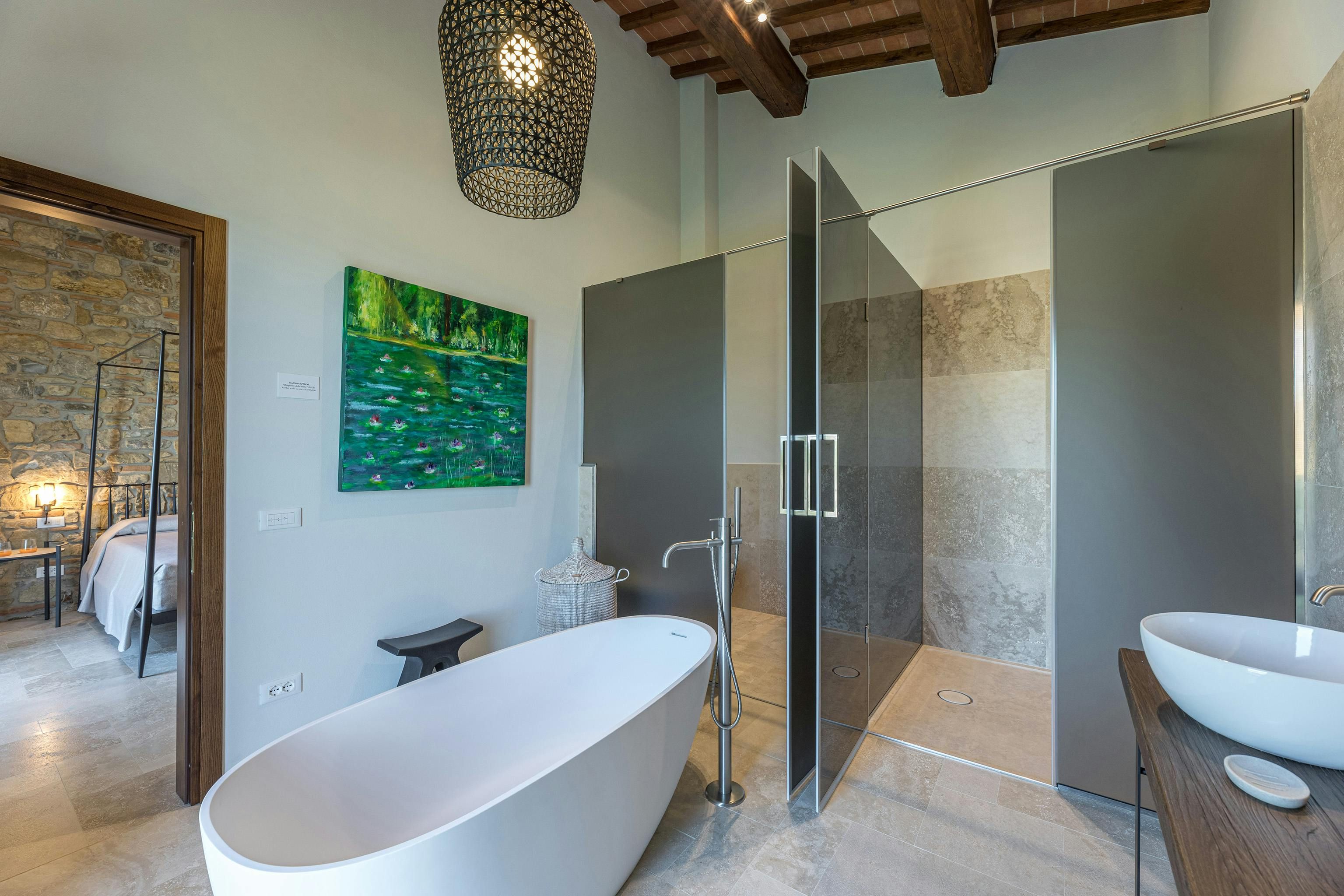 Views of the verdant hills surrounding this home make it a splendid spot for relaxation. The villa boasts a gym, yoga, and massage space in an annex near the swimming pool, within the well-kept garden. Dine under a pergola while watching the sun set over the Val d’Orcia, after a day spent outside in the sunshine. The stone-clad main house and renovated barn have classic Italian features including exposed wooden beams, but these are combined with modern furniture and art. The result? A stylish home-from-home perfect for a large group.