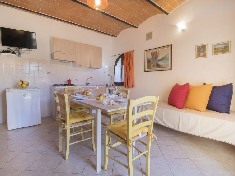 2-room apartment 40 m2, on the ground floor. Very simple and rustic furnishings: living room with 1 double sofabed, kitchen corner and TV. 1 double bedroom. Exit to the patio. Shower/bidet/WC. Heating (extra). Small patio. Terrace furniture. Facilities: Internet (WiFi, free). Please note: maximum 1 pet/ dog allowed.