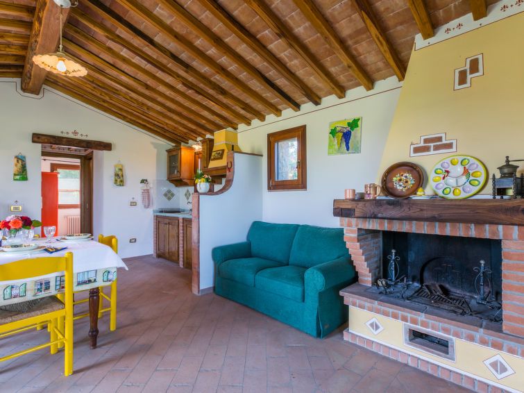 "Rustico", 3-room house 68 m2. Cosy furnishings: living/sleeping room with 1 sleeping facility, open-hearth fireplace and TV. Exit to the patio. 1 double bedroom. 1 room with 1 french bed (1 x 140 cm, length 195 cm). Kitchenette (Gas stove, 4 gas rings, toaster, kettle, microwave, electric coffee machine) with dining table.