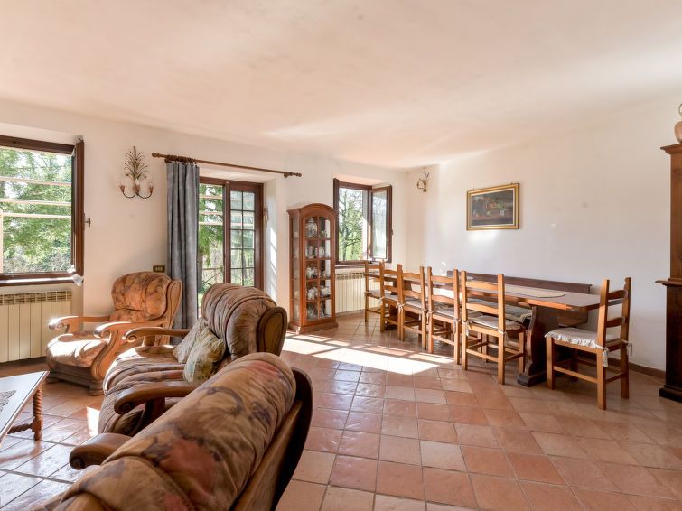 5-room house 130 m2 on 2 levels. Spacious, practical and rustic furnishings: living/dining room with open-hearth fireplace, dining table and TV. Exit to the terrace. Kitchen (mini-oven, 4 gas rings, toaster, electric coffee machine). Bath/bidet/WC, double hand-basin. Upper floor: 3 double bedrooms.