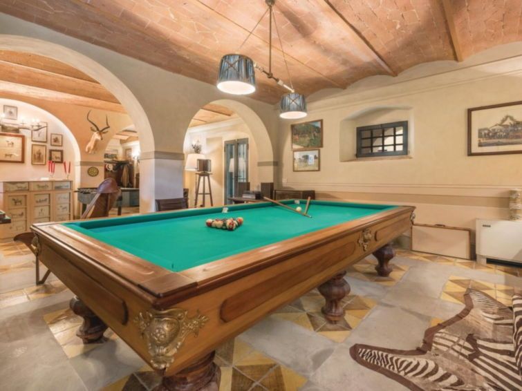 12-room house 700 m2 on 3 levels. Comfortable and stylish furnishings: entrance hall. Playroom. Billiard room. Upper floor: lounge. Living room with open-hearth fireplace and TV. Large dining room. Small dining room with TV. 2 double bedrooms, each room with shower/bidet/WC. 1 double bedroom with bath/bidet/WC.
