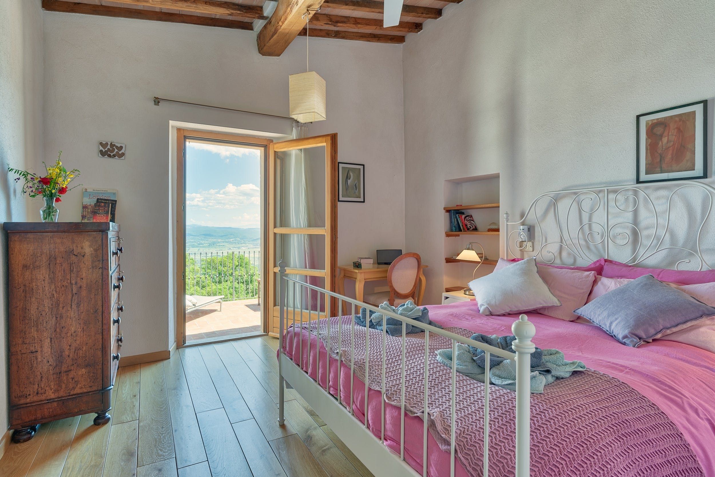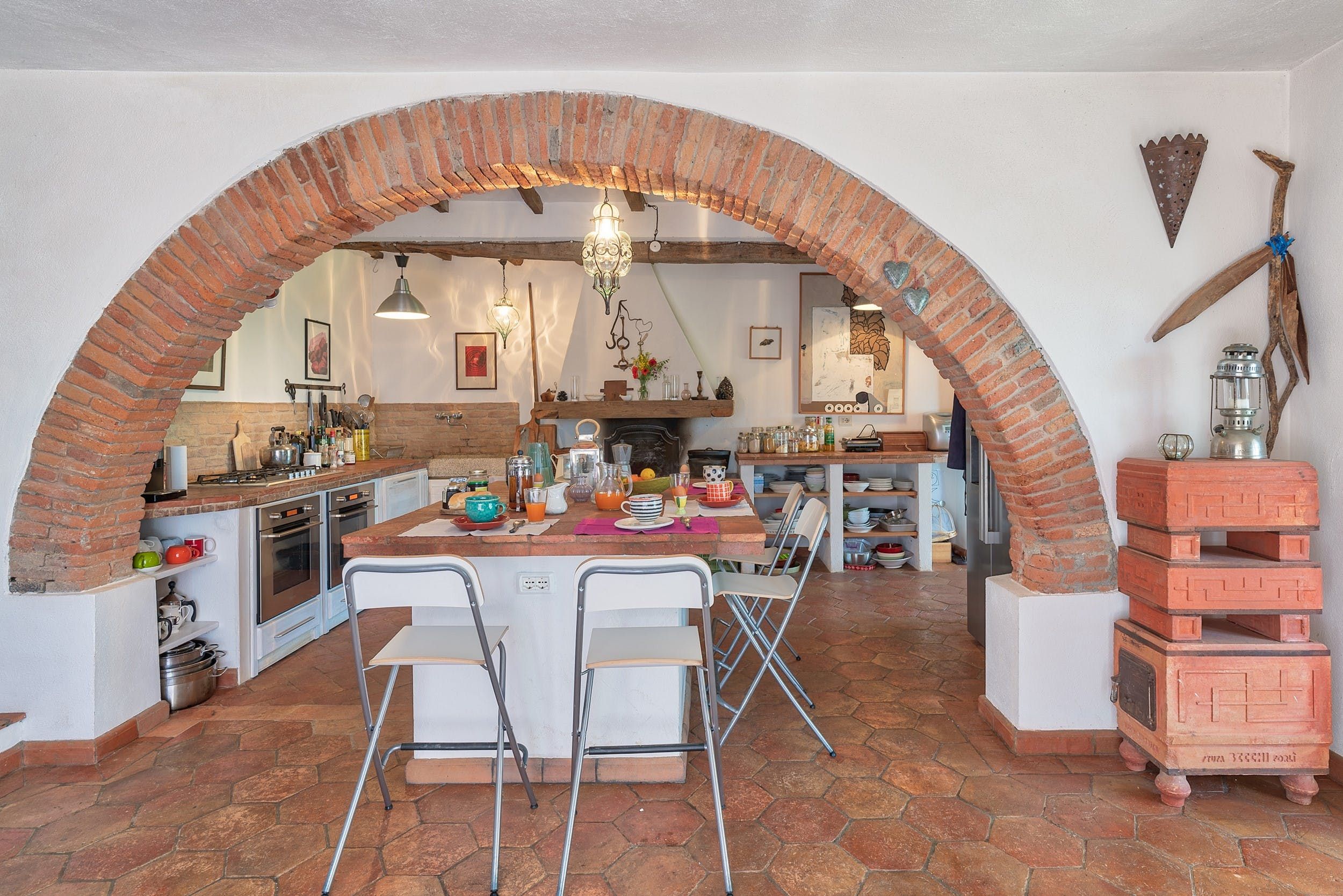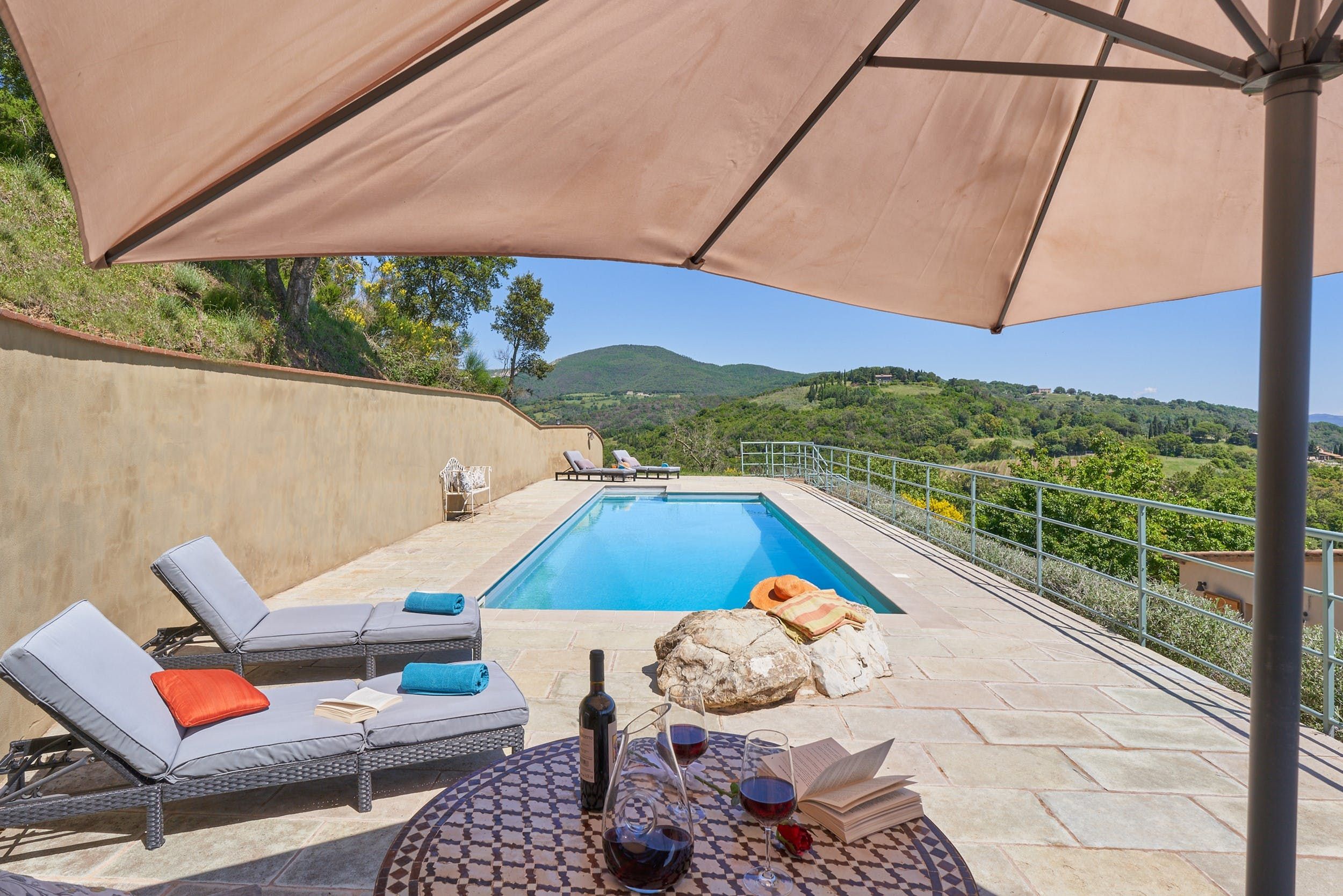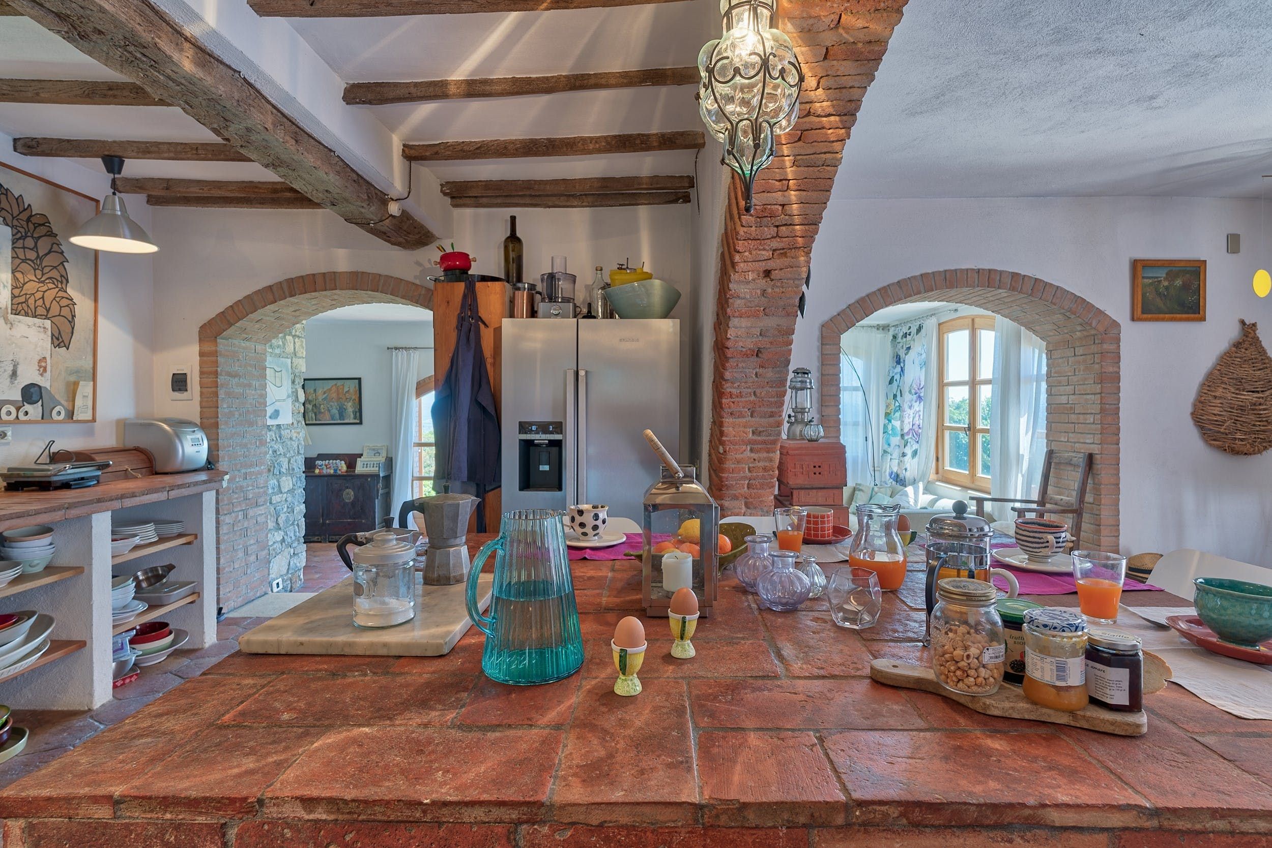 The villa's interior retains plenty of its traditional features, from the terracotta tiles and wooden ceiling beams to the brick archway leading into the kitchen. Embrace your inner nonna and whip up your favourite Italian dishes in this charming space, or ask your host to arrange a private chef to take on catering duties. You'll love dining outside on the terrace, as you admire the stunning views across the hills. And, there's plenty more outdoor space to enjoy – plunge into the swimming pool before drying off on a sun lounger or enjoy some peace and quiet with a coffee on the balcony.