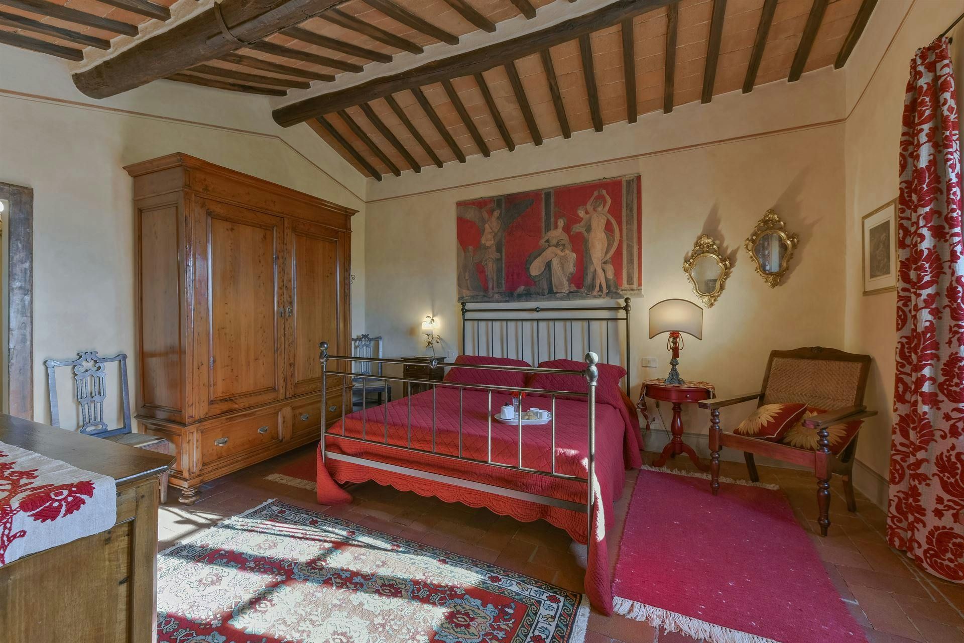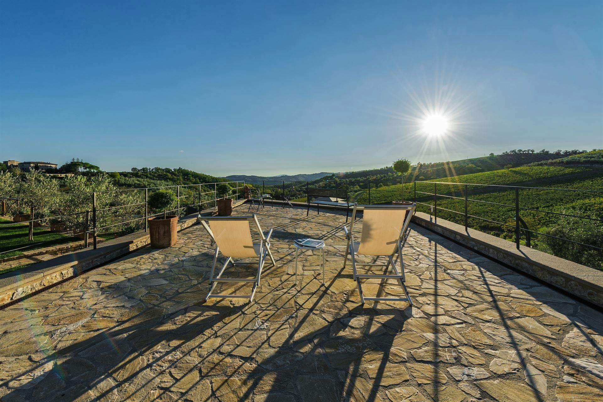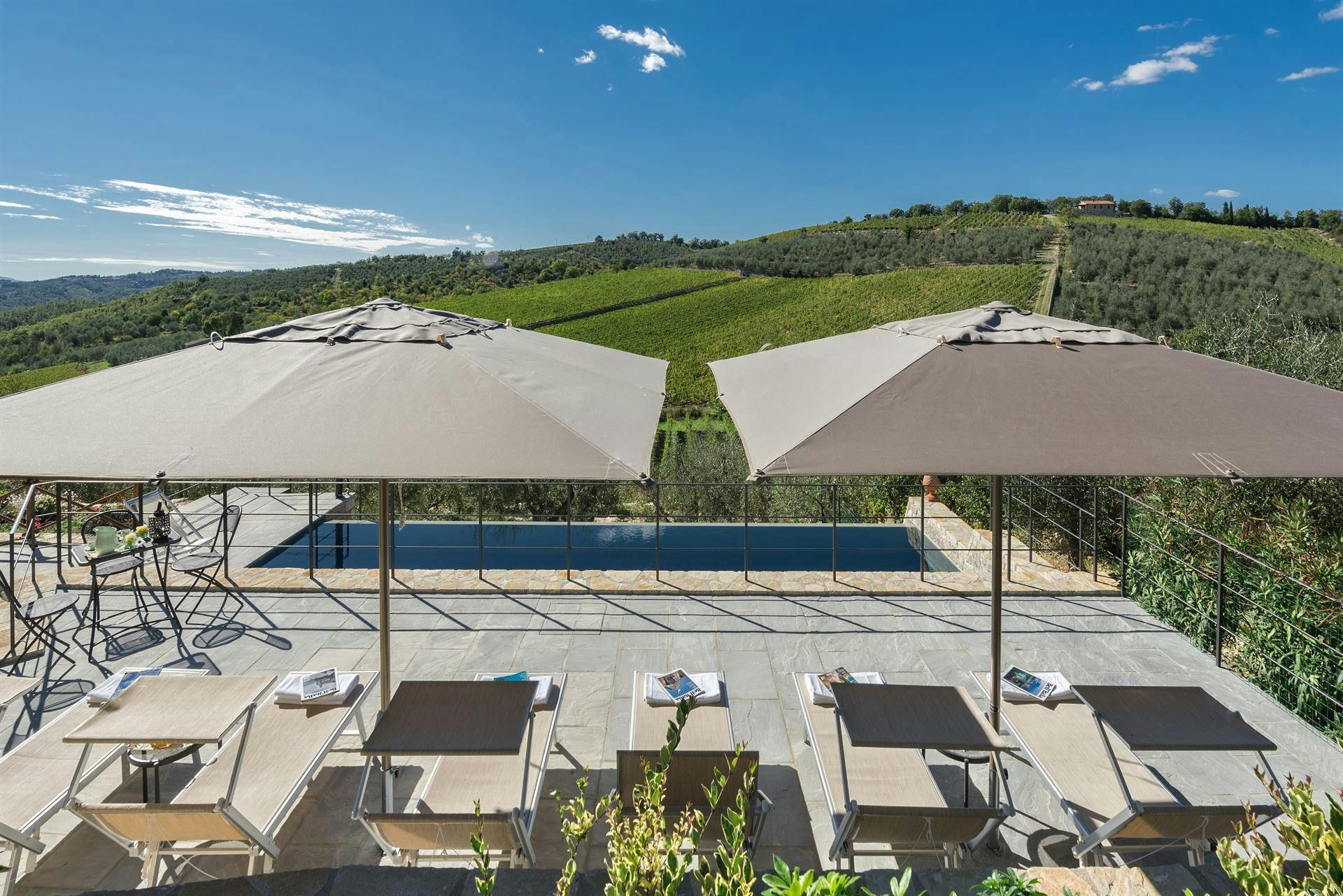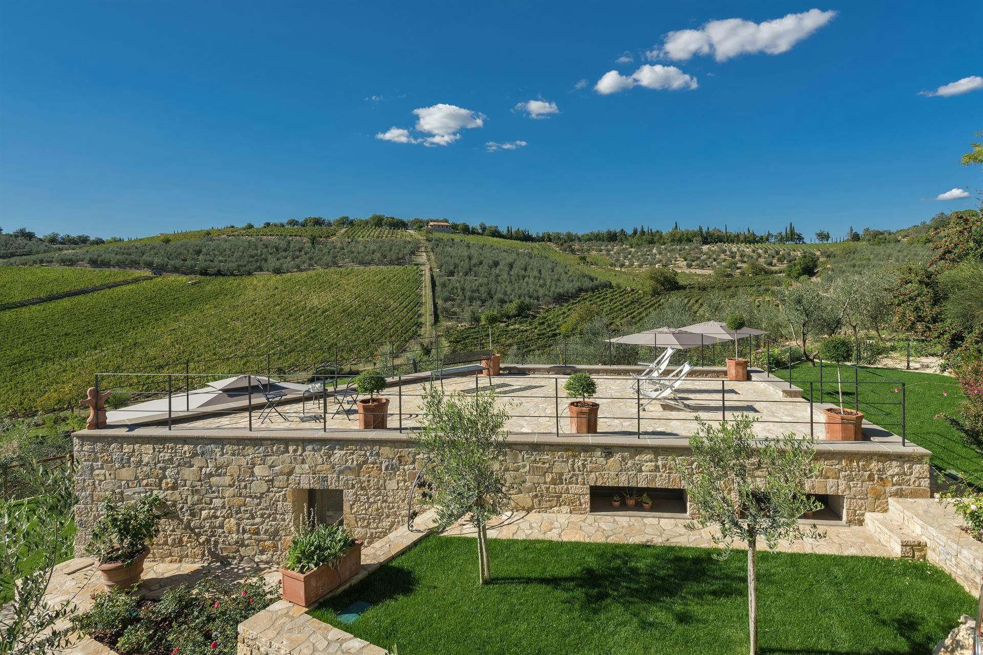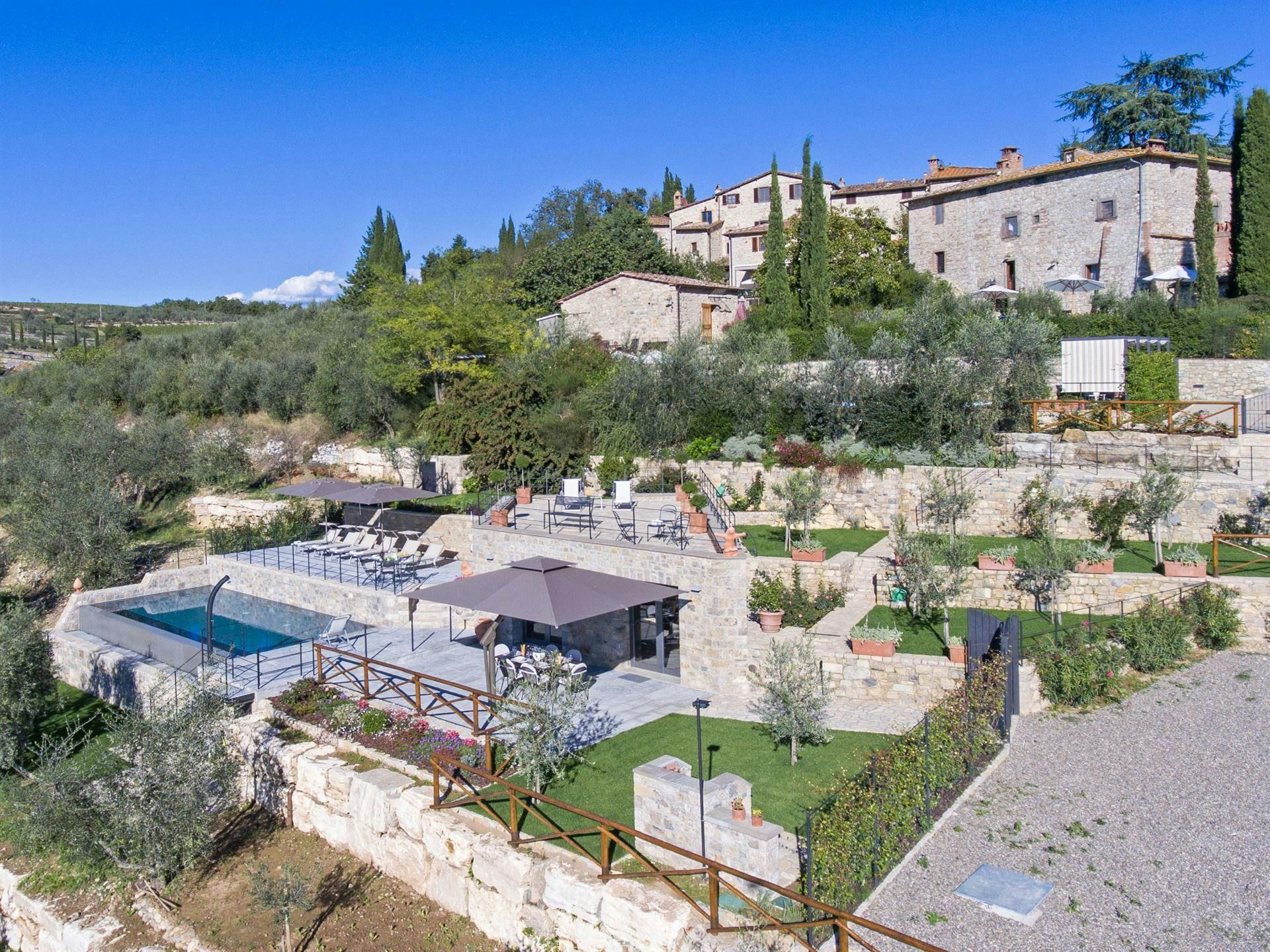 In the Chianti hills, this villa offers vineyard views and easy access to the region's many wineries and picturesque towns. We love the garden – it's where we reckon you'll spend most of your time. There's a private pool, an alfresco dining terrace, and a pool house with a gym that fitness buffs will appreciate. Indoors, the antique furniture and traditional features may feel a bit dated, yet they're all part of its charm. As for location, you'll find Gaiole, Radda, and Castellina a short drive away, making it an ideal base for Tuscan adventures.