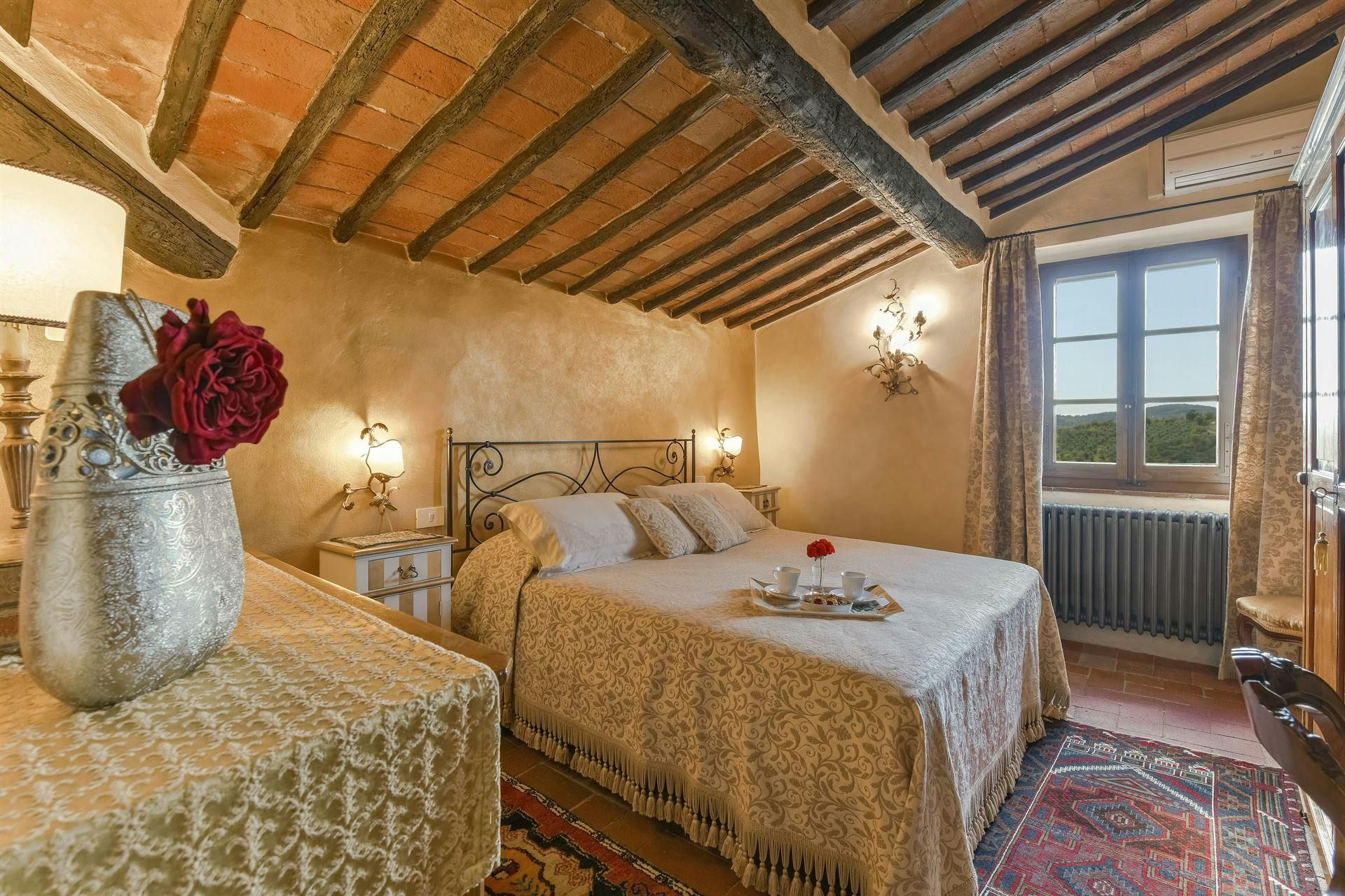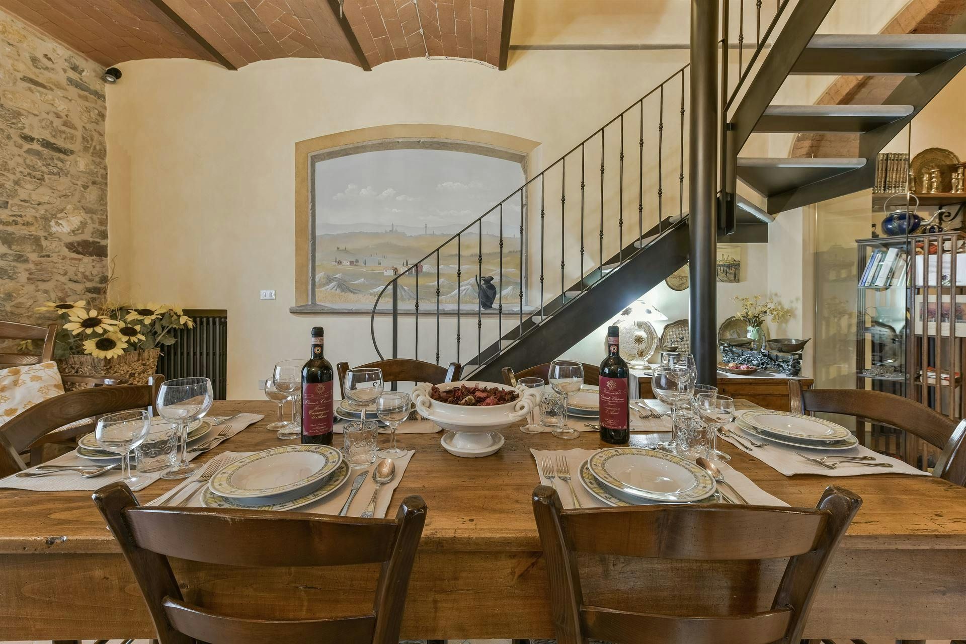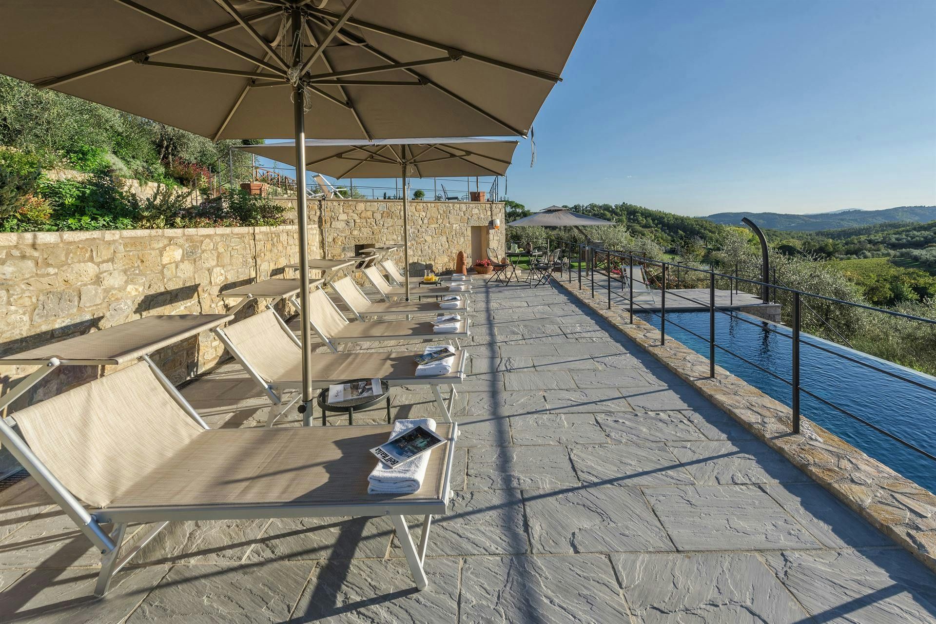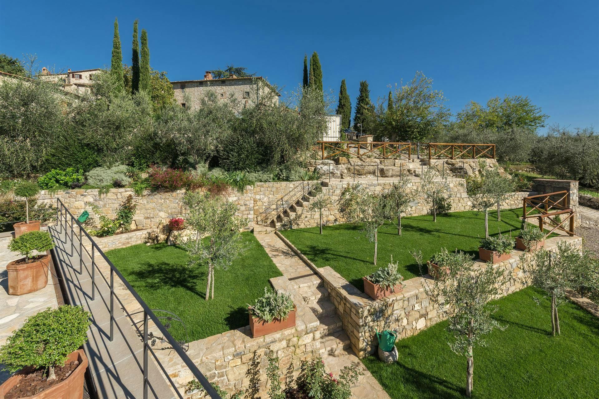 In the Chianti hills, this villa offers vineyard views and easy access to the region's many wineries and picturesque towns. We love the garden – it's where we reckon you'll spend most of your time. There's a private pool, an alfresco dining terrace, and a pool house with a gym that fitness buffs will appreciate. Indoors, the antique furniture and traditional features may feel a bit dated, yet they're all part of its charm. As for location, you'll find Gaiole, Radda, and Castellina a short drive away, making it an ideal base for Tuscan adventures.