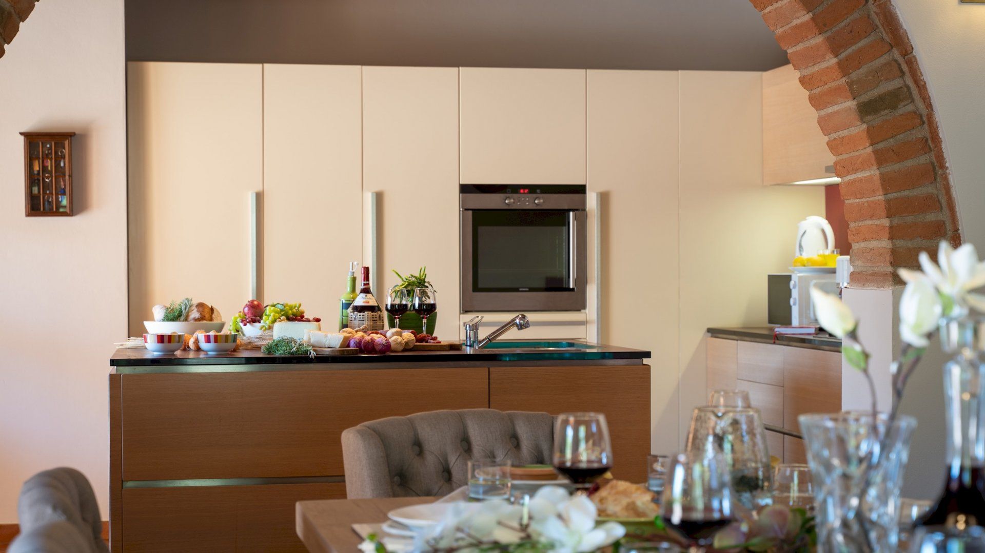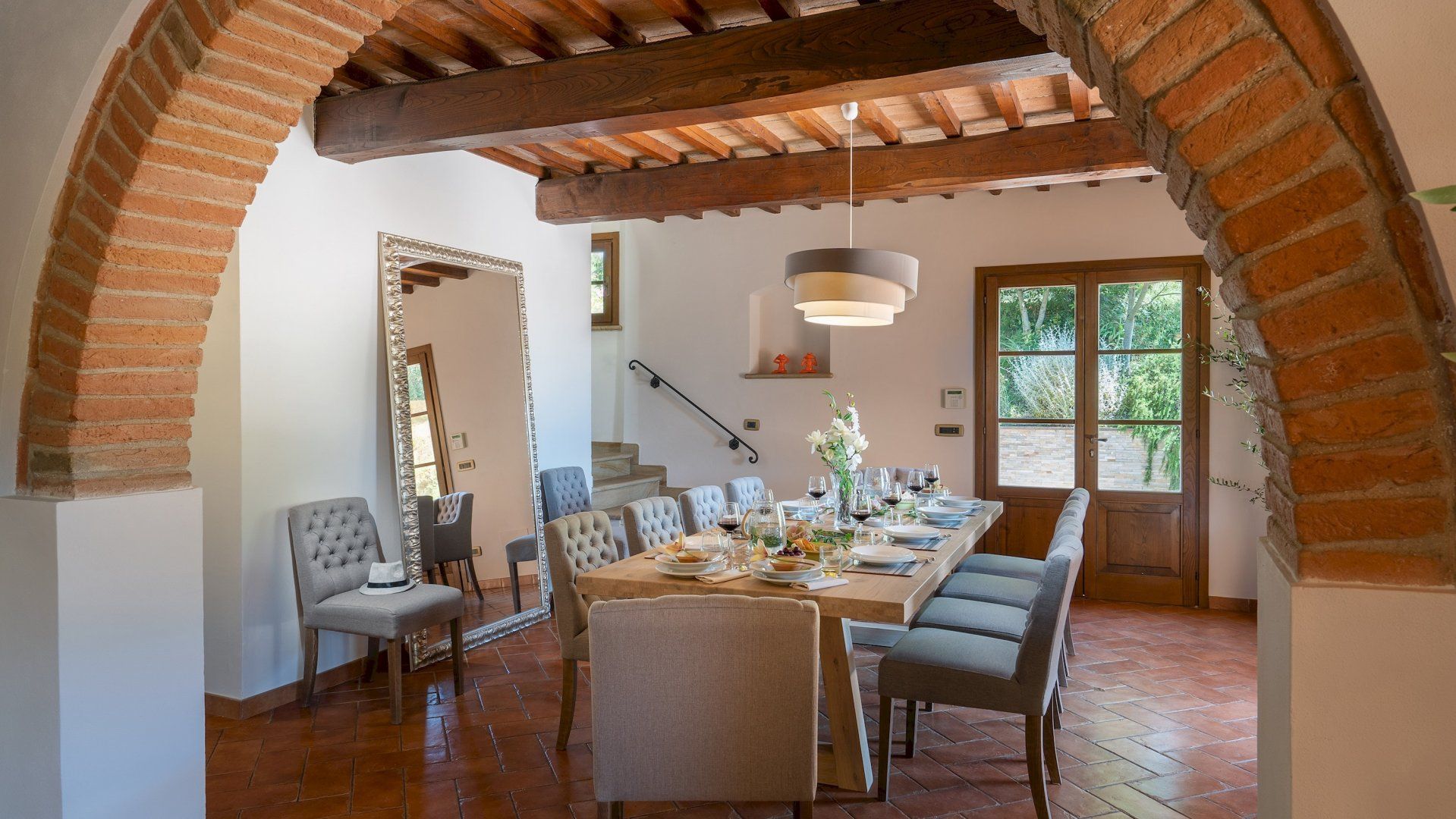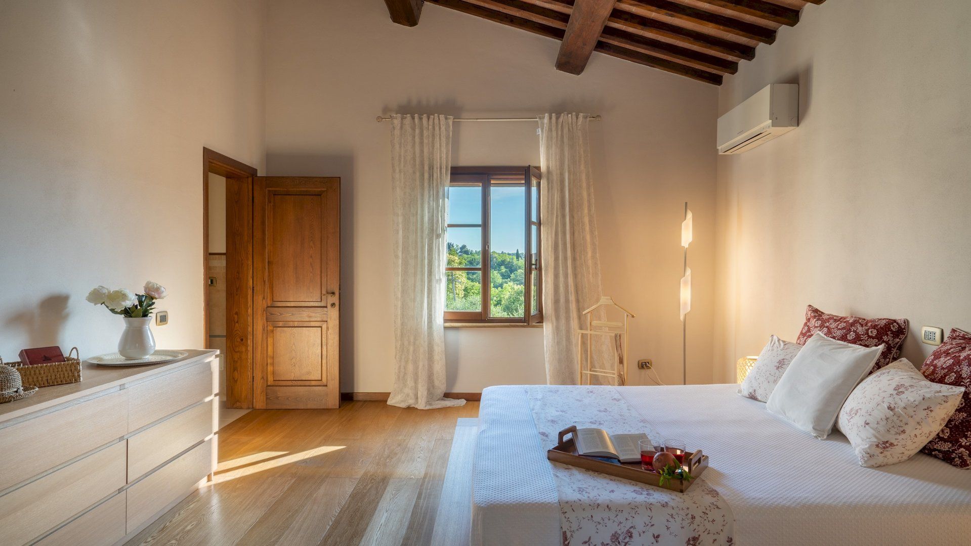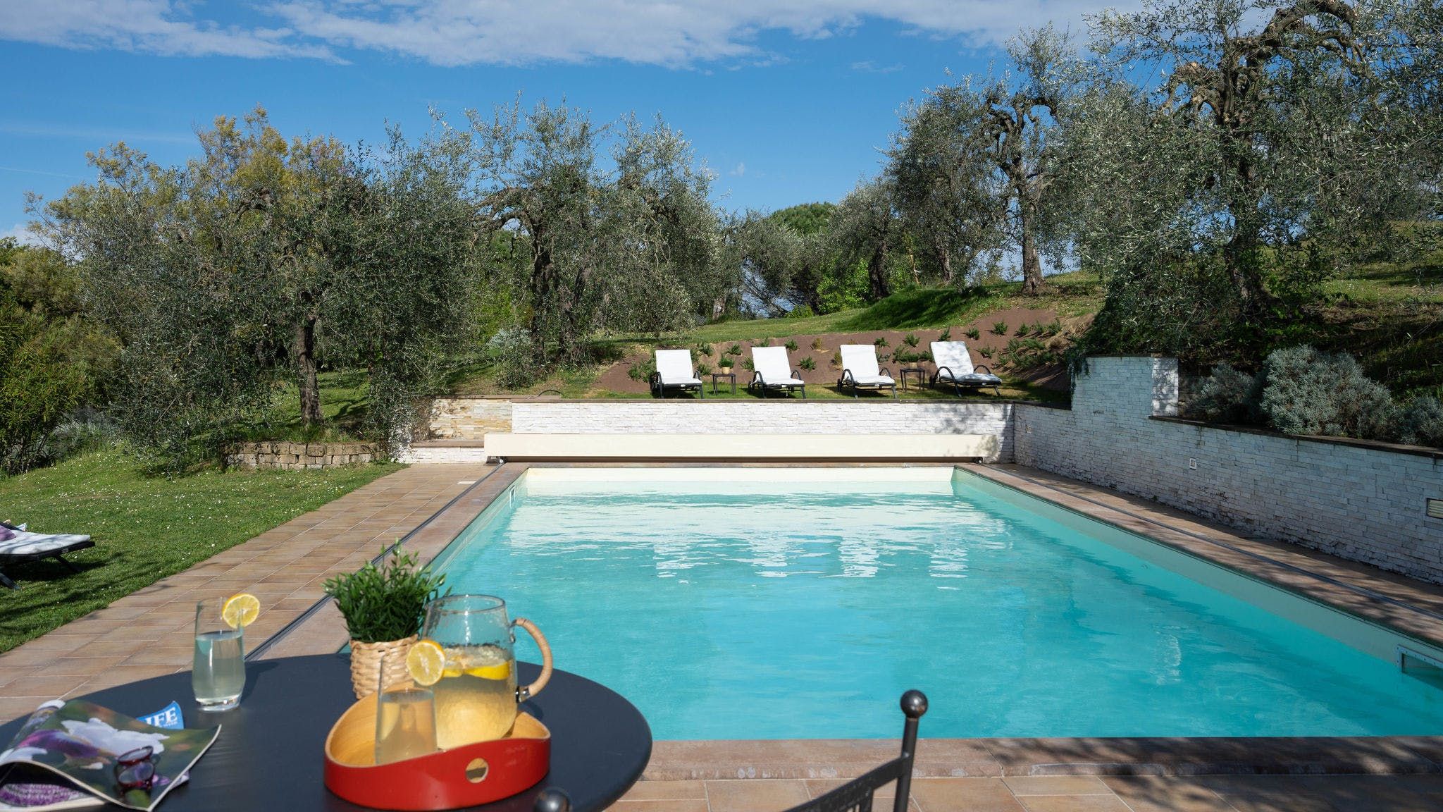 The interior has been recently renovated, blending together traditional Tuscan elements with a more minimalist, Nordic style. The downstairs level has an inviting living room perfect for chilling out with a good book, along with a yoga room where you can stretch away your stresses. Upstairs, you'll find a selection of beautiful bedrooms that guarantee a great night's sleep, and even with a hydro massage tub and shower. The outdoor space is just as impressive, with private gardens to roam through and a wonderful alfresco dining space where you can serve up a delicious homemade pizza, fresh from the wood-fired oven. And, of course, the glittering swimming pool is waiting for you when the temperature rises.