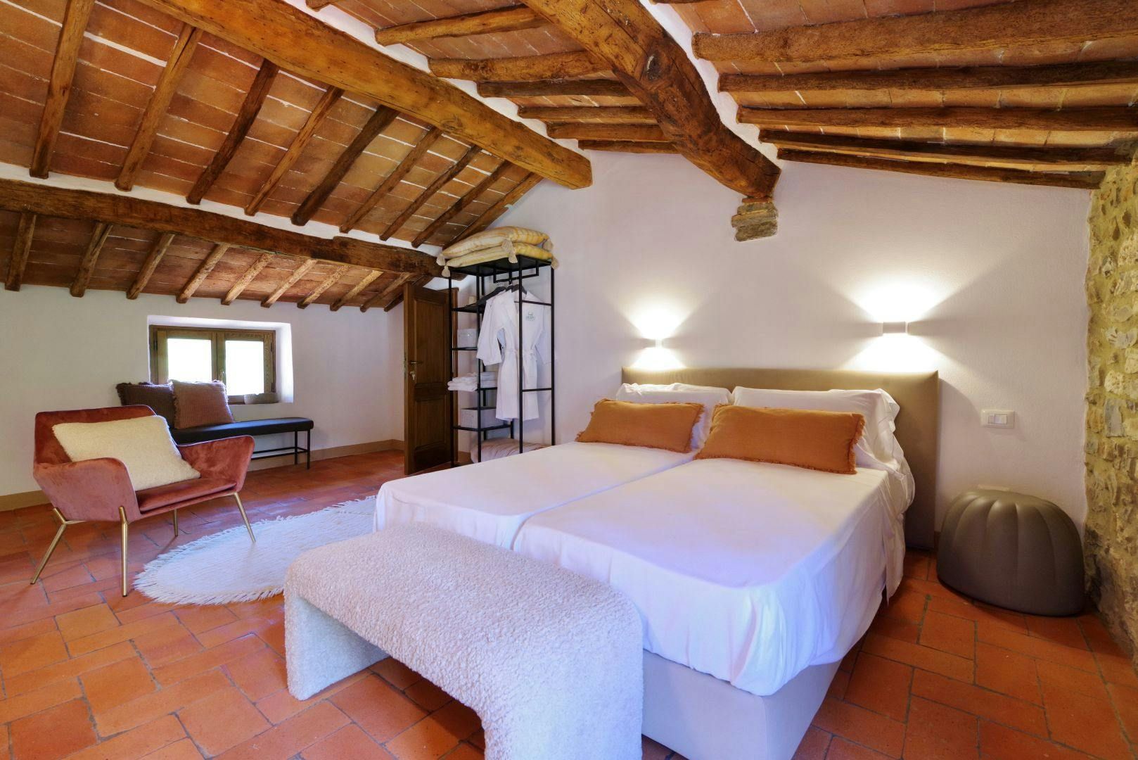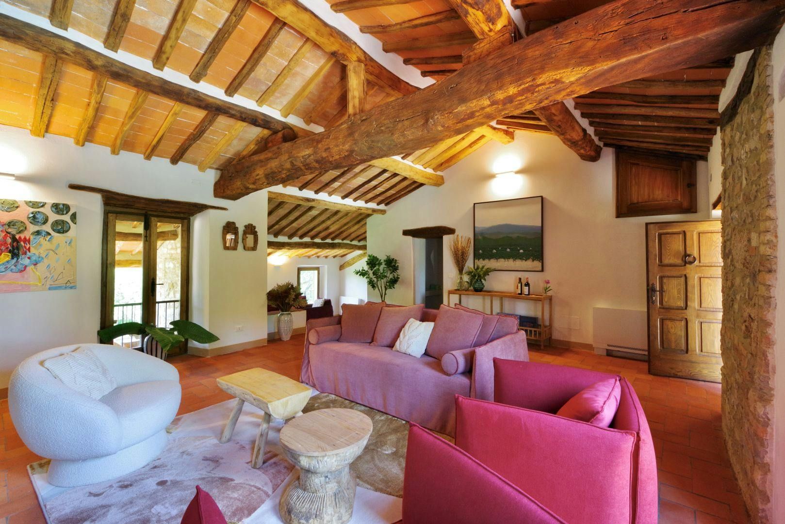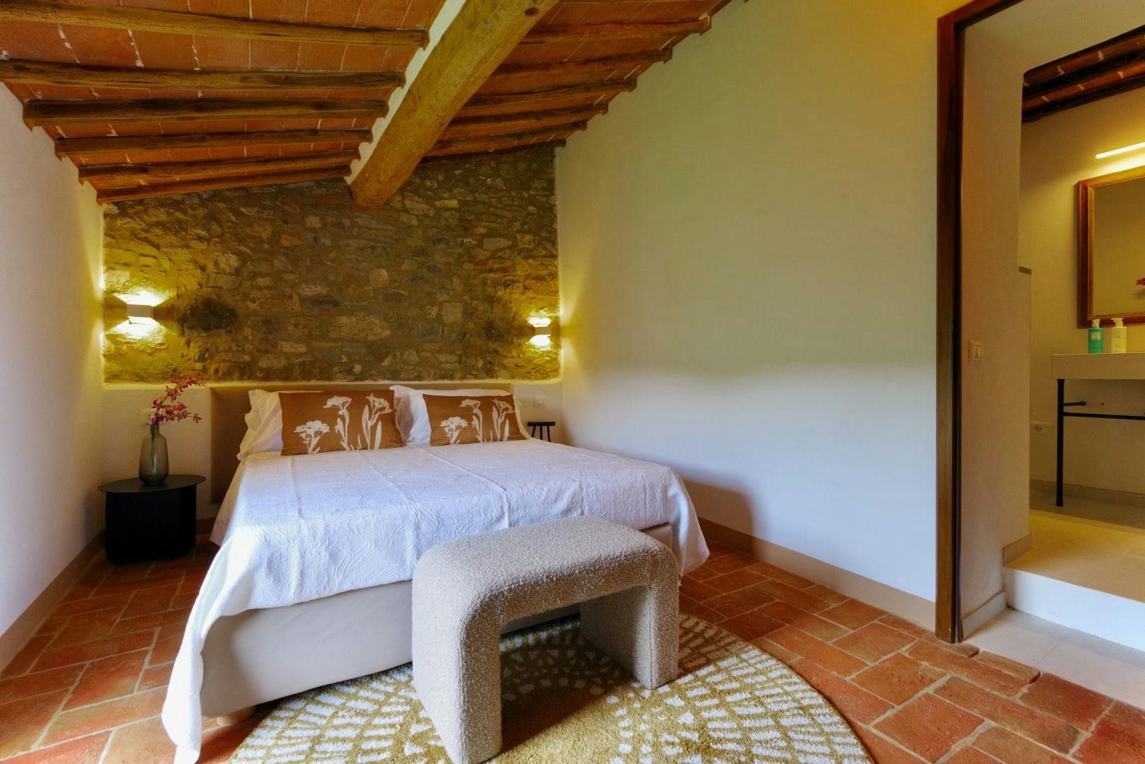 Tucked into the rolling hills of Chianti, this villa sits on a working winery and olive oil farm – and yes, they do offer tastings. The lower half of the main villa is where the magic happens while upstairs has been transformed into a cosy apartment with exposed beams, a fireplace, modern kitchen and three characterful bedrooms. Across the courtyard, a self-contained annex with two extra bedrooms and a kitchenette is ideal for when the whole family comes along. The pool overlooks the vineyards with a chic dining area on the patio for long, leisurely lunches. And when you fancy a change of pace, the delightful town of Castellina is only 5 kilometres away, with restaurants, bars, and gelaterias.