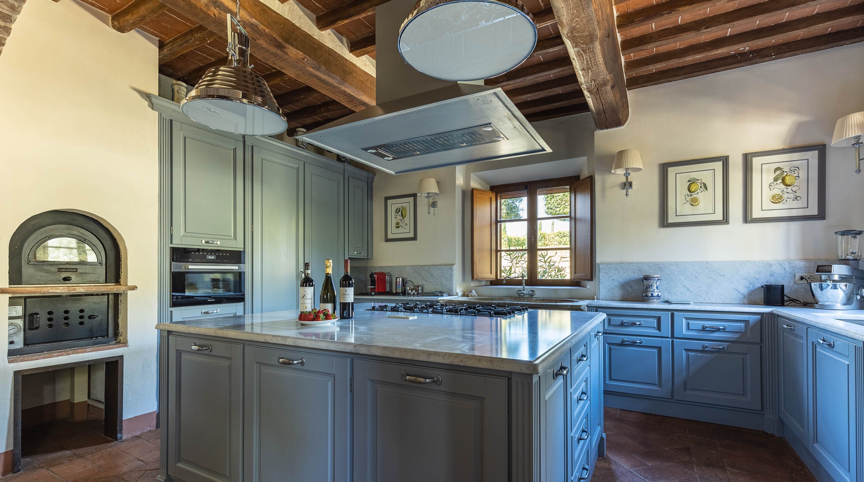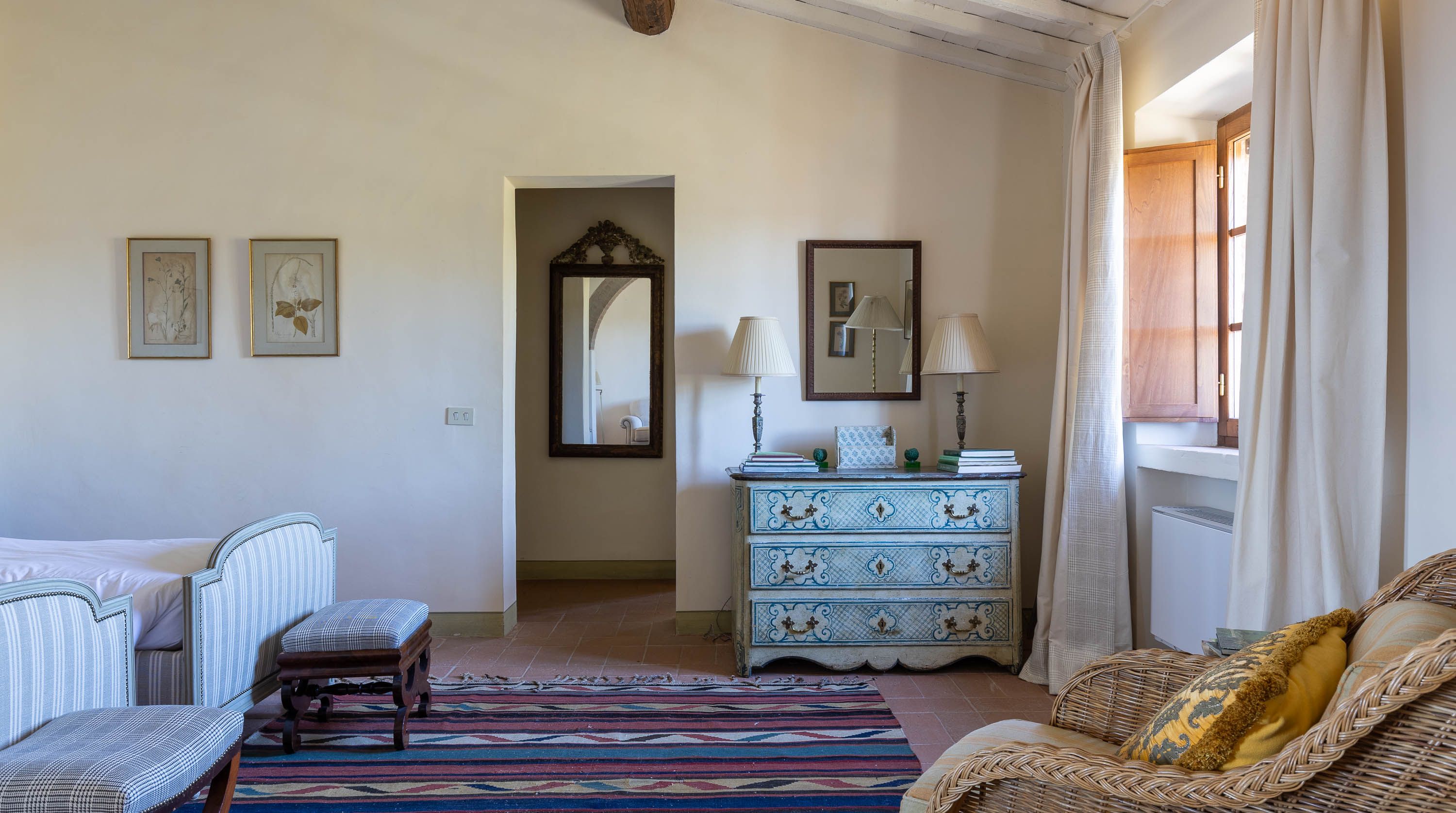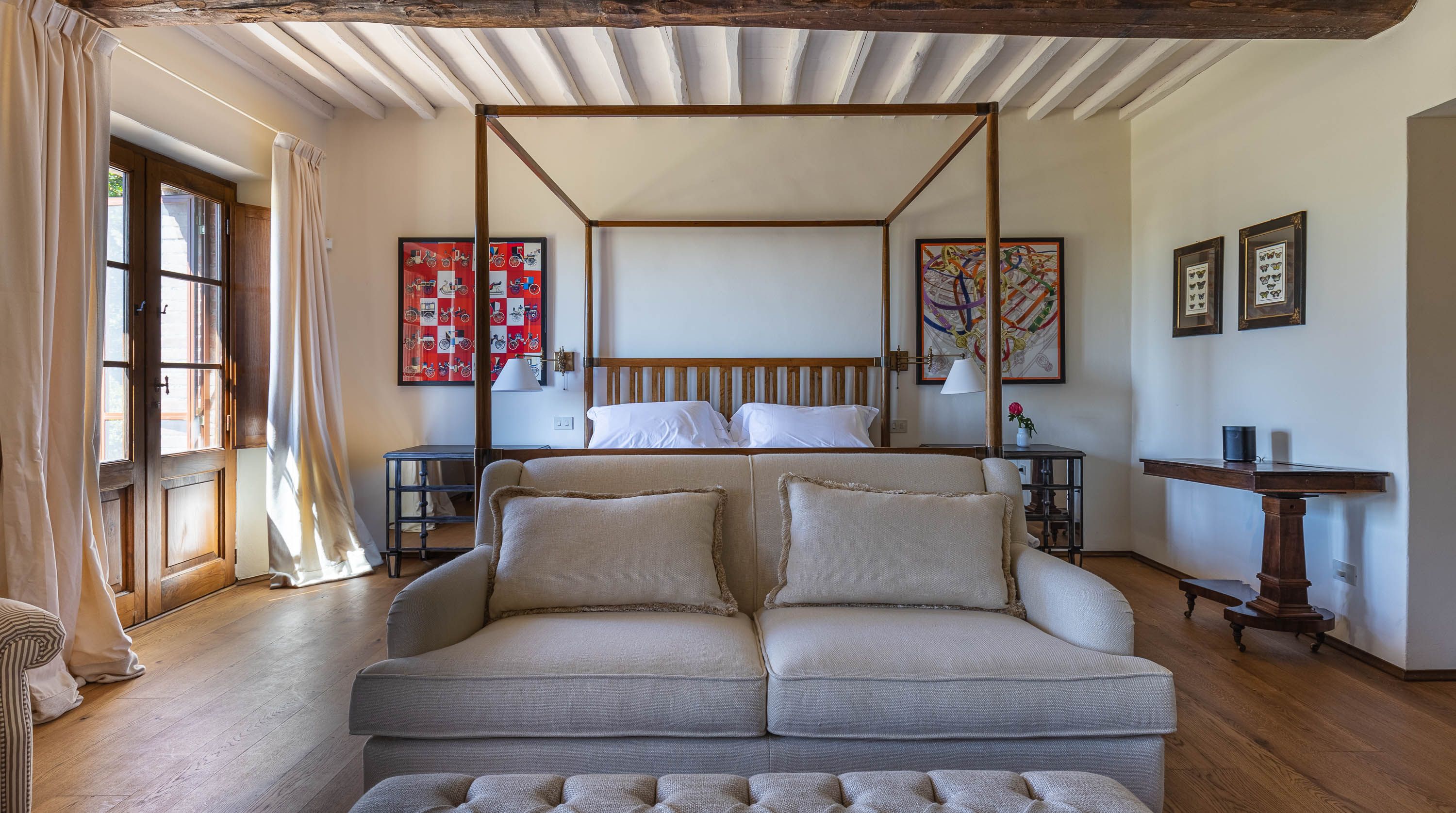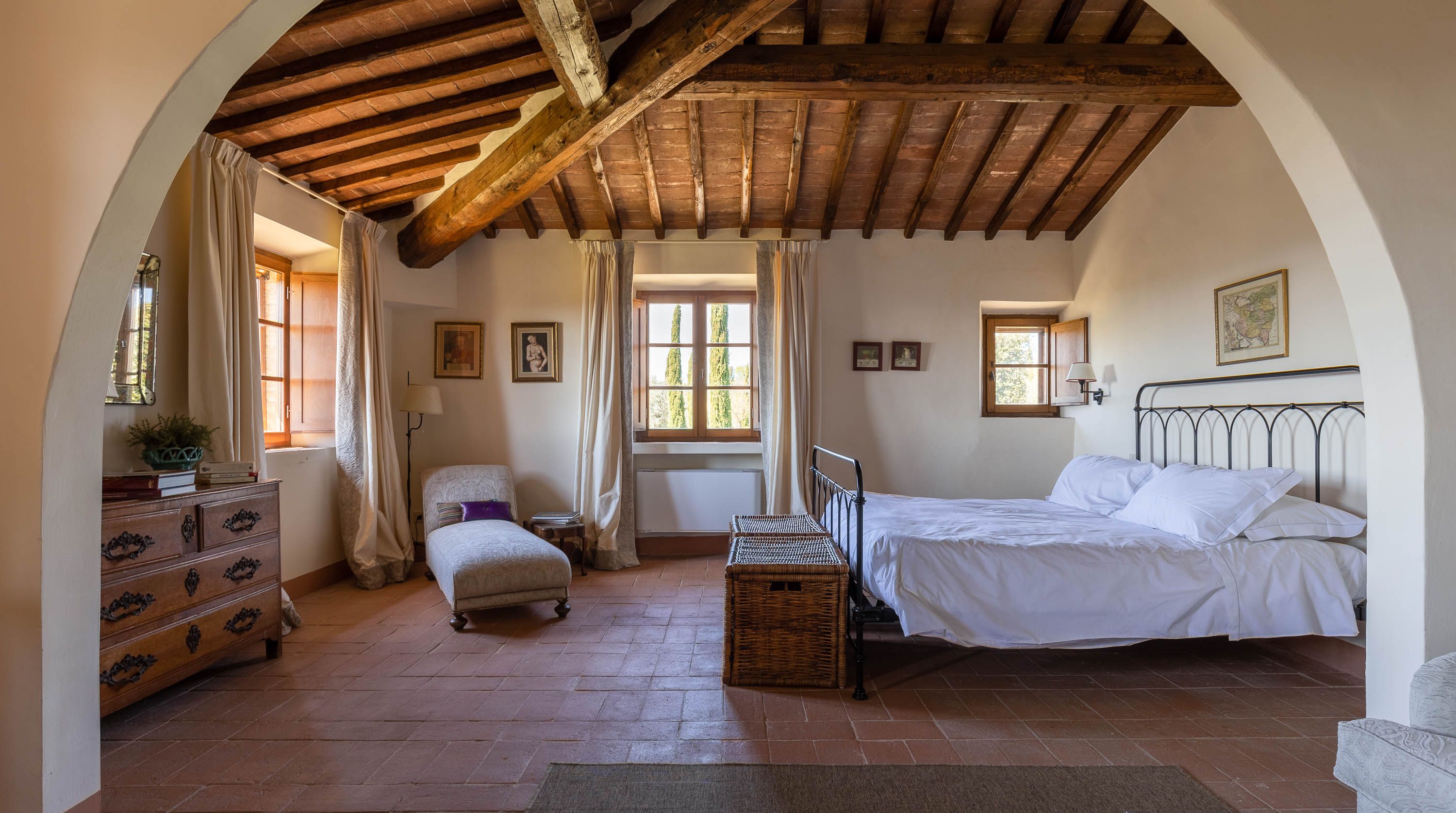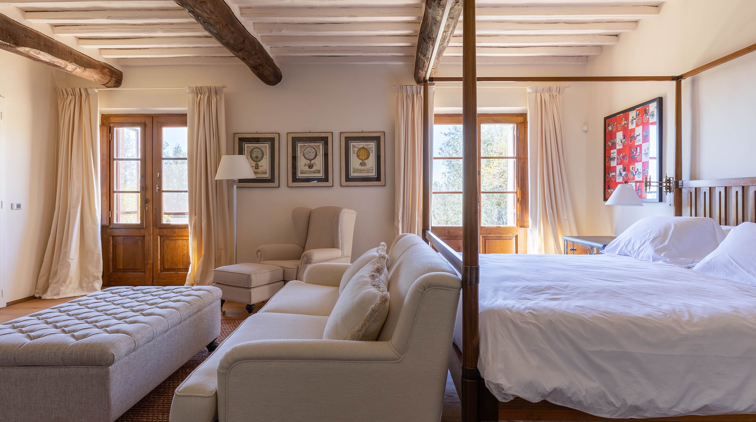 Accessible via an unpaved, cypress-lined road and perched on sloping, vineyard-covered hills, this stylish stone villa is Tuscany at its best. Whether you’re here for an intimate wedding or a big family holiday, the place will set your heart pounding. The interiors have preserved the grace of earlier ages while adding the essential modern cons and amenities. Exposed wood beam ceilings, tiled floors covered with vibrant carpets, and gorgeous vintage furniture make you feel at home, yet so far away from the current era. The master bedroom comes with a four-poster bed, and overall, all sleeping quarters exude a pampering feel accentuated by the gorgeous period furniture. We love the huge dining room, the walls of which are lined with well-stocked bookshelves. After a hearty meal, grab a book, amble outside to the sundeck and lose yourself in another world. When the warmth overwhelms you, take a cooling dip in the massive pool. In the evening you can savour wine and antipasti on the veranda or under the vine-wrapped pergola. If you get the itch to explore, a thirty-minute drive will take you to Siena where you can enjoy dining, shopping and sightseeing.