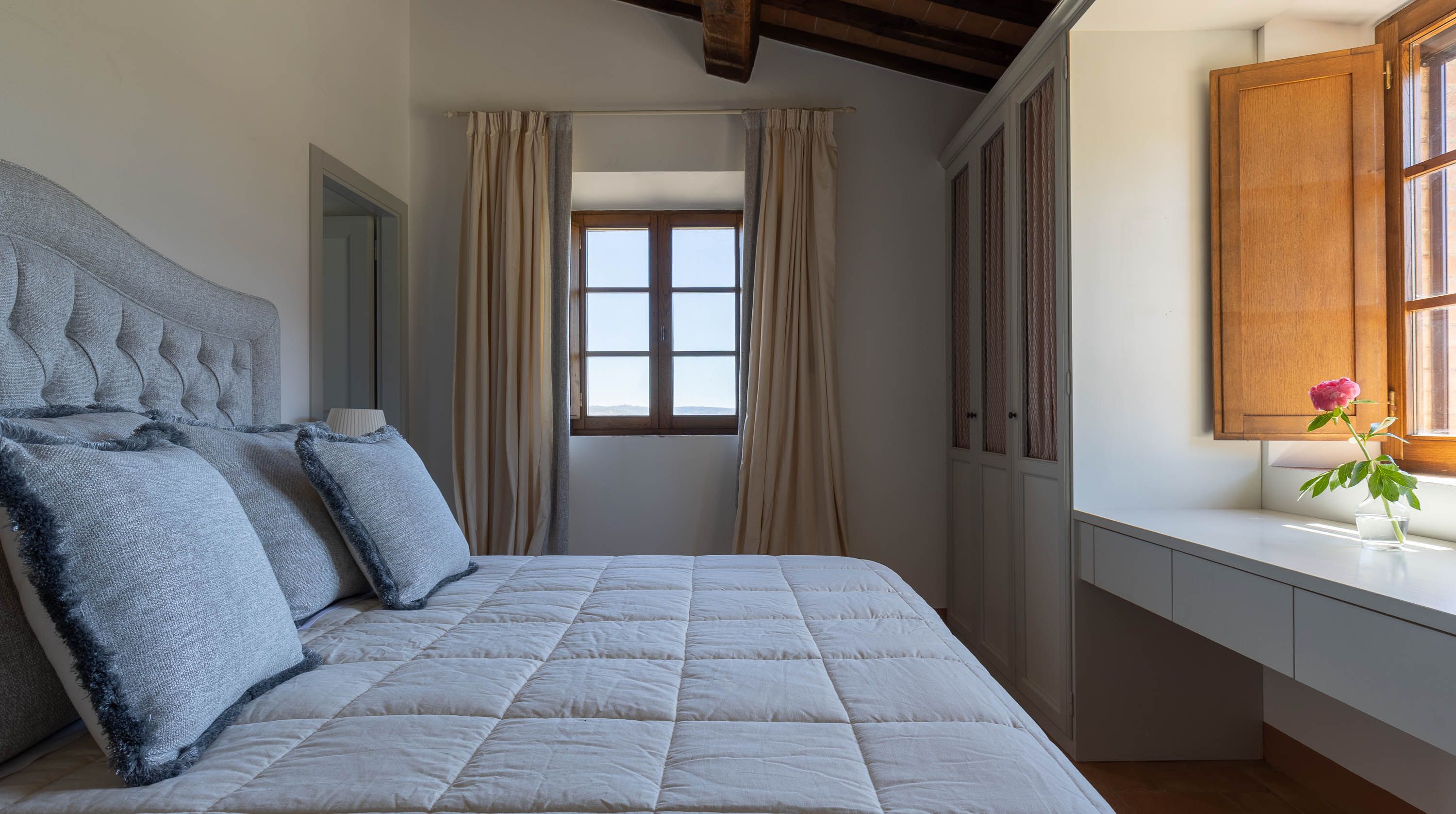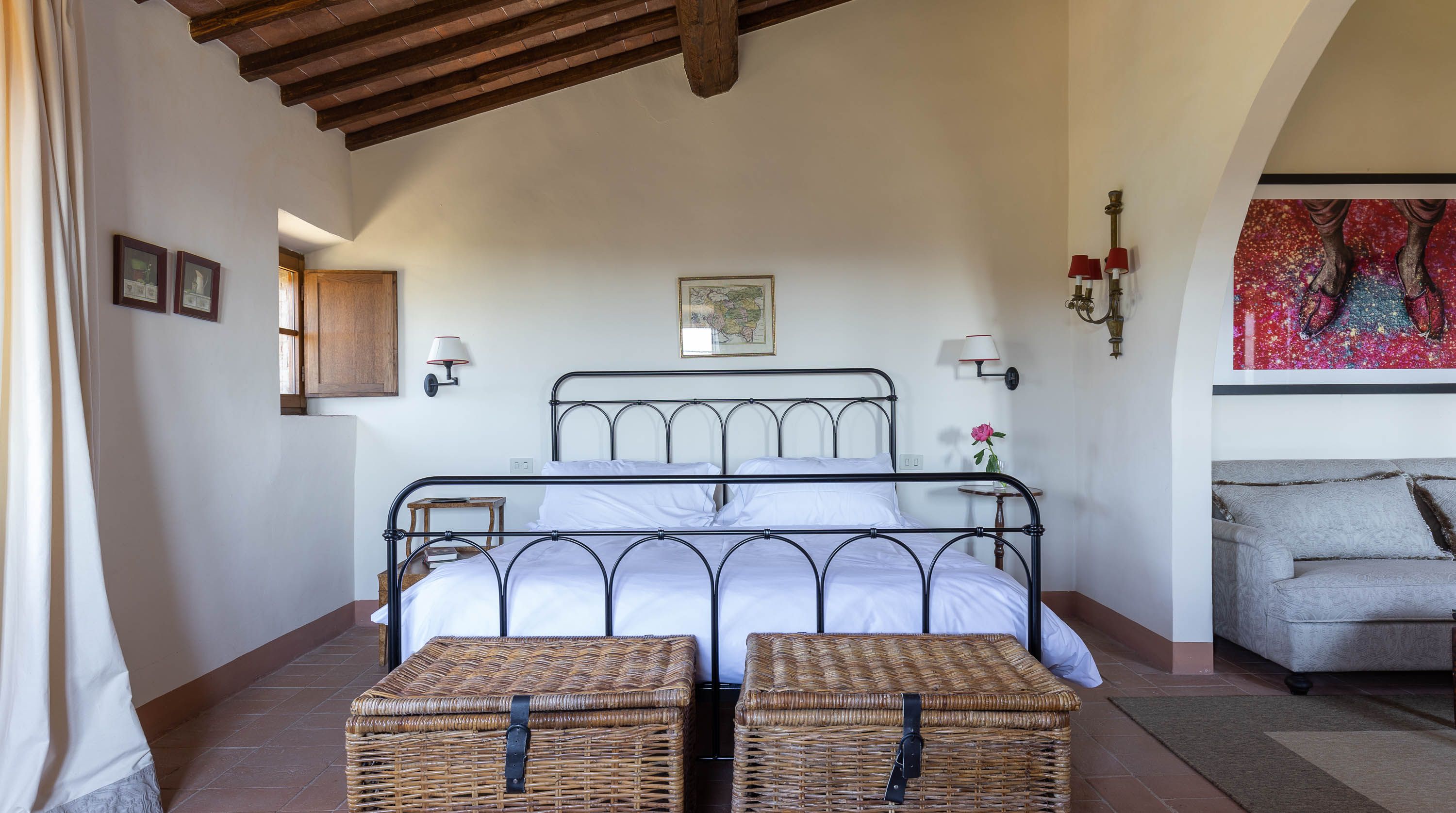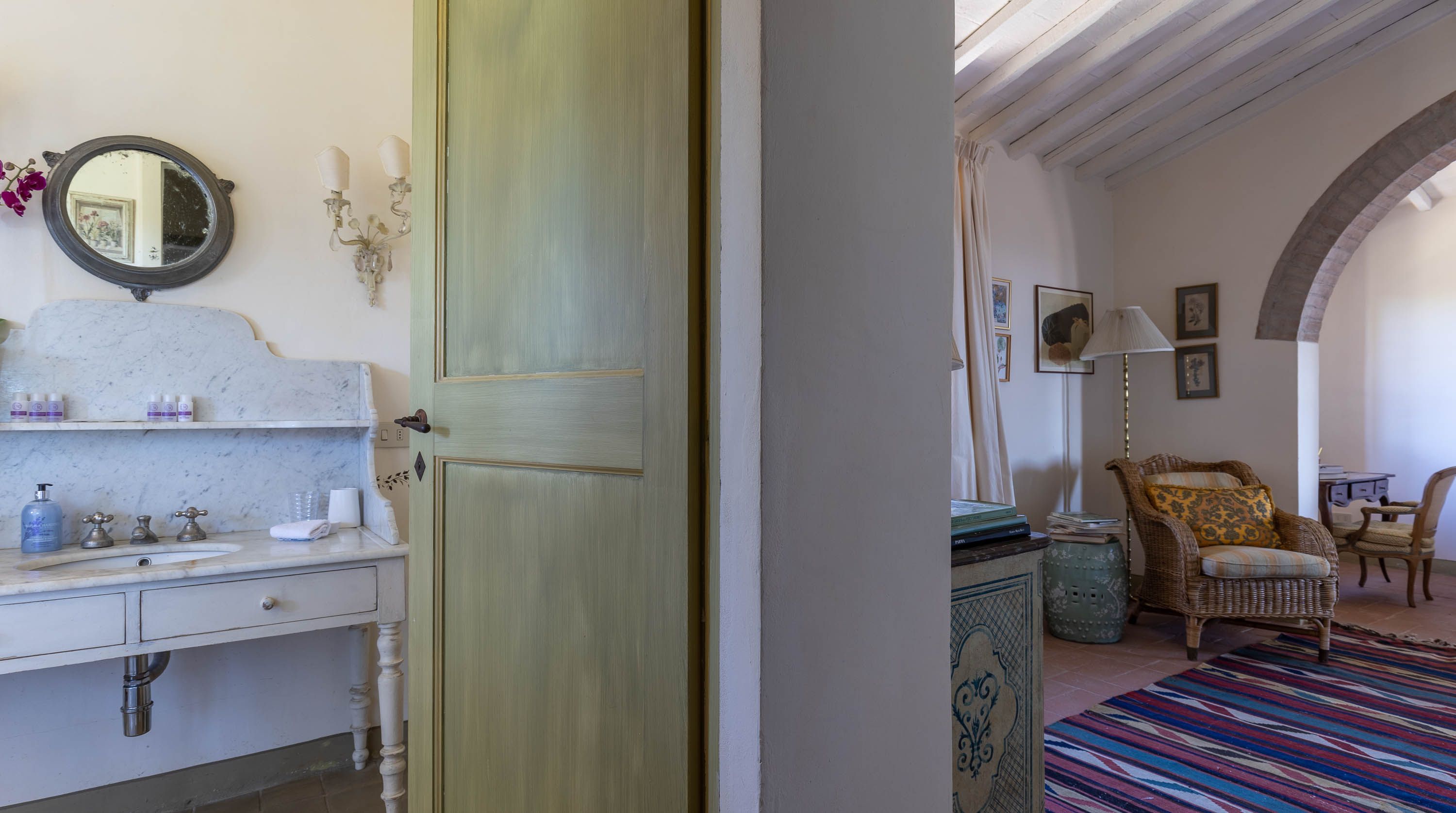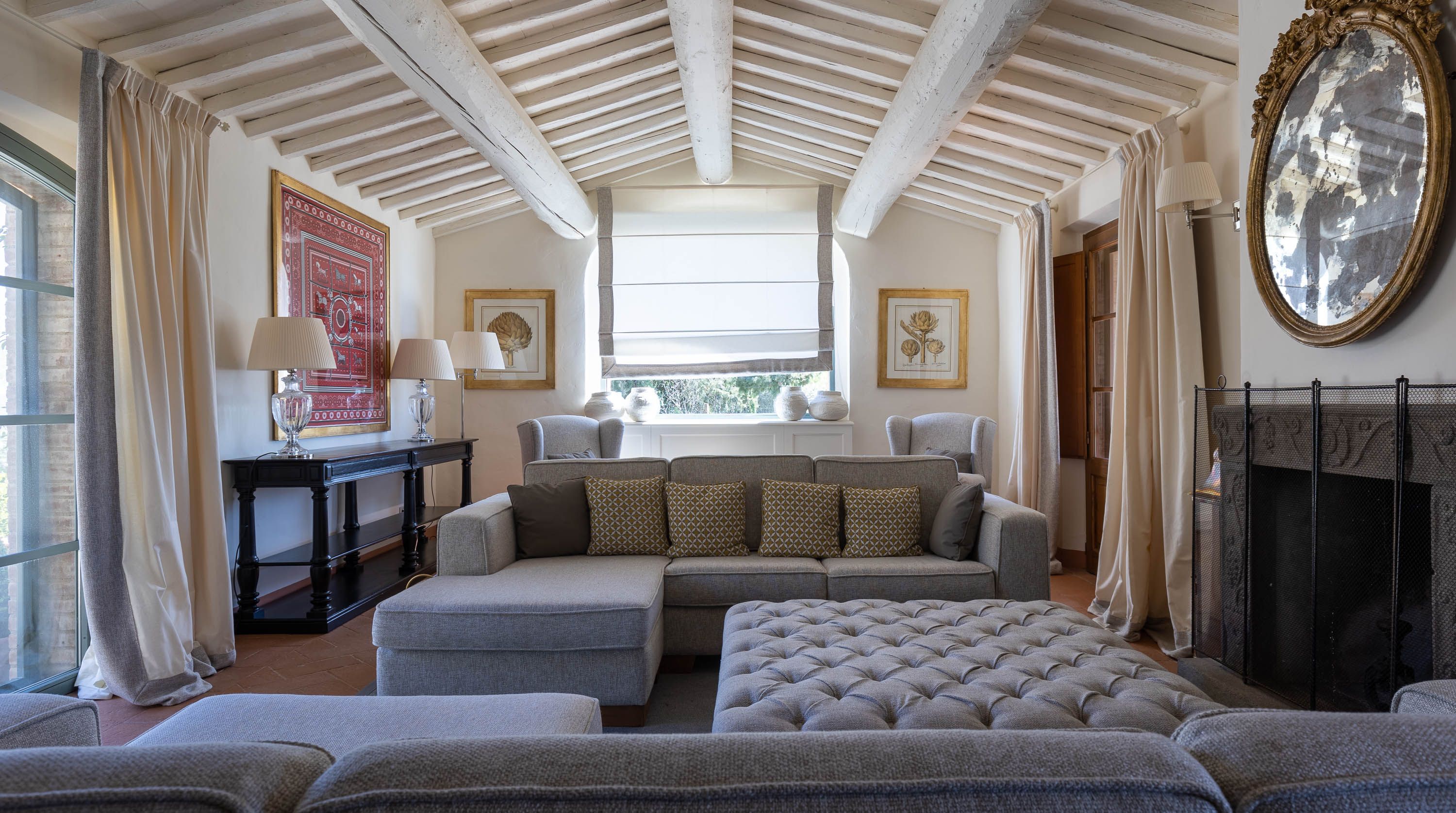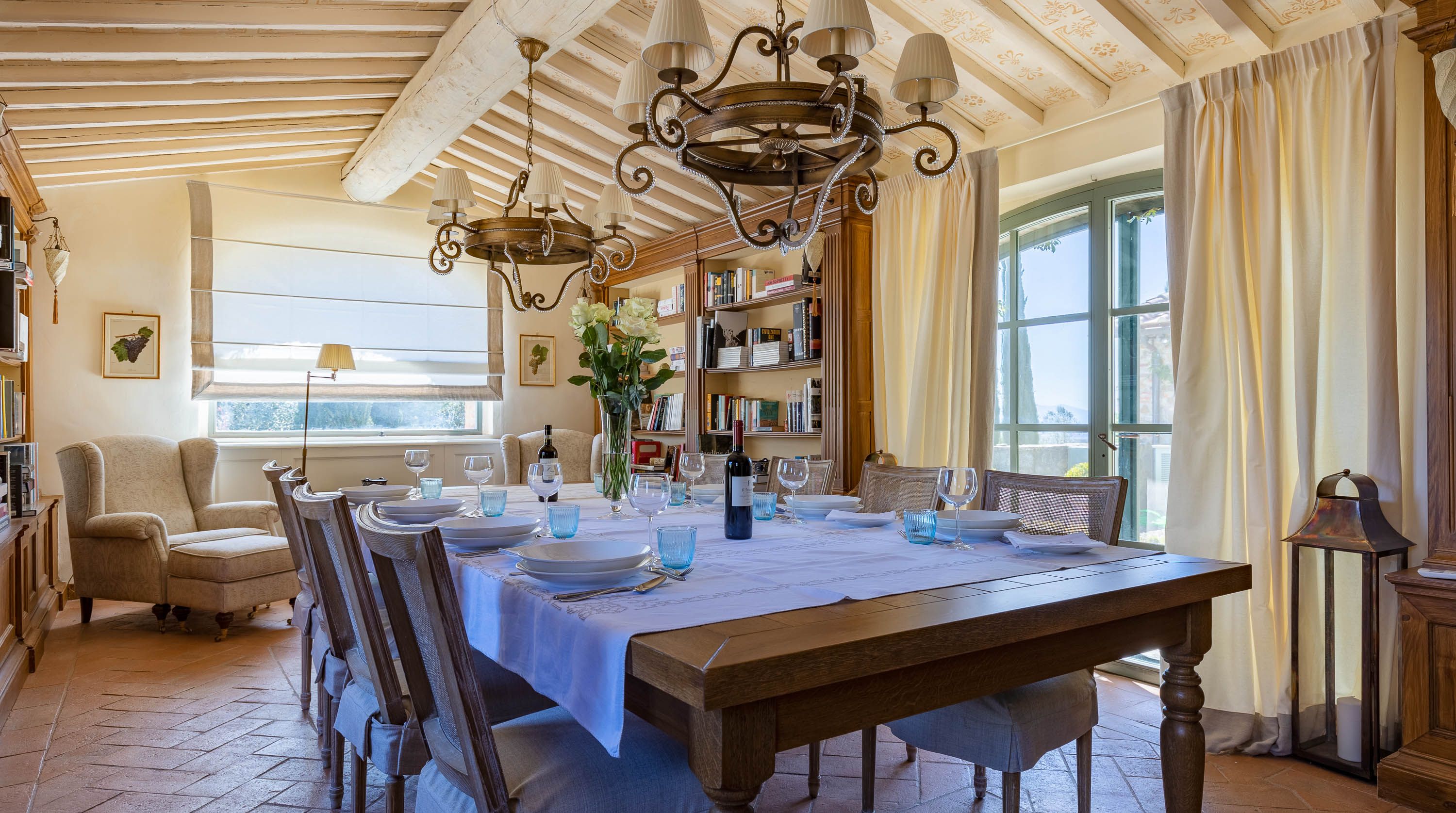 Accessible via an unpaved, cypress-lined road and perched on sloping, vineyard-covered hills, this stylish stone villa is Tuscany at its best. Whether you’re here for an intimate wedding or a big family holiday, the place will set your heart pounding. The interiors have preserved the grace of earlier ages while adding the essential modern cons and amenities. Exposed wood beam ceilings, tiled floors covered with vibrant carpets, and gorgeous vintage furniture make you feel at home, yet so far away from the current era. The master bedroom comes with a four-poster bed, and overall, all sleeping quarters exude a pampering feel accentuated by the gorgeous period furniture. We love the huge dining room, the walls of which are lined with well-stocked bookshelves. After a hearty meal, grab a book, amble outside to the sundeck and lose yourself in another world. When the warmth overwhelms you, take a cooling dip in the massive pool. In the evening you can savour wine and antipasti on the veranda or under the vine-wrapped pergola. If you get the itch to explore, a thirty-minute drive will take you to Siena where you can enjoy dining, shopping and sightseeing.