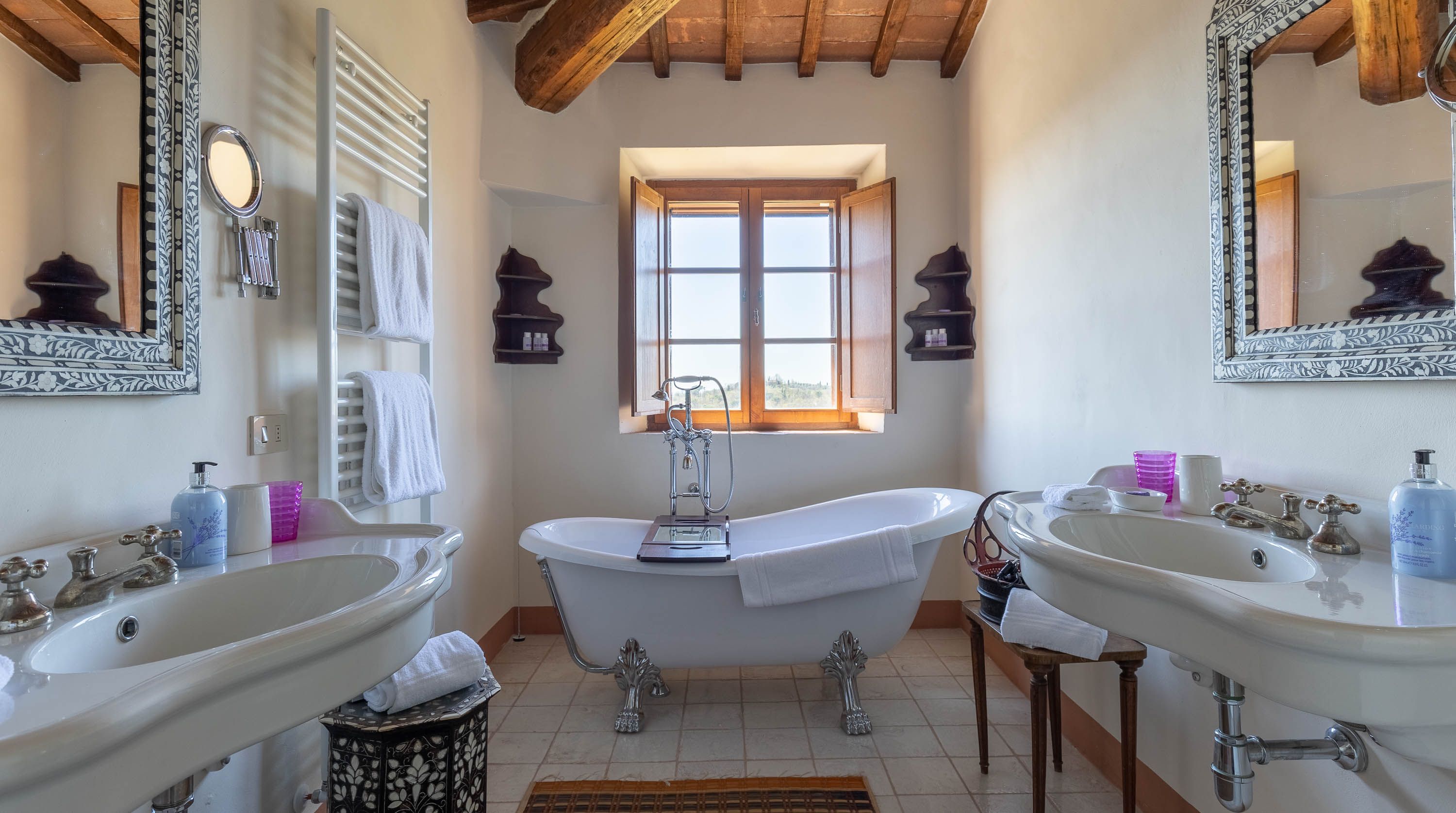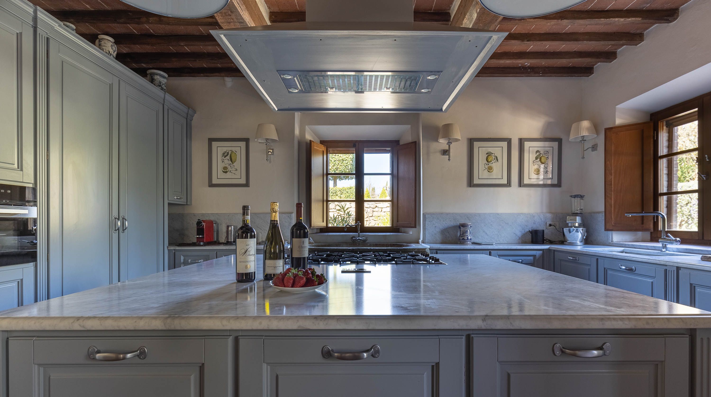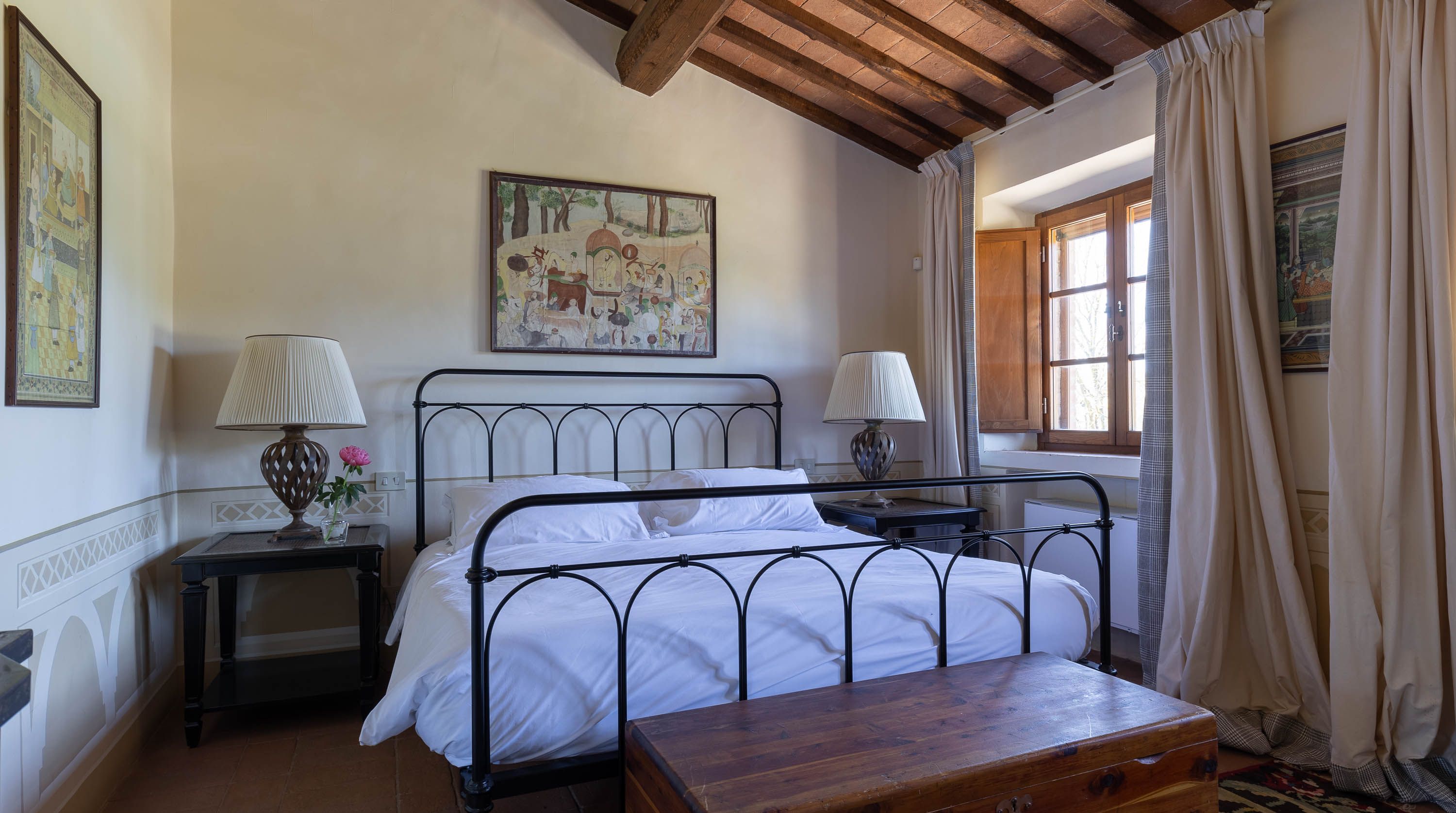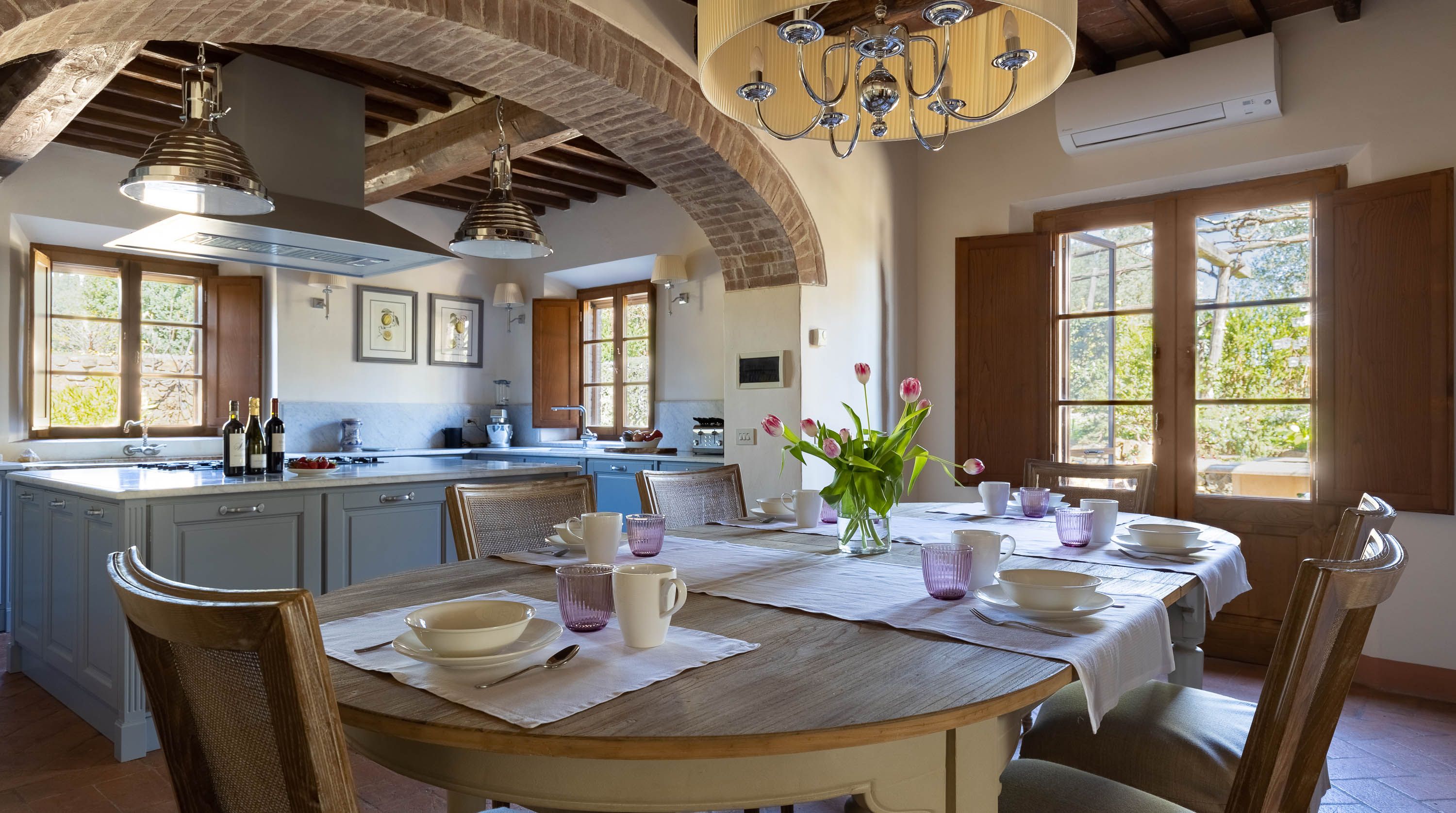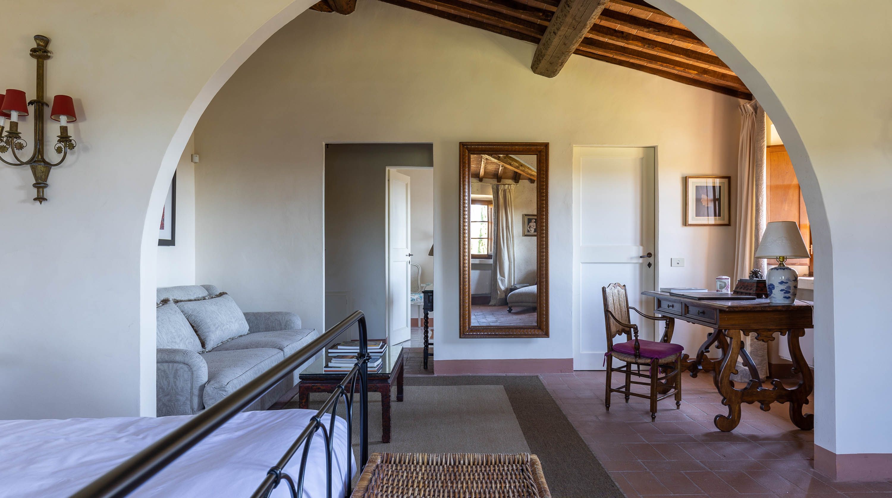 Accessible via an unpaved, cypress-lined road and perched on sloping, vineyard-covered hills, this stylish stone villa is Tuscany at its best. Whether you’re here for an intimate wedding or a big family holiday, the place will set your heart pounding. The interiors have preserved the grace of earlier ages while adding the essential modern cons and amenities. Exposed wood beam ceilings, tiled floors covered with vibrant carpets, and gorgeous vintage furniture make you feel at home, yet so far away from the current era. The master bedroom comes with a four-poster bed, and overall, all sleeping quarters exude a pampering feel accentuated by the gorgeous period furniture. We love the huge dining room, the walls of which are lined with well-stocked bookshelves. After a hearty meal, grab a book, amble outside to the sundeck and lose yourself in another world. When the warmth overwhelms you, take a cooling dip in the massive pool. In the evening you can savour wine and antipasti on the veranda or under the vine-wrapped pergola. If you get the itch to explore, a thirty-minute drive will take you to Siena where you can enjoy dining, shopping and sightseeing.