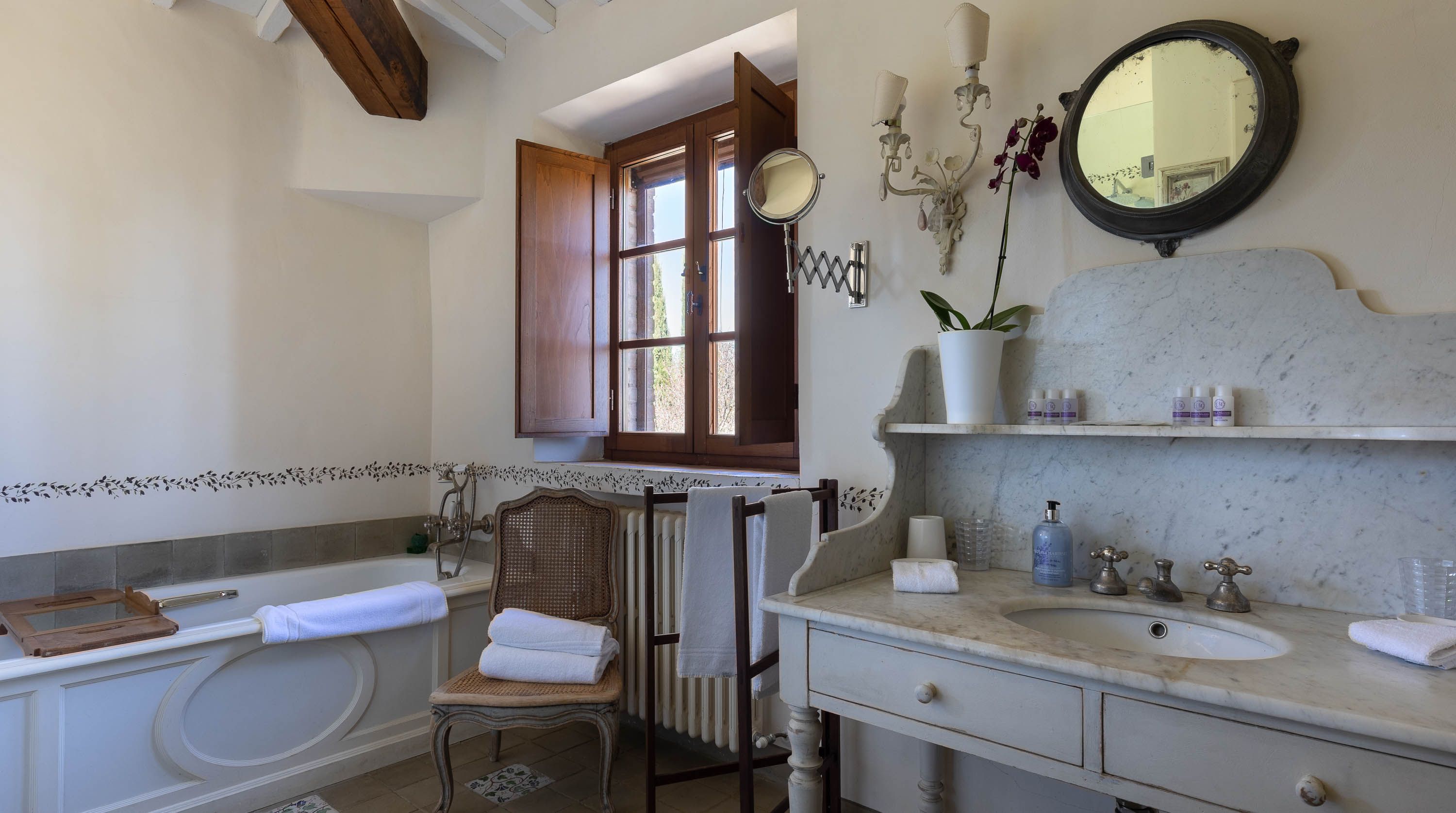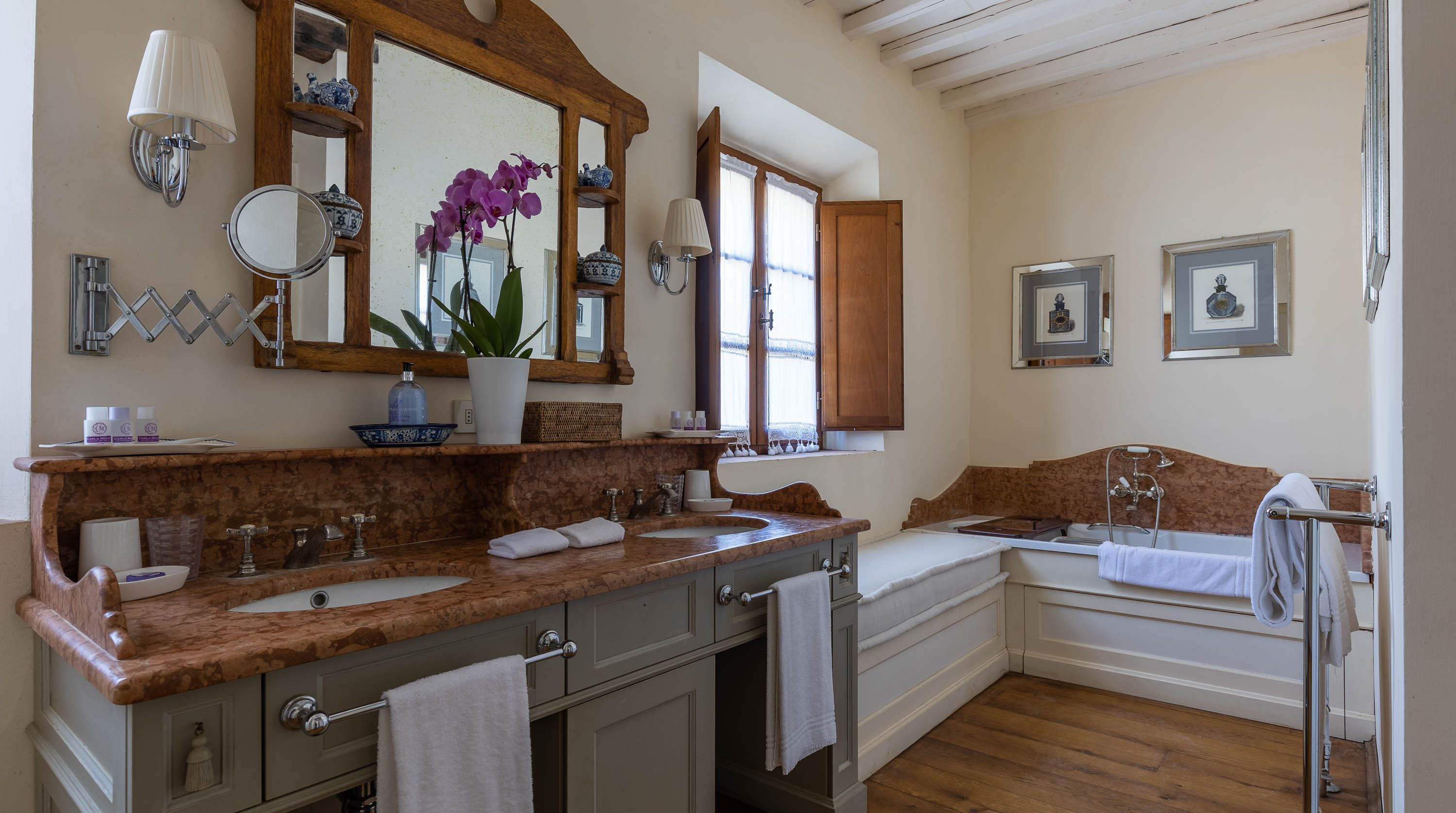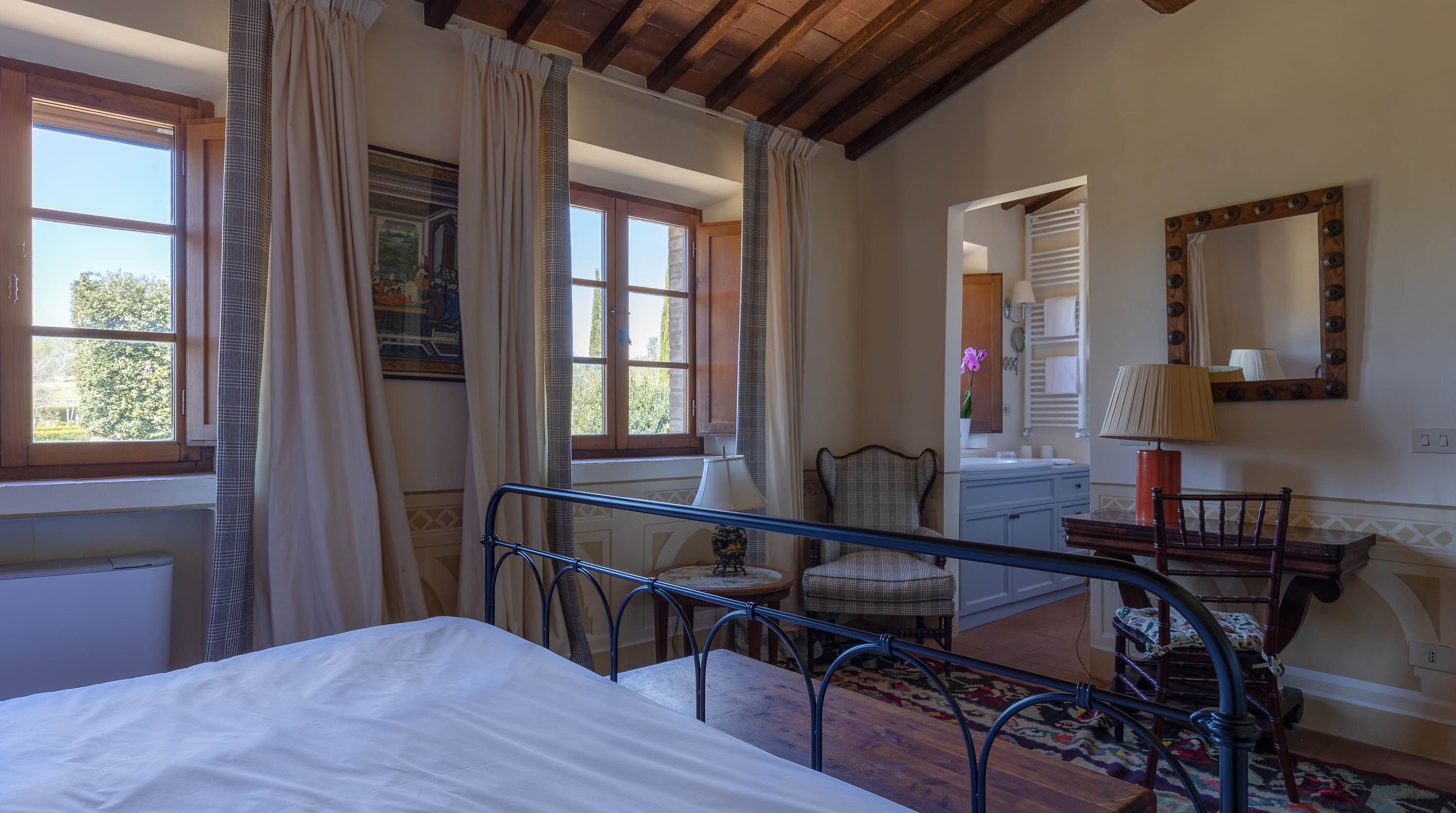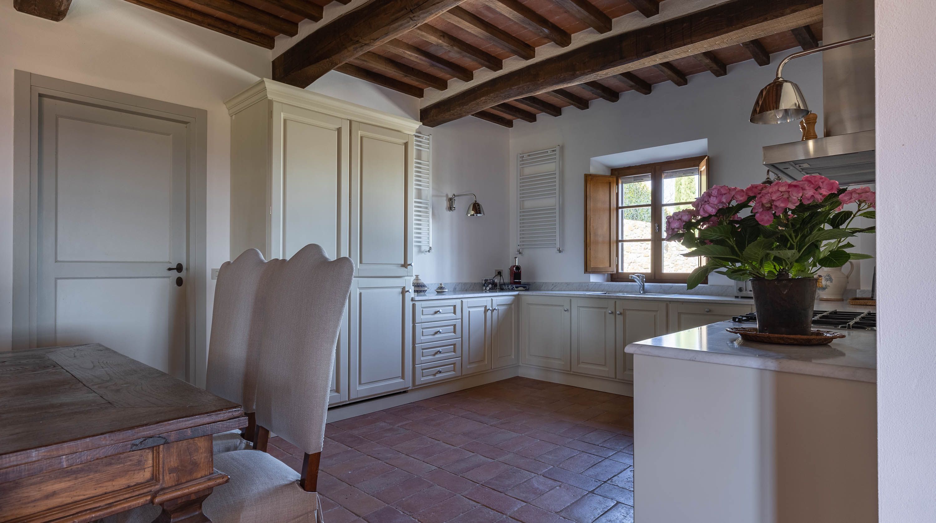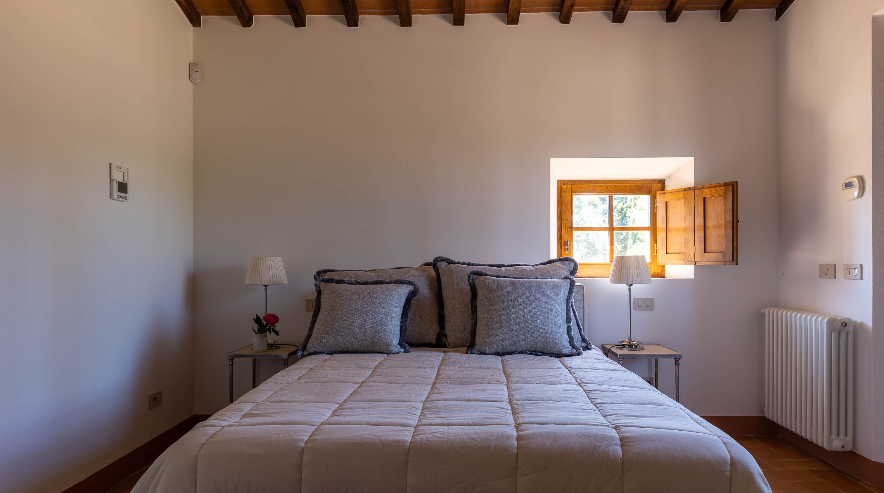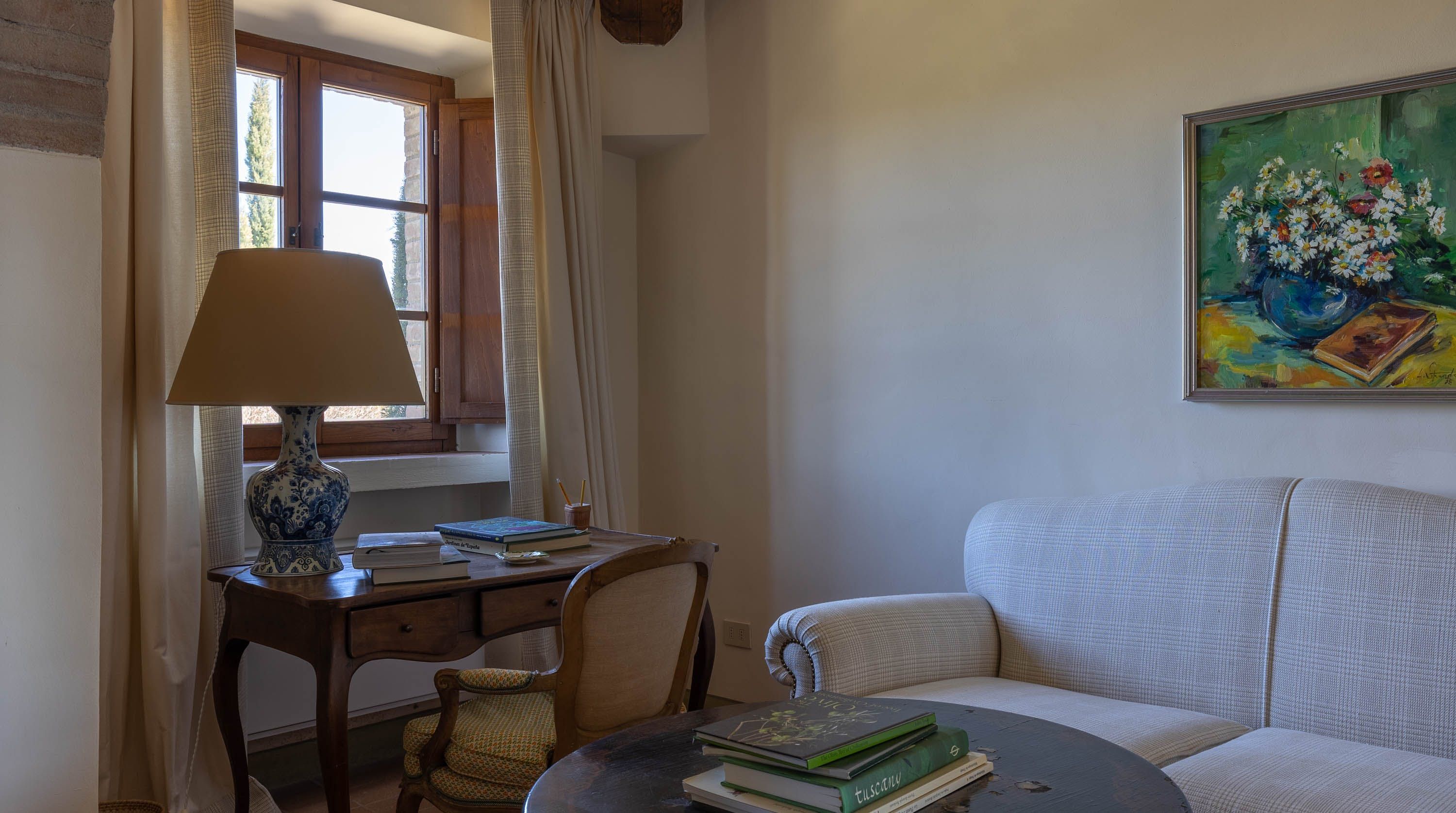 Accessible via an unpaved, cypress-lined road and perched on sloping, vineyard-covered hills, this stylish stone villa is Tuscany at its best. Whether you’re here for an intimate wedding or a big family holiday, the place will set your heart pounding. The interiors have preserved the grace of earlier ages while adding the essential modern cons and amenities. Exposed wood beam ceilings, tiled floors covered with vibrant carpets, and gorgeous vintage furniture make you feel at home, yet so far away from the current era. The master bedroom comes with a four-poster bed, and overall, all sleeping quarters exude a pampering feel accentuated by the gorgeous period furniture. We love the huge dining room, the walls of which are lined with well-stocked bookshelves. After a hearty meal, grab a book, amble outside to the sundeck and lose yourself in another world. When the warmth overwhelms you, take a cooling dip in the massive pool. In the evening you can savour wine and antipasti on the veranda or under the vine-wrapped pergola. If you get the itch to explore, a thirty-minute drive will take you to Siena where you can enjoy dining, shopping and sightseeing.