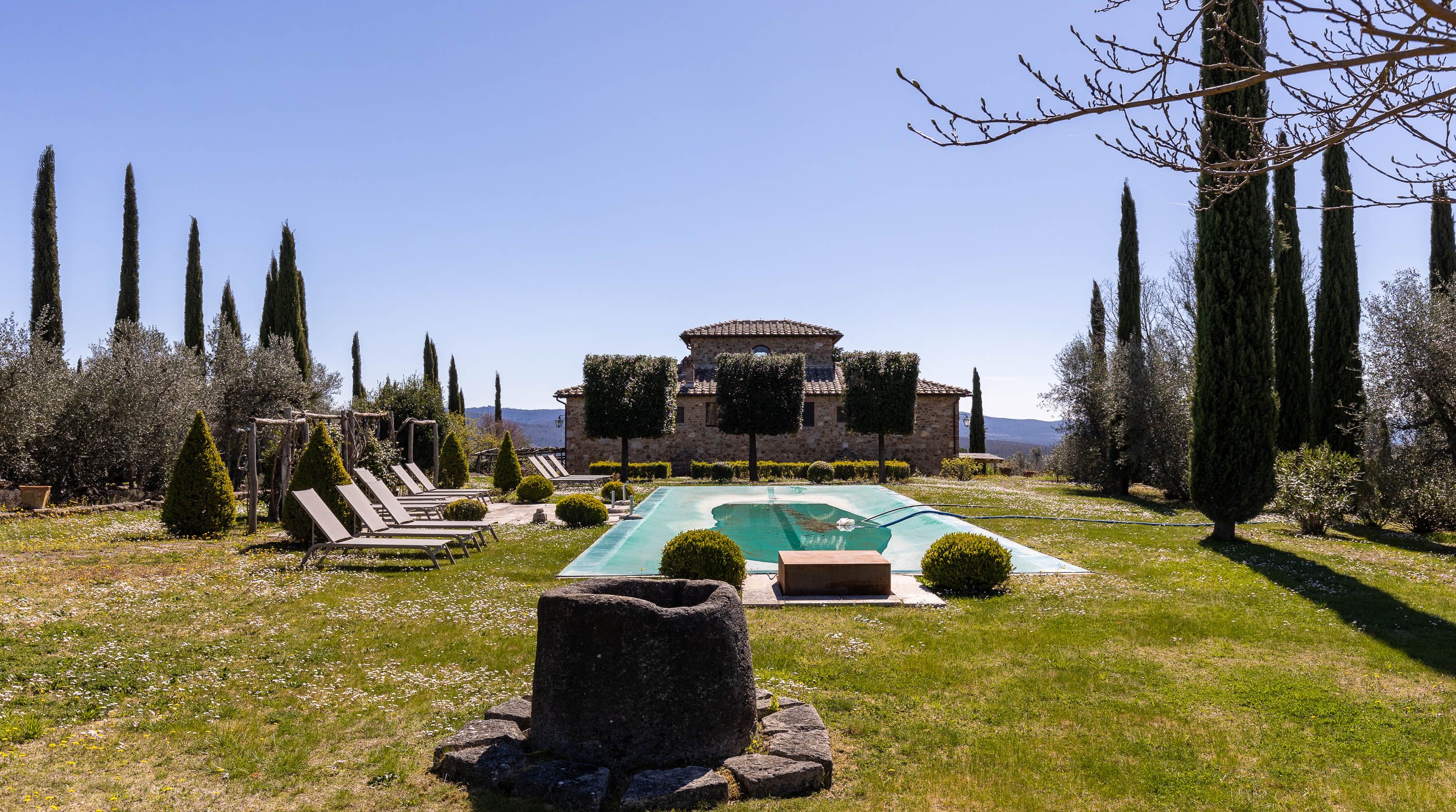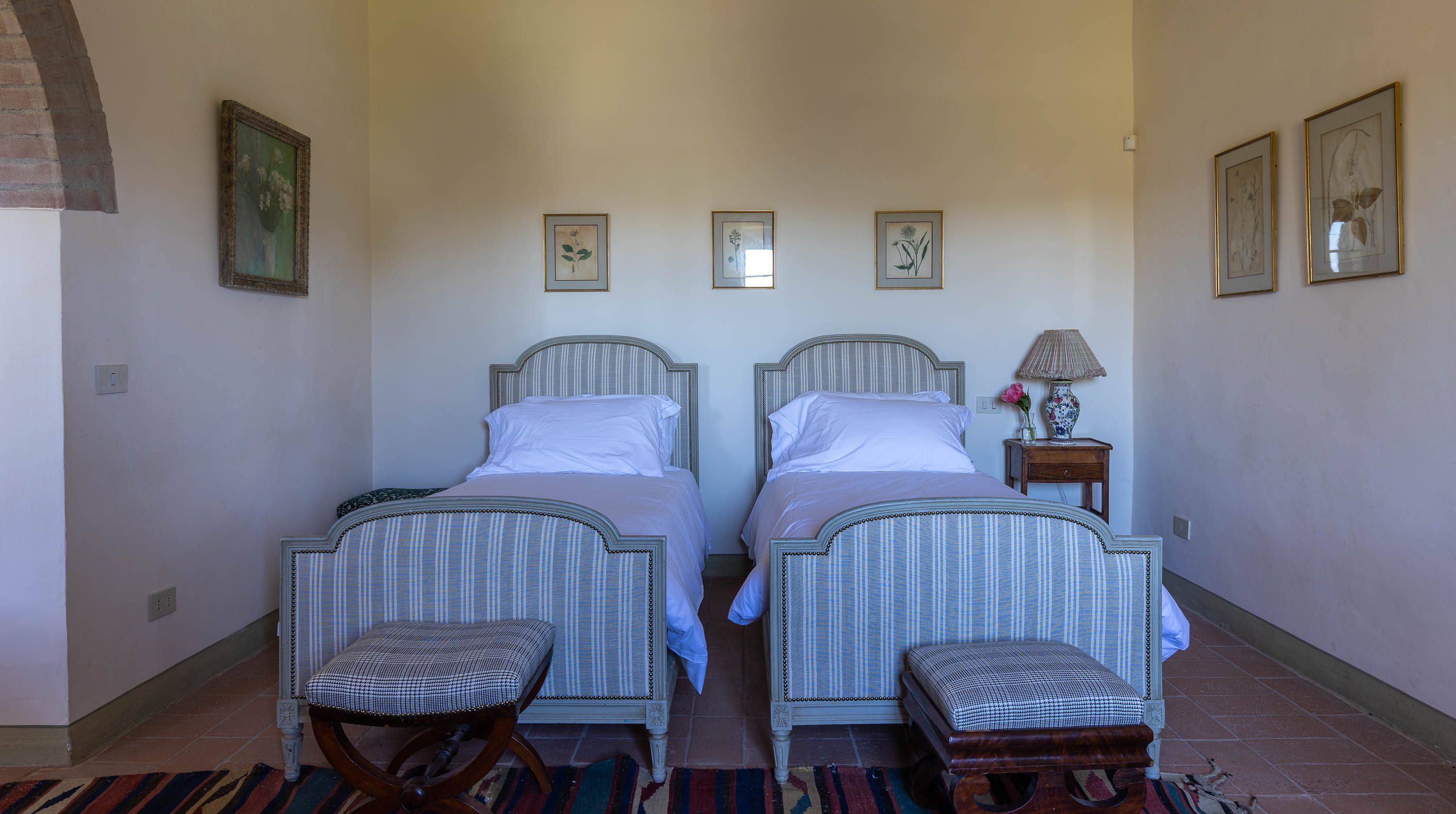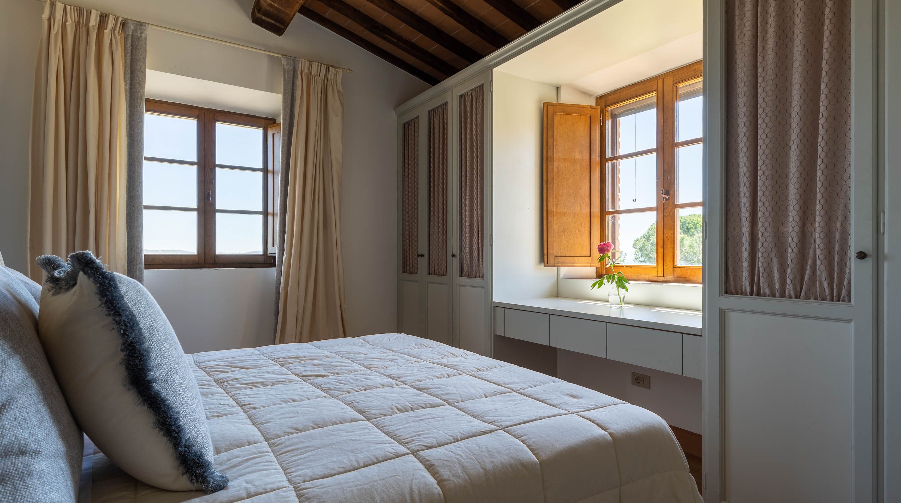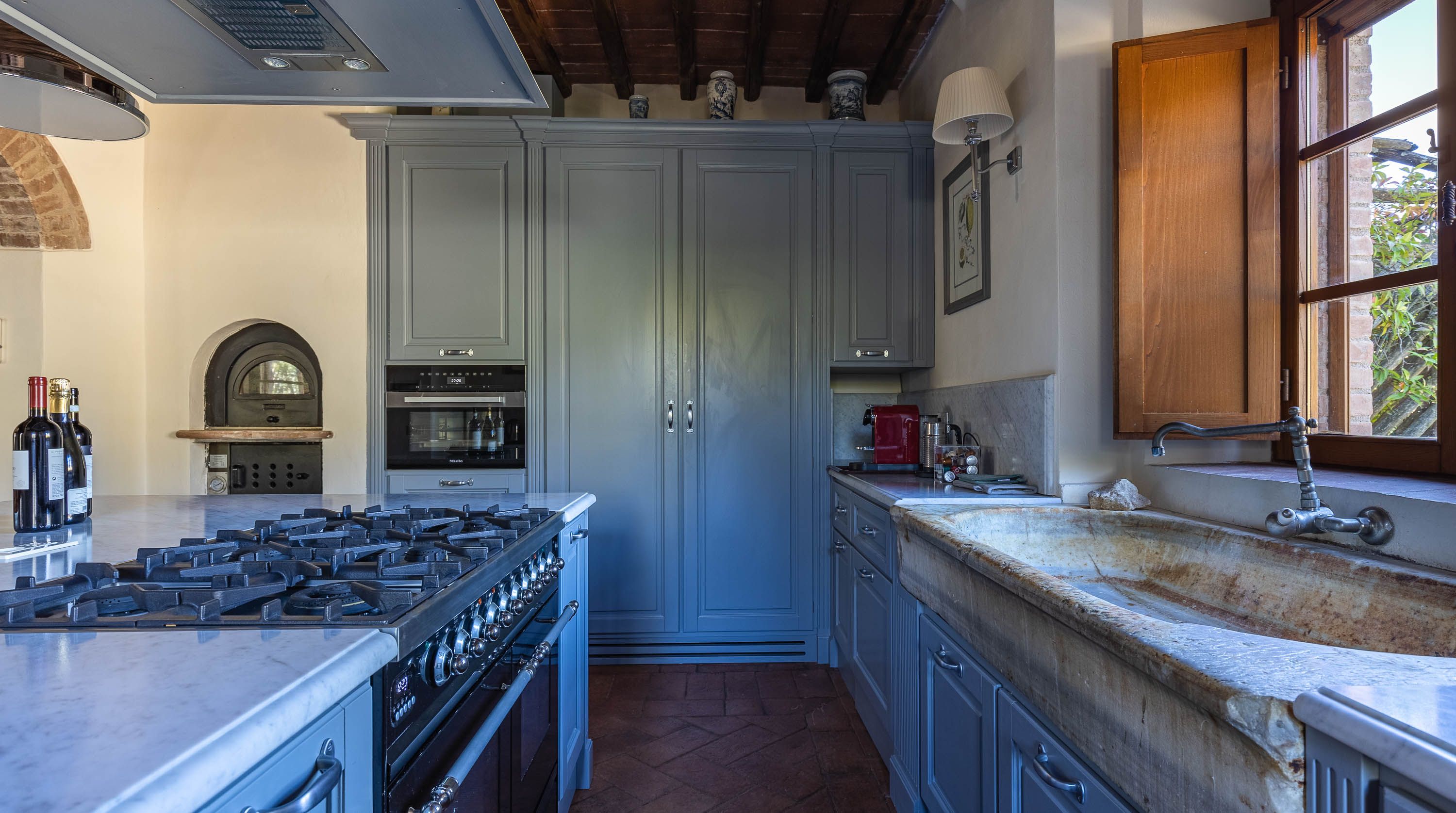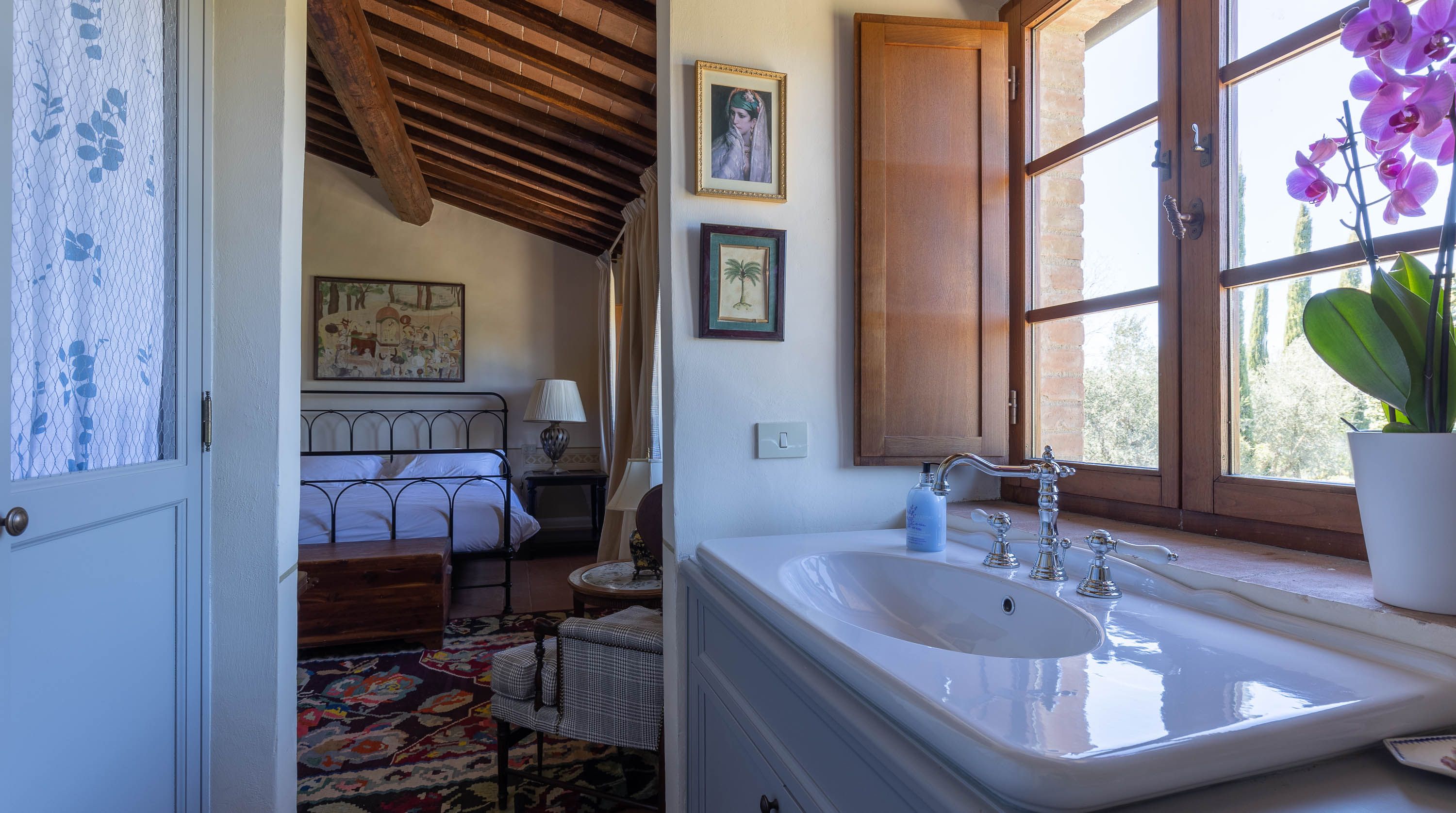 Accessible via an unpaved, cypress-lined road and perched on sloping, vineyard-covered hills, this stylish stone villa is Tuscany at its best. Whether you’re here for an intimate wedding or a big family holiday, the place will set your heart pounding. The interiors have preserved the grace of earlier ages while adding the essential modern cons and amenities. Exposed wood beam ceilings, tiled floors covered with vibrant carpets, and gorgeous vintage furniture make you feel at home, yet so far away from the current era. The master bedroom comes with a four-poster bed, and overall, all sleeping quarters exude a pampering feel accentuated by the gorgeous period furniture. We love the huge dining room, the walls of which are lined with well-stocked bookshelves. After a hearty meal, grab a book, amble outside to the sundeck and lose yourself in another world. When the warmth overwhelms you, take a cooling dip in the massive pool. In the evening you can savour wine and antipasti on the veranda or under the vine-wrapped pergola. If you get the itch to explore, a thirty-minute drive will take you to Siena where you can enjoy dining, shopping and sightseeing.